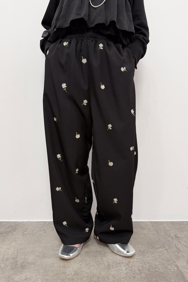 STYLING ランダムに散りばめられた小花刺繍が印象的なワイドパンツ。落ち感のあるとろみ素材で、動くたびに柔らかく揺れるシルエットが上品な印象を与えます。ウエストは総ゴム仕様でリラクシーな穿き心地ながら、センタープレス風のラインで脚長効果も。シンプルなトップスを合わせるだけで、華やかで洗練された雰囲気に仕上がるアイテムです。 商品ポイント ・小花刺繍がさりげなくアクセントになり、フェミニンな印象を演出 ・落ち感のあるワイドシルエットで体のラインを拾わずスタイルカバー ・ウエストゴム仕様で快適な穿き心地 ・軽やかな素材感でオールシーズン活躍 ・Tシャツ、ブラウス、スウェットなど幅広いトップスと好相性 スタイリング提案 一枚で華やぐ、ゆるさと上品さを両立したパンツ。 ・Tシャツ×パンプス:抜け感のあるカジュアルフェミニンに ・スウェット×シルバーシューズ:甘さを抑えたモードカジュアル ・ブラウス合わせ:上品な印象でオフィスカジュアルにも対応 ・ショート丈トップスやインスタイル:ウエスト位置を高く見せて脚長効果◎ ・軽めのアウターと合わせれば季節の変わり目にも重宝 おすすめしたい方 ・ラクな穿き心地と華やかさを両立したい方 ・体型カバーできるきれいめパンツをお探しの方 ・無地ボトムに飽きた方 ・ナチュラルかつ上品なデザインを好む方 <SIZE>ONE SIZE(フリーサイズ) 着丈100cm 身幅32cm 〈モデルサイズ〉160cm 商品No:345555 ※輸送時による多少の汚れ・シワがある場合がございます。 ※撮影時のライティング、ご覧になっているモニター・PC環境により実際の商品と色味やイメージが異なって見える場合がございます。ご了承の上、お買い求め下さい。 ※商品のお取扱いに関しましては、商品に付属のアテンションカード、洗濯ネームをご覧ください。