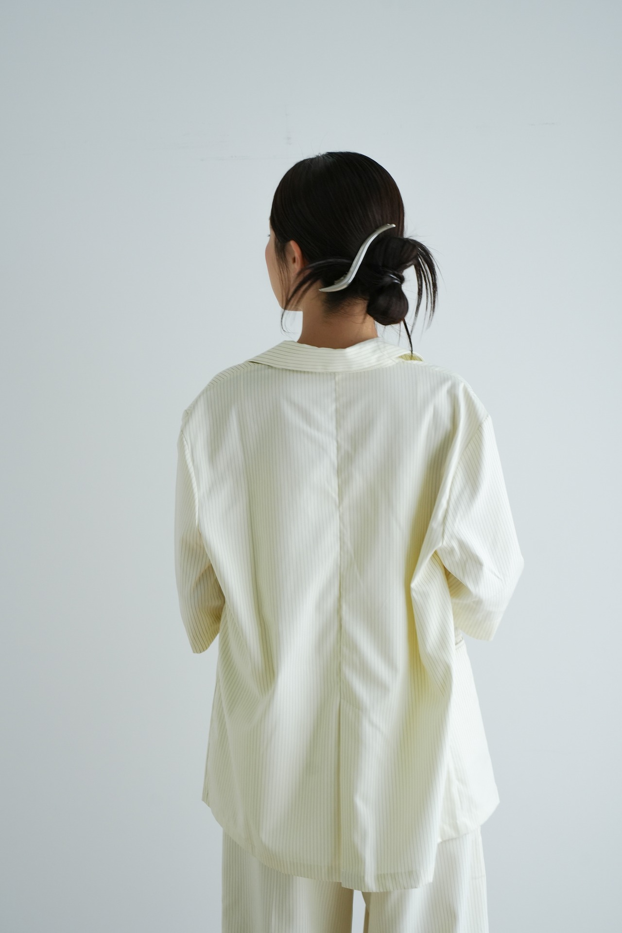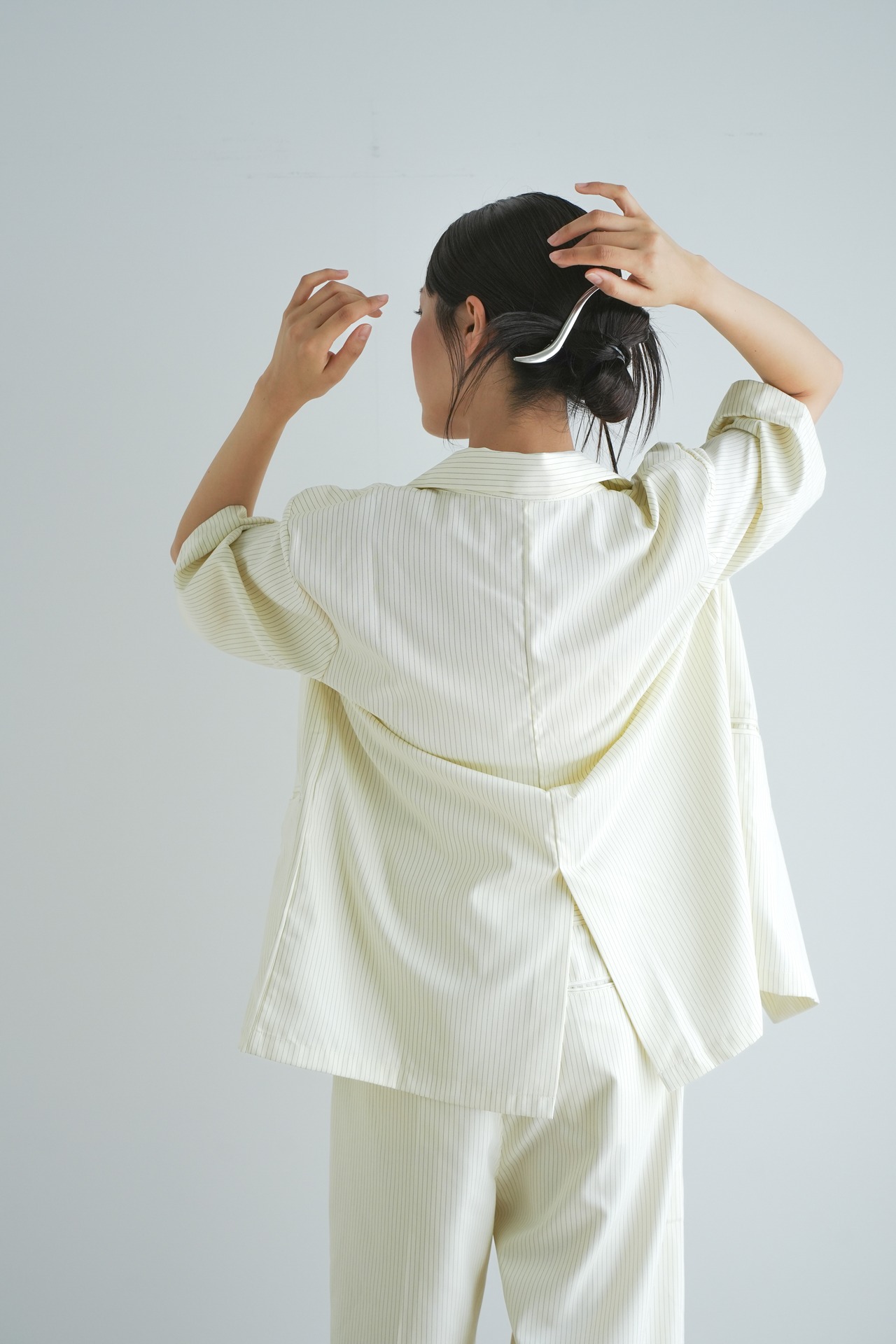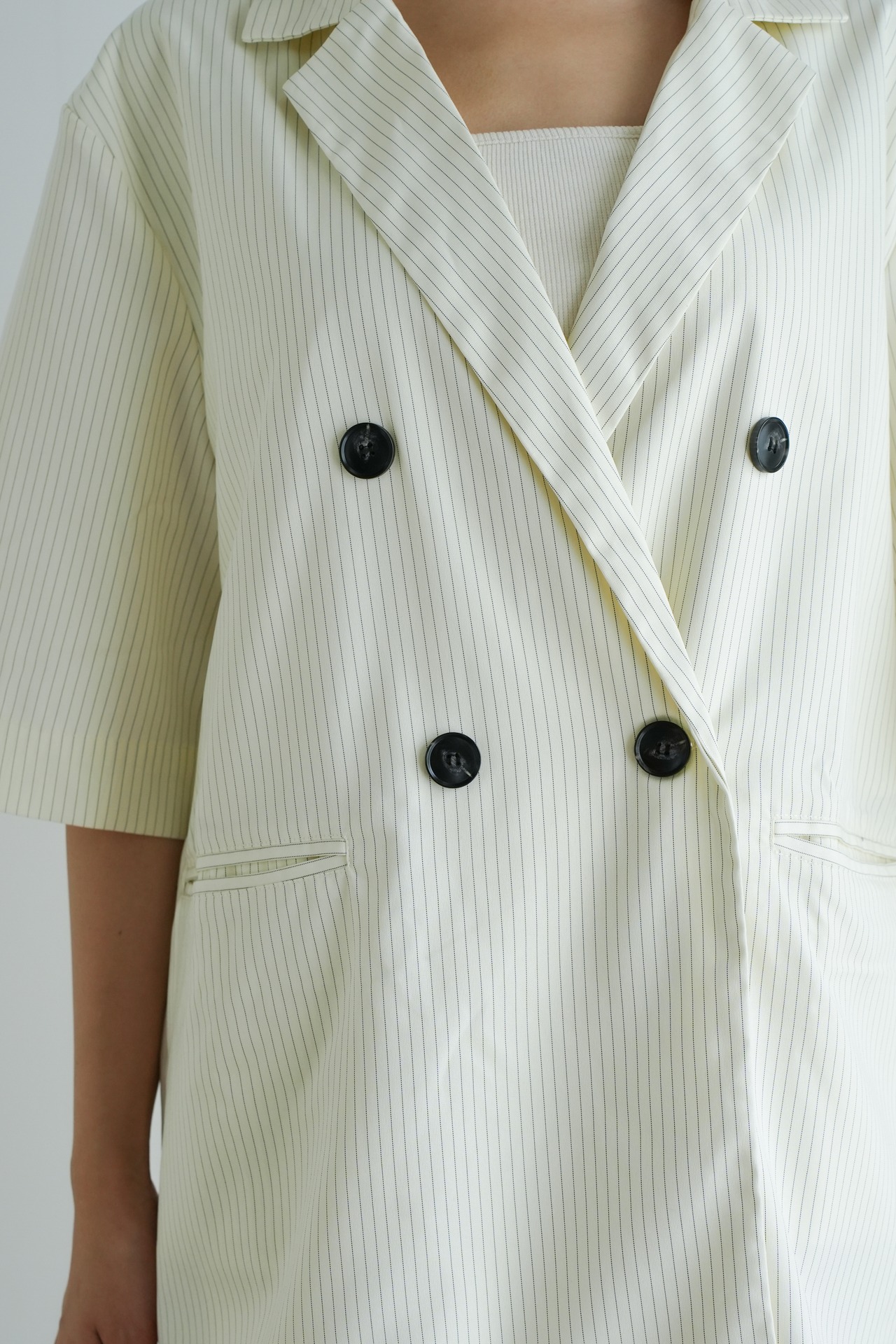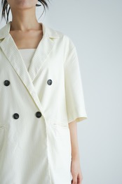 洗練された印象を与えるピンストライプデザインが特徴の半袖ダブルテーラードジャケットです。軽やかな素材感で通気性も良く、春夏のコーディネートに最適。フォーマルからカジュアルまで幅広く対応し、シーンを問わず活躍する一着です。肩周りのラインを美しく見せるフィット感もポイント!