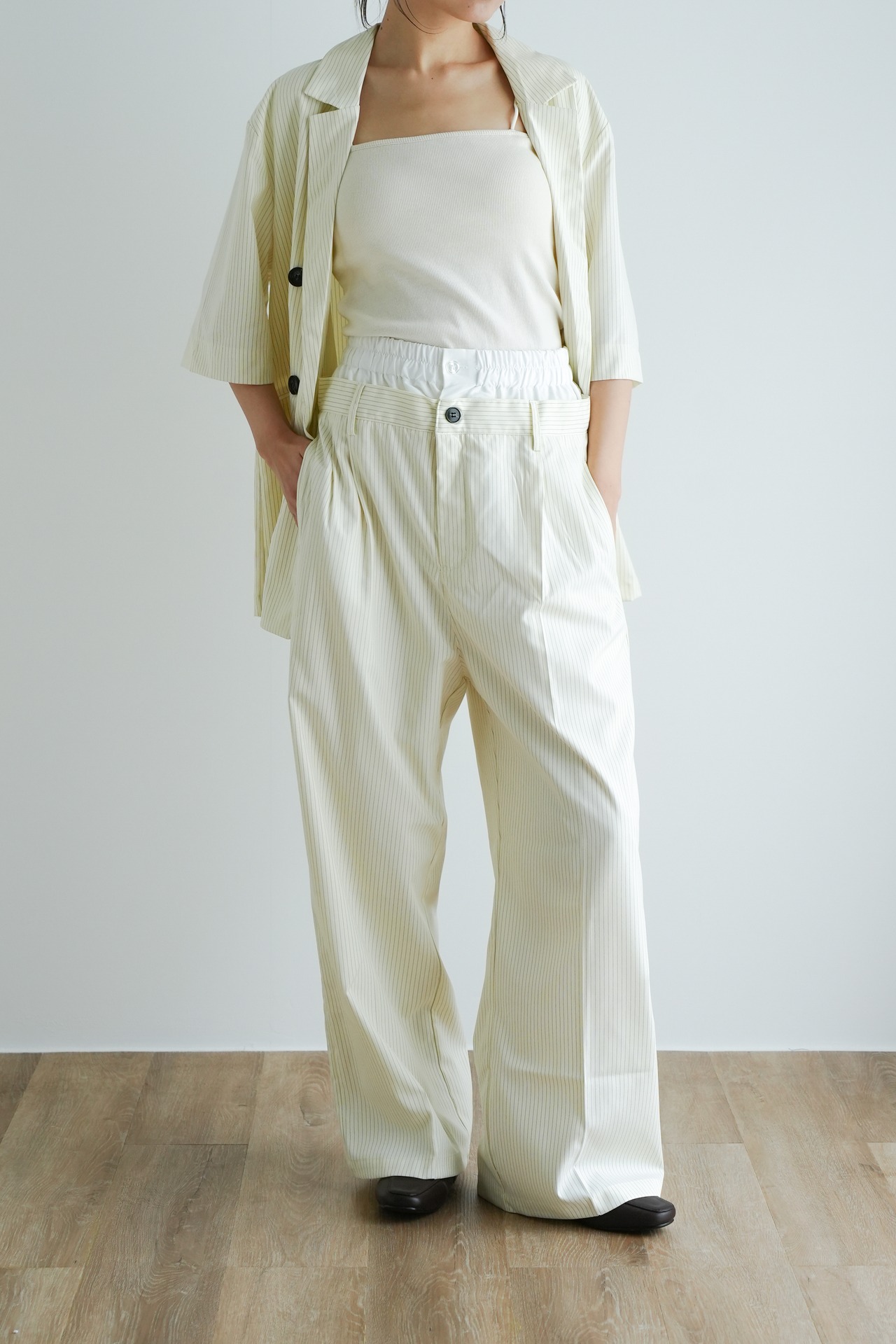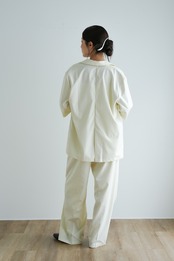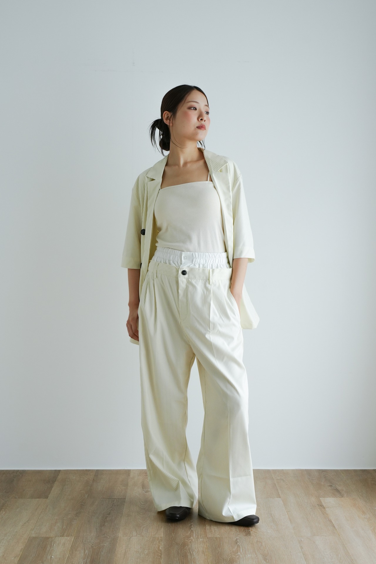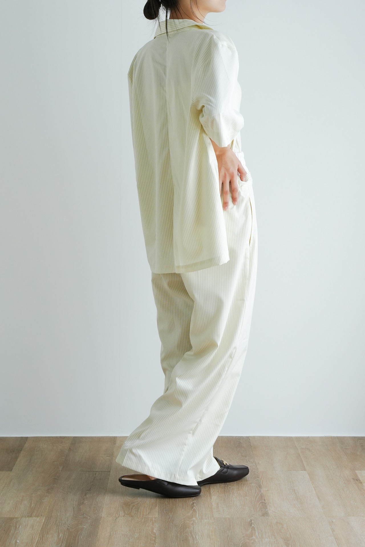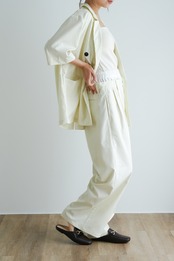 ・オフィスやきちんとした場面では、同系色のスラックスやスカートを合わせてセットアップ風に。