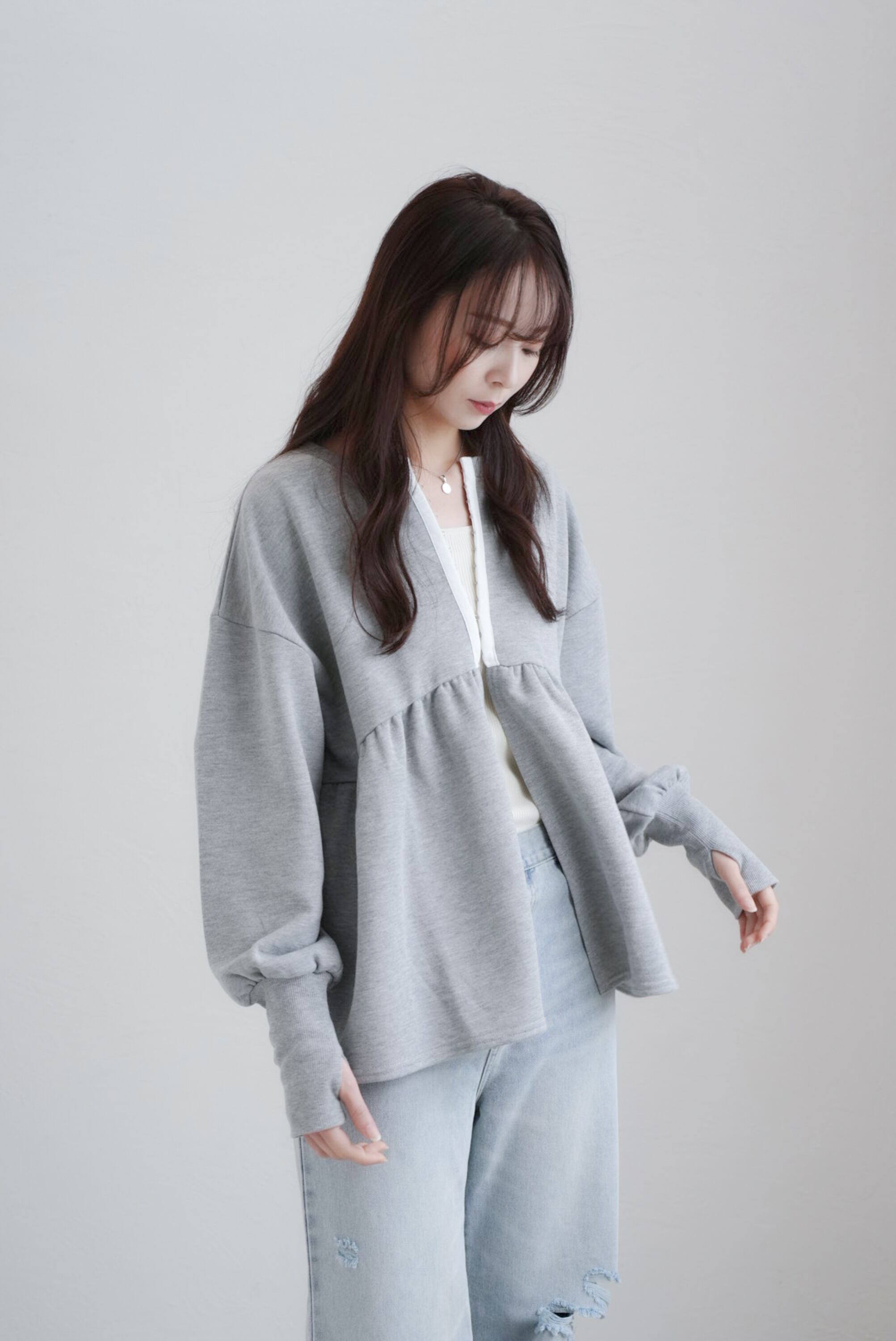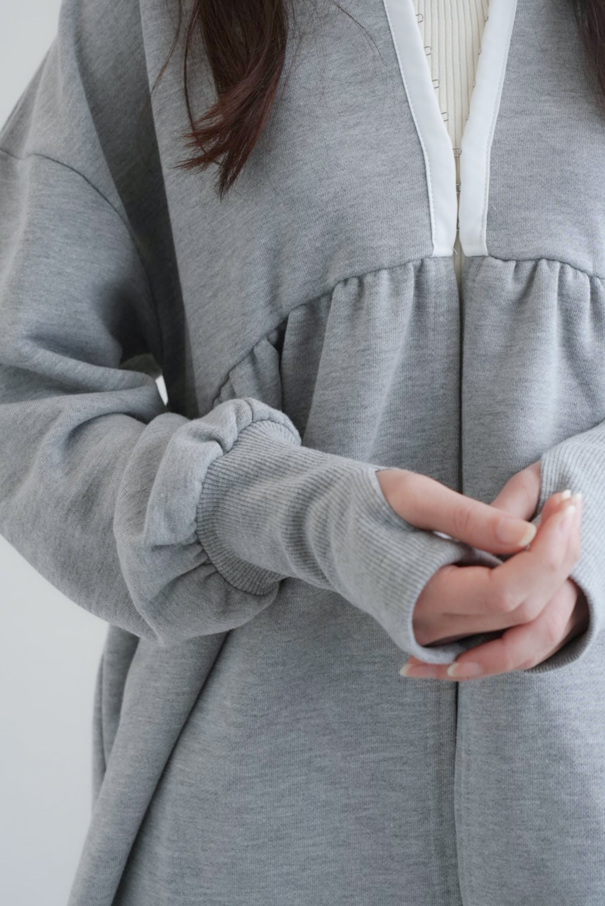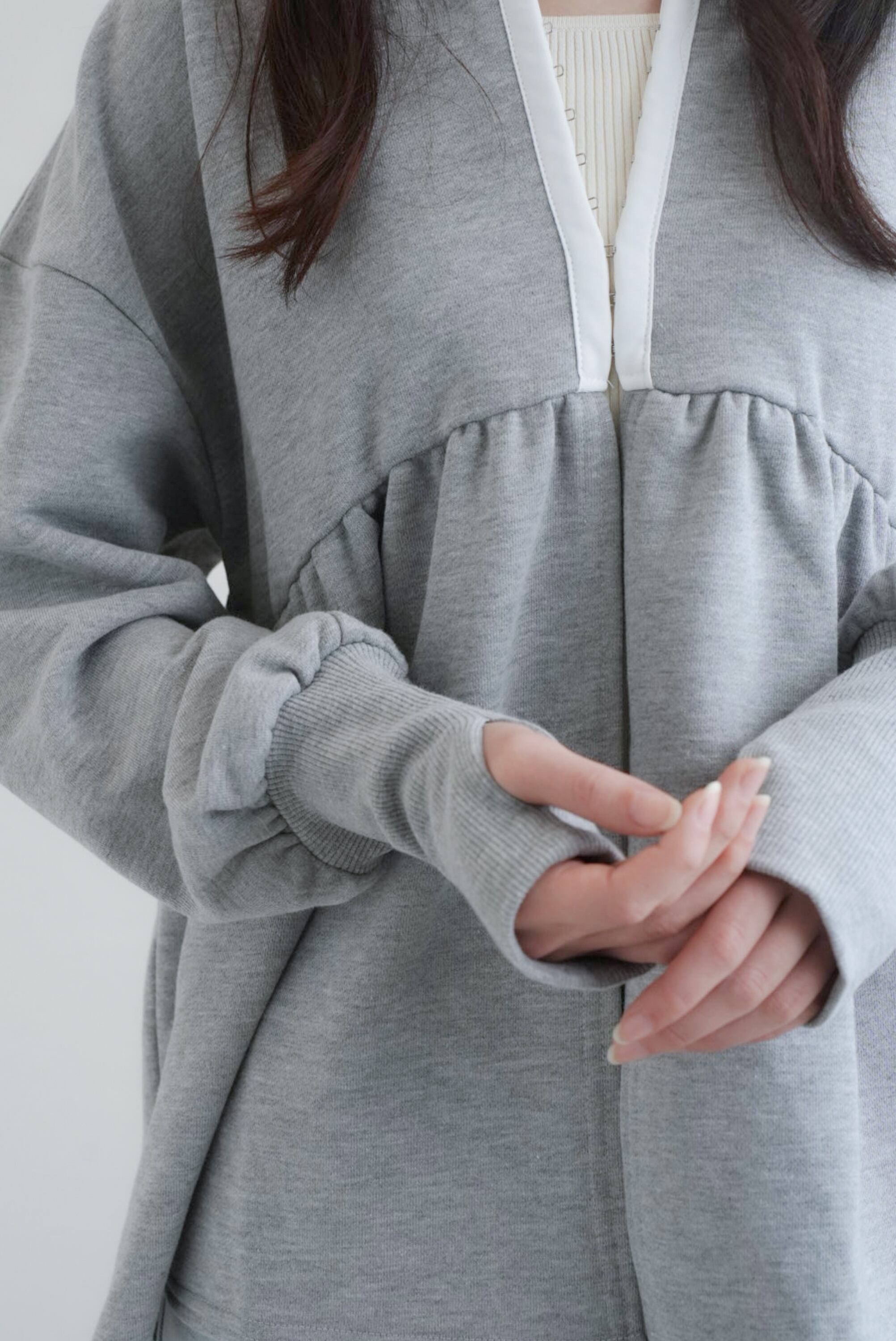 立体感が可愛いギャザーデザインのフィンガーホール付きのスウェットペプラムカーディガン。