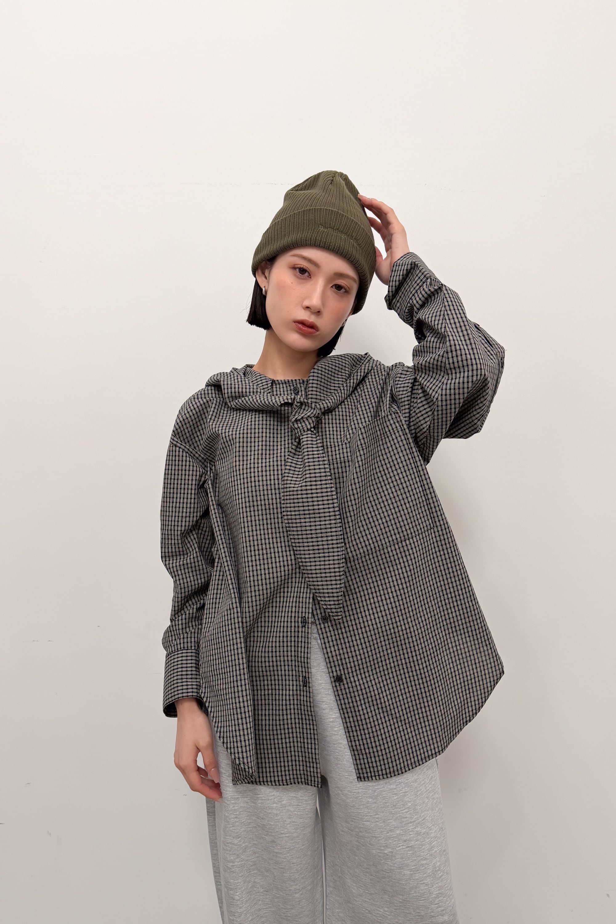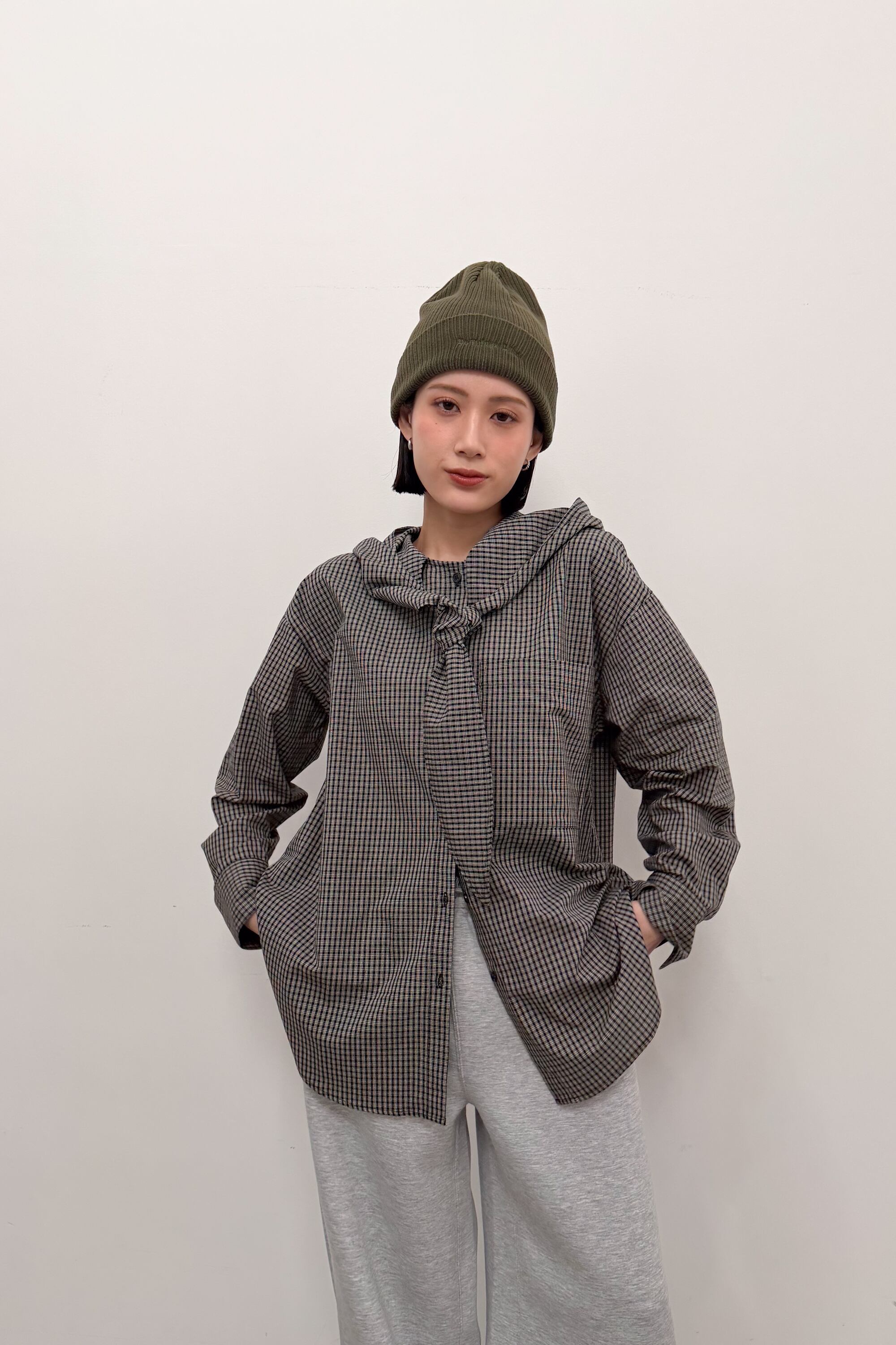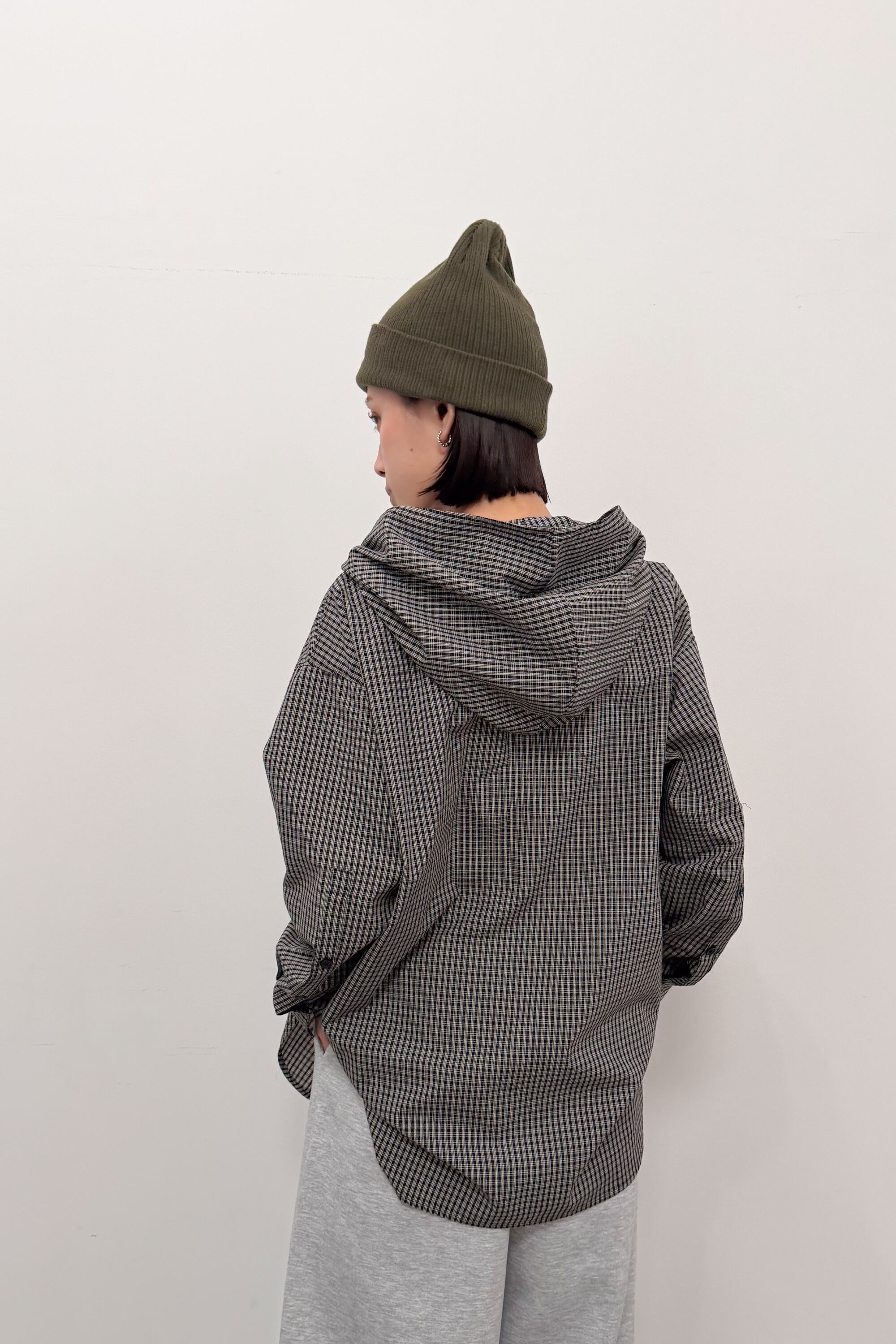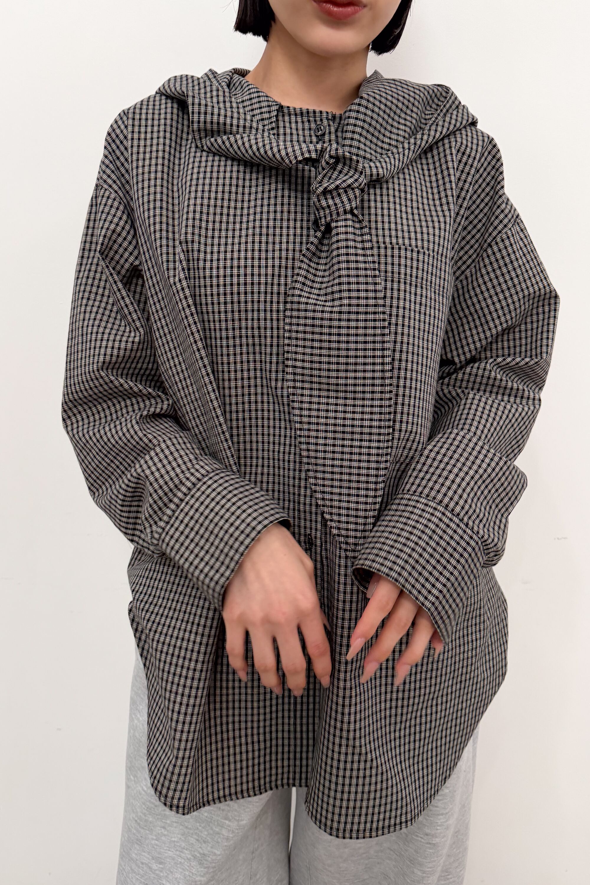 フード付きのチェックシャツに、首元のタイディテールを効かせた“ひとクセ”デザイン。シャツのきちんと感とフードのラフさが混ざり合って、合わせるだけでこなれたバランスに仕上がります。ゆったりめのシルエットとヒップまで隠れる丈感で、体のラインを拾いにくいのも嬉しいポイント。前を閉じてトップスとしても、ボタンを開けて羽織りとしても使えて、季節のつなぎにも頼れる一枚です。