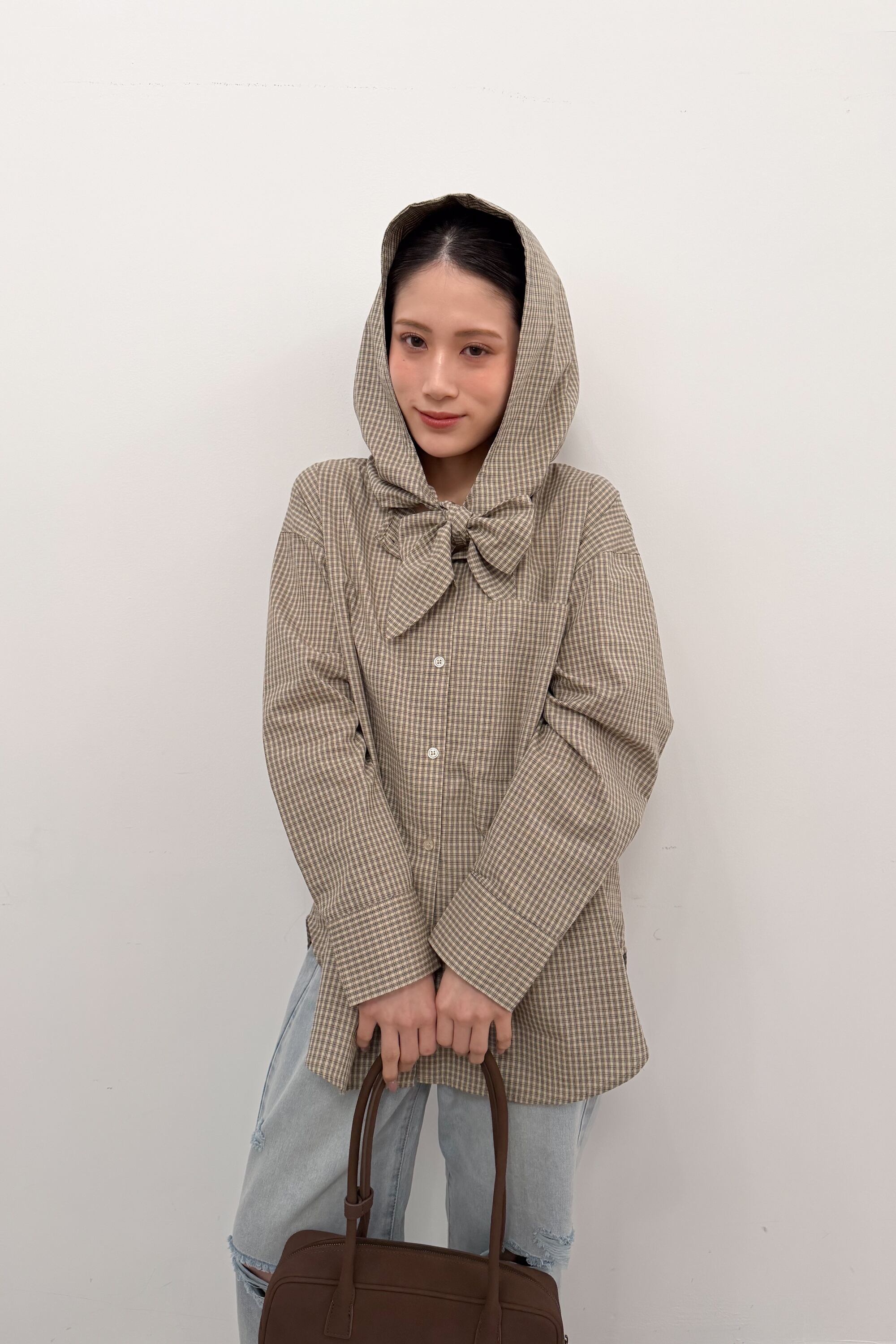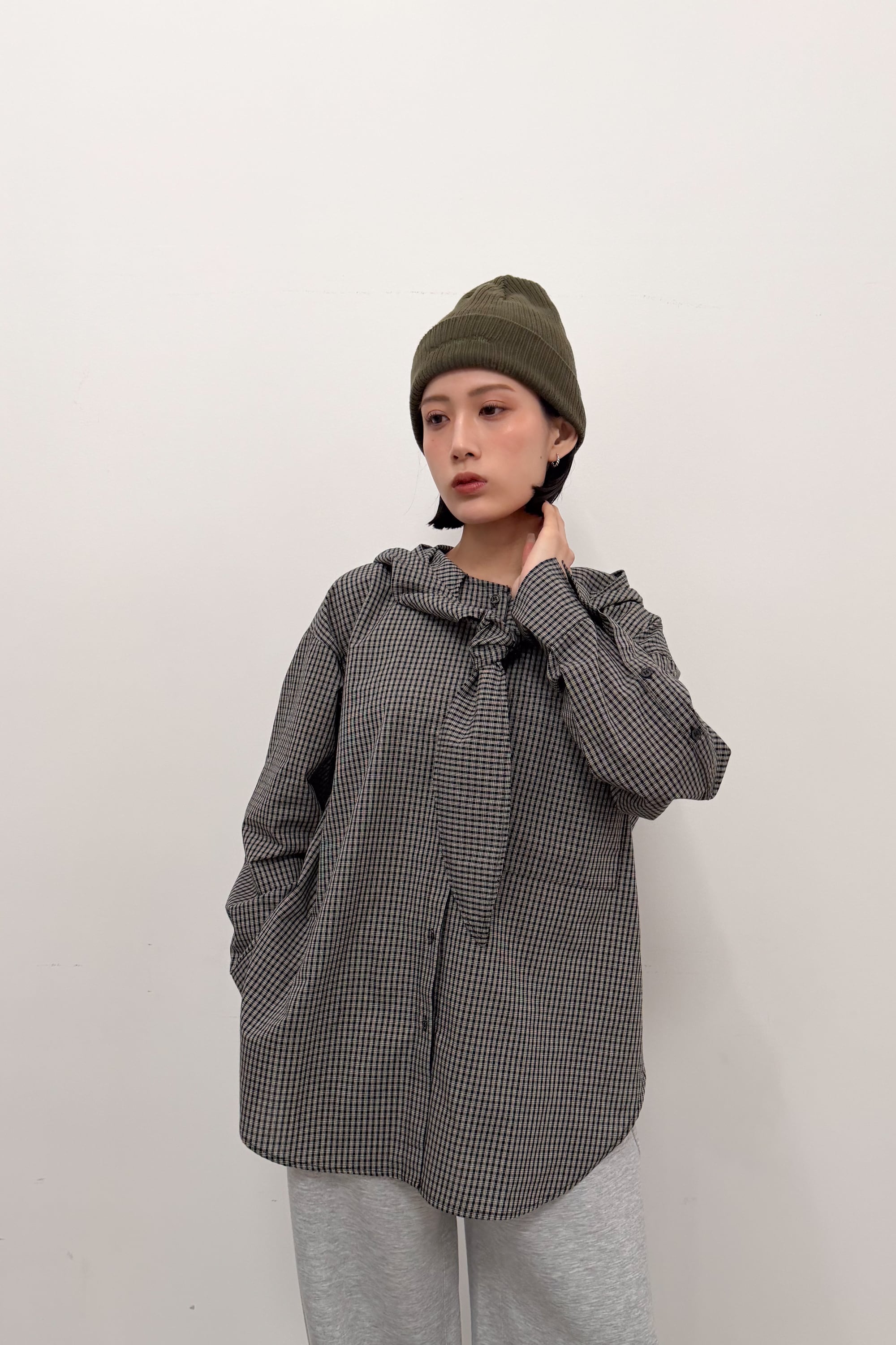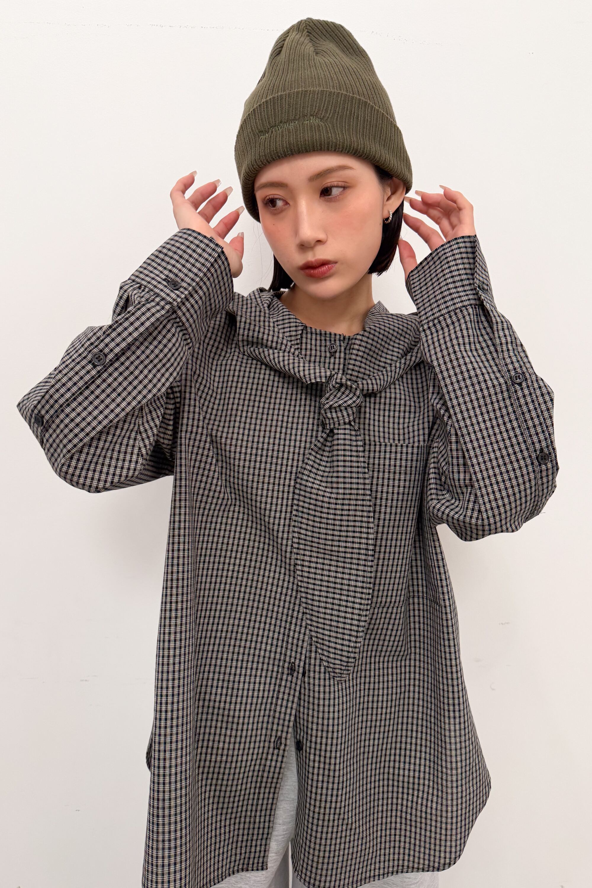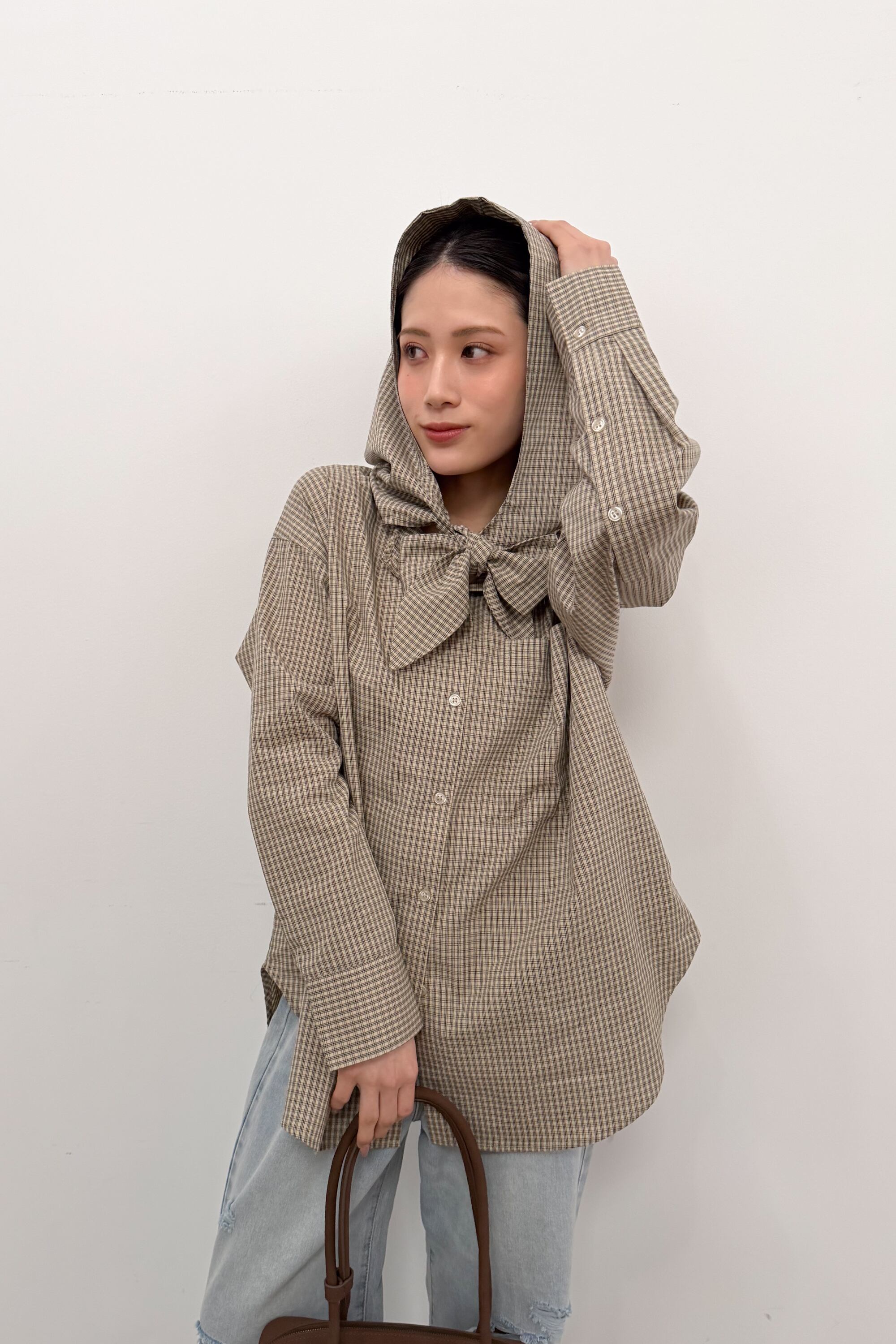 フード付きのチェックシャツに、首元のタイディテールを効かせた“ひとクセ”デザイン。シャツのきちんと感とフードのラフさが混ざり合って、合わせるだけでこなれたバランスに仕上がります。ゆったりめのシルエットとヒップまで隠れる丈感で、体のラインを拾いにくいのも嬉しいポイント。前を閉じてトップスとしても、ボタンを開けて羽織りとしても使えて、季節のつなぎにも頼れる一枚です。