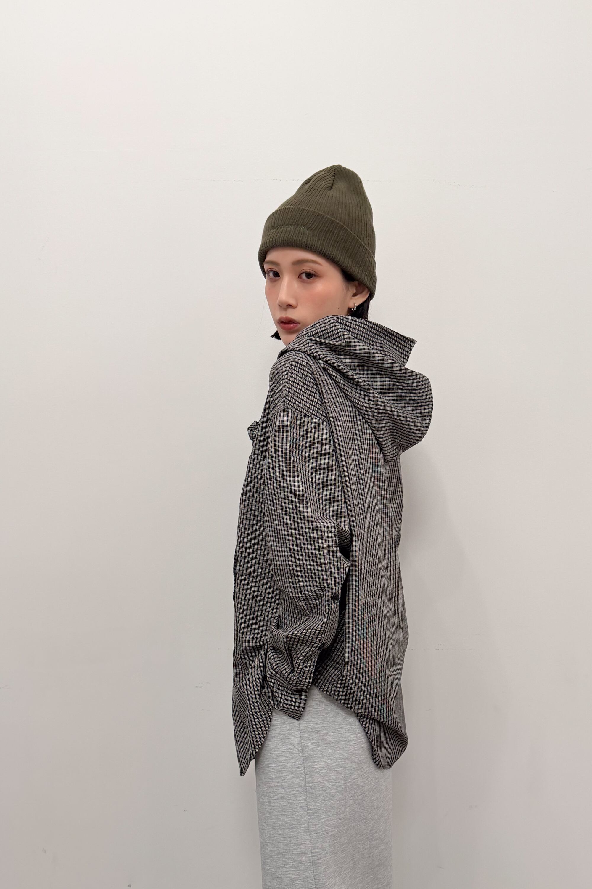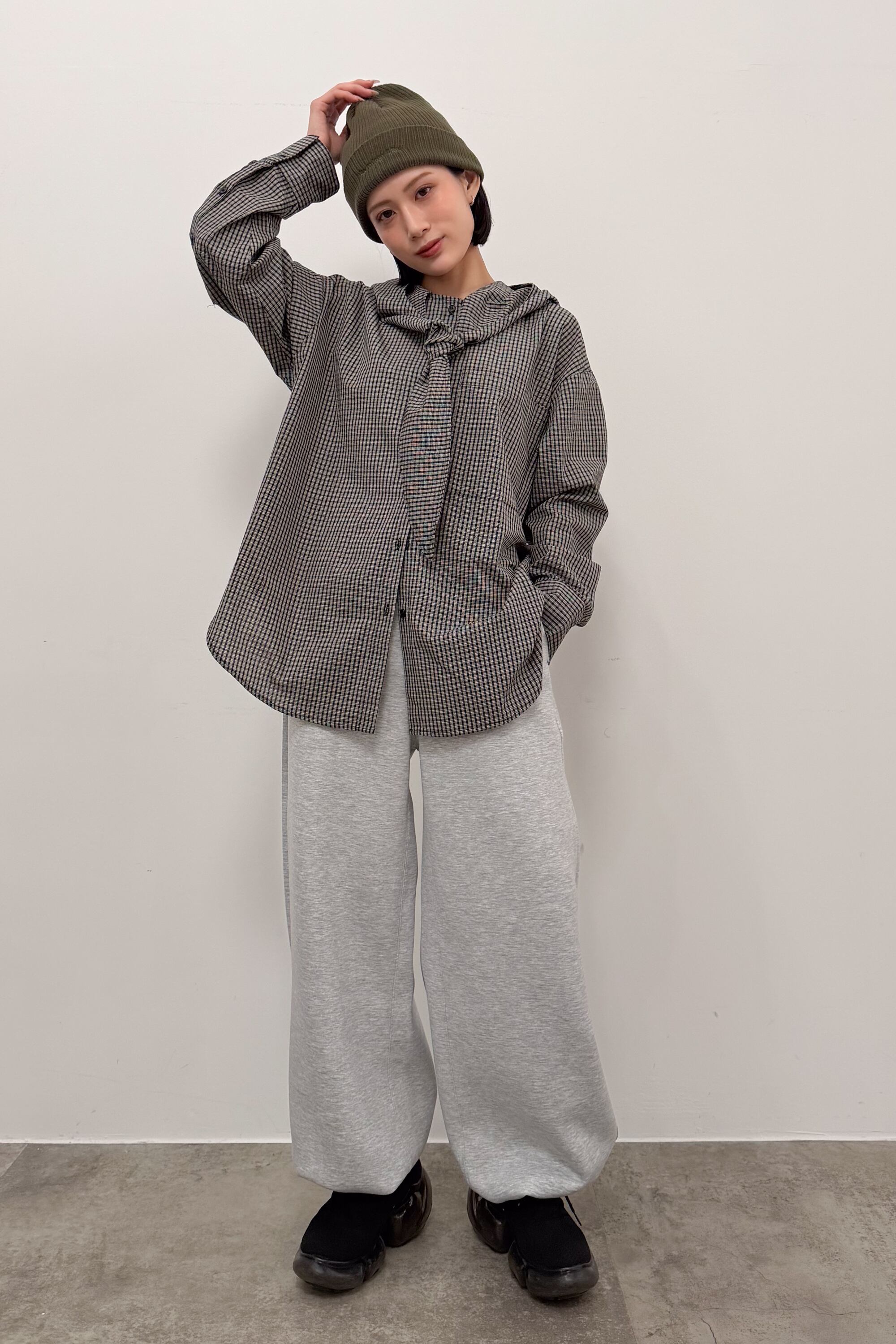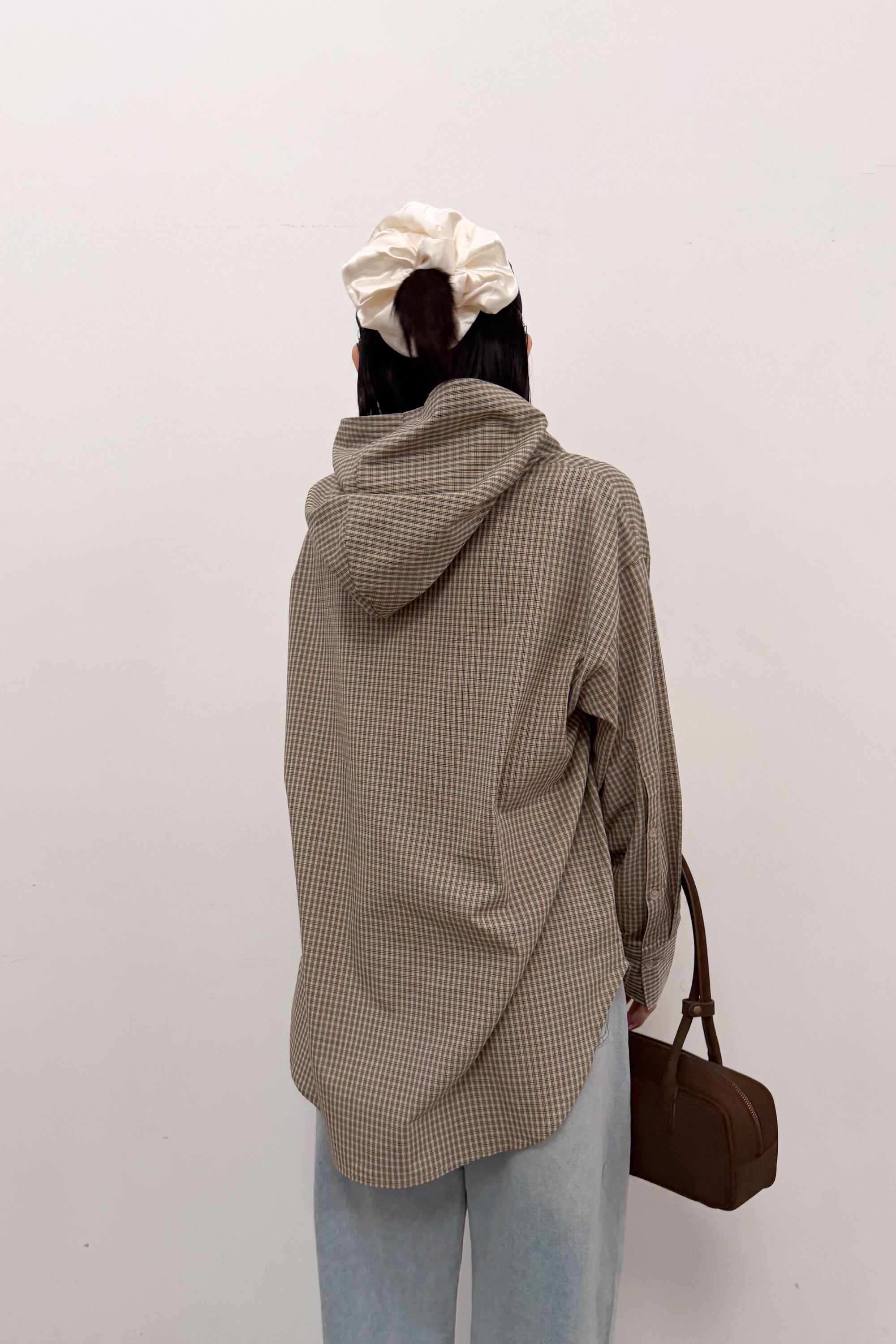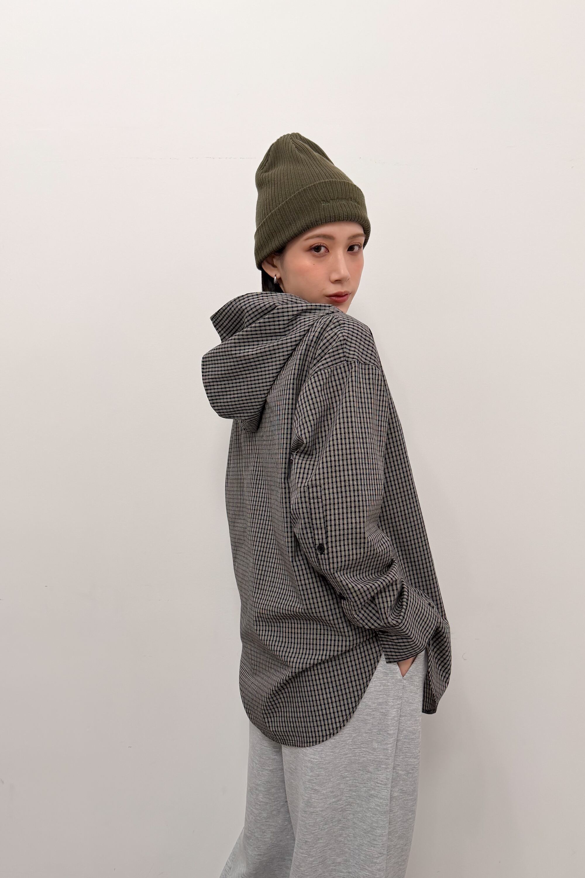 フード付きのチェックシャツに、首元のタイディテールを効かせた“ひとクセ”デザイン。シャツのきちんと感とフードのラフさが混ざり合って、合わせるだけでこなれたバランスに仕上がります。ゆったりめのシルエットとヒップまで隠れる丈感で、体のラインを拾いにくいのも嬉しいポイント。前を閉じてトップスとしても、ボタンを開けて羽織りとしても使えて、季節のつなぎにも頼れる一枚です。