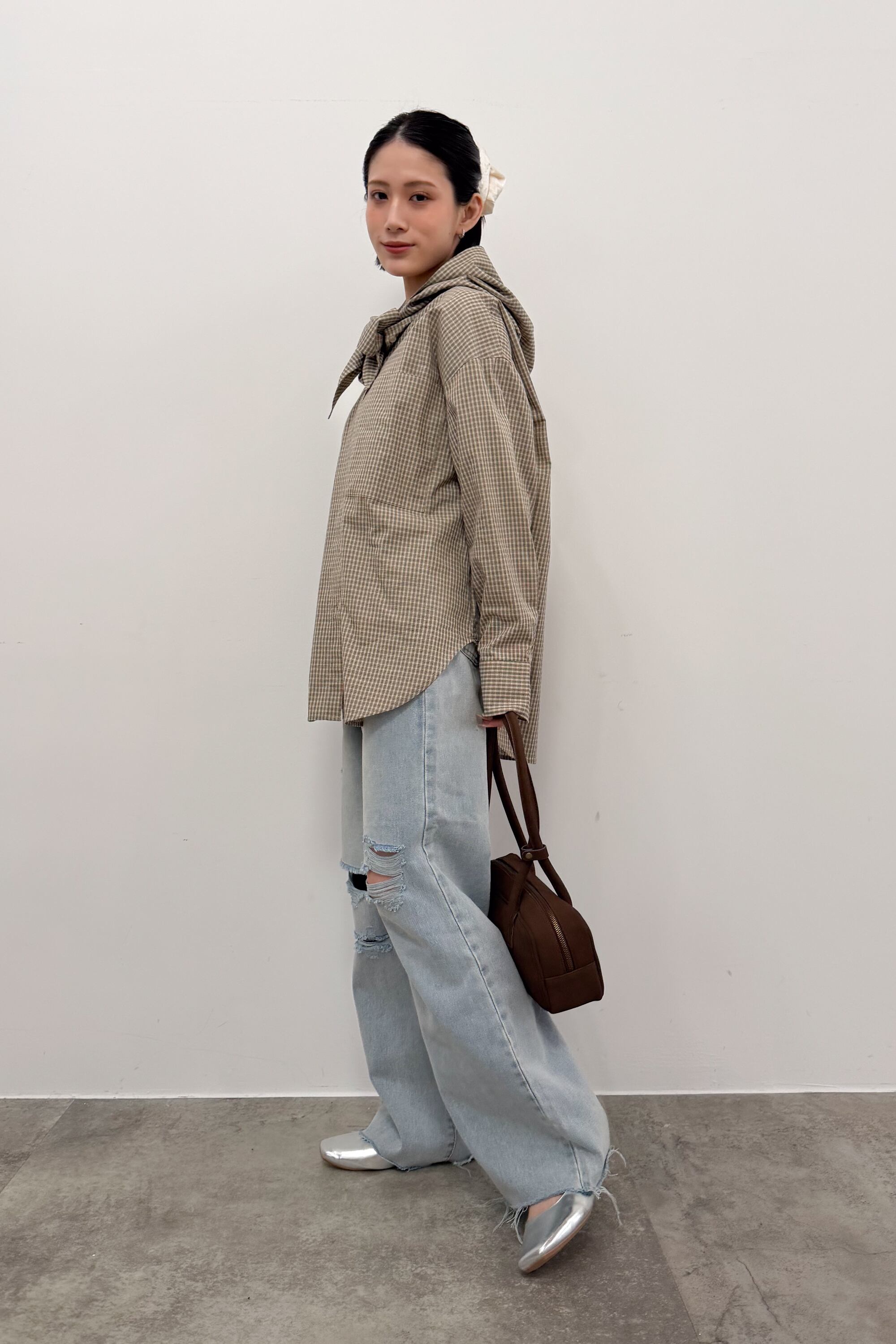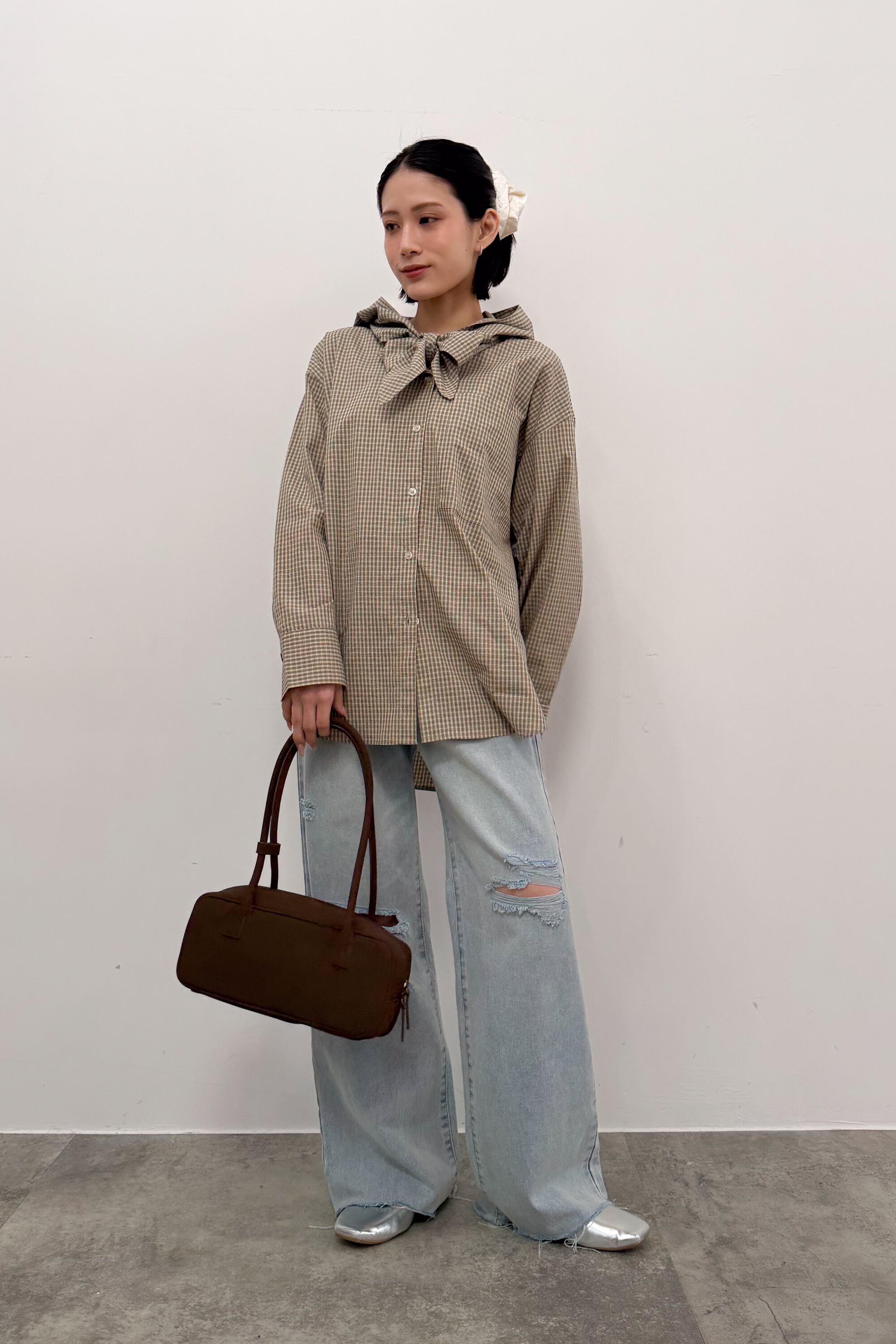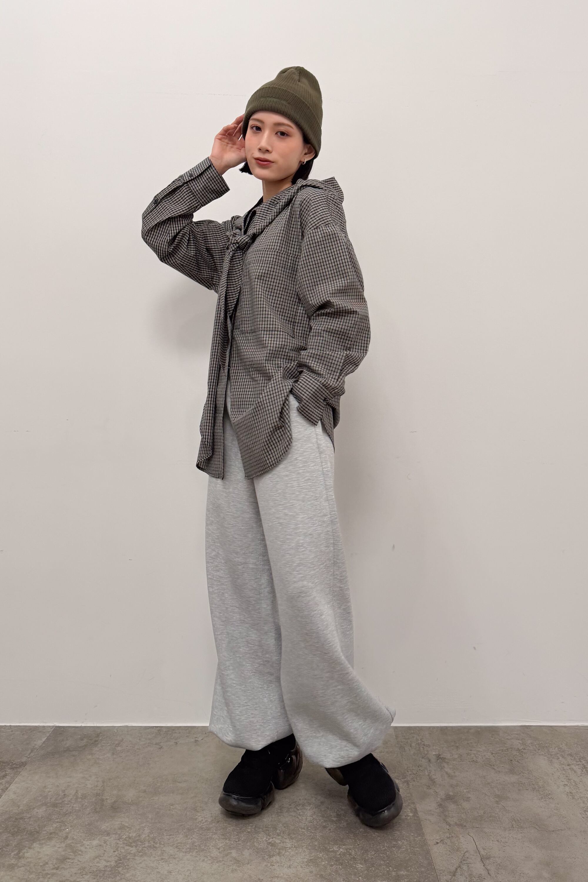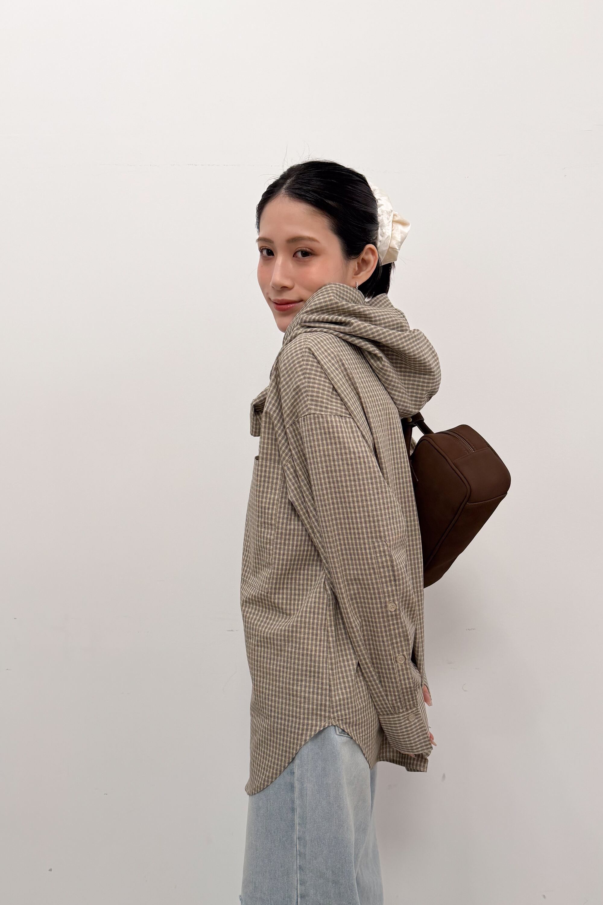 フード付きのチェックシャツに、首元のタイディテールを効かせた“ひとクセ”デザイン。シャツのきちんと感とフードのラフさが混ざり合って、合わせるだけでこなれたバランスに仕上がります。ゆったりめのシルエットとヒップまで隠れる丈感で、体のラインを拾いにくいのも嬉しいポイント。前を閉じてトップスとしても、ボタンを開けて羽織りとしても使えて、季節のつなぎにも頼れる一枚です。