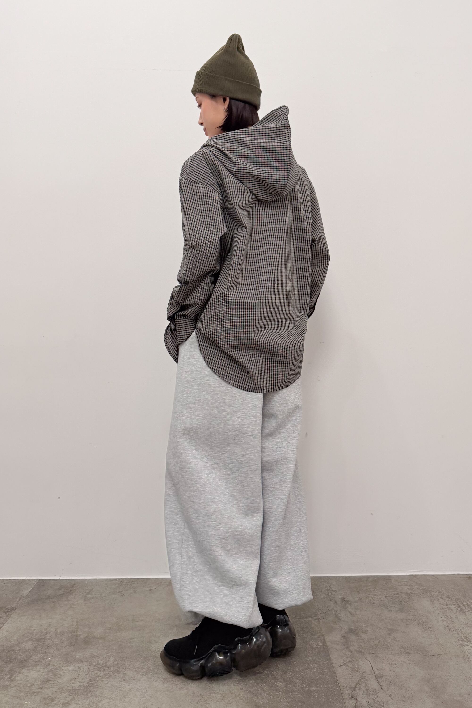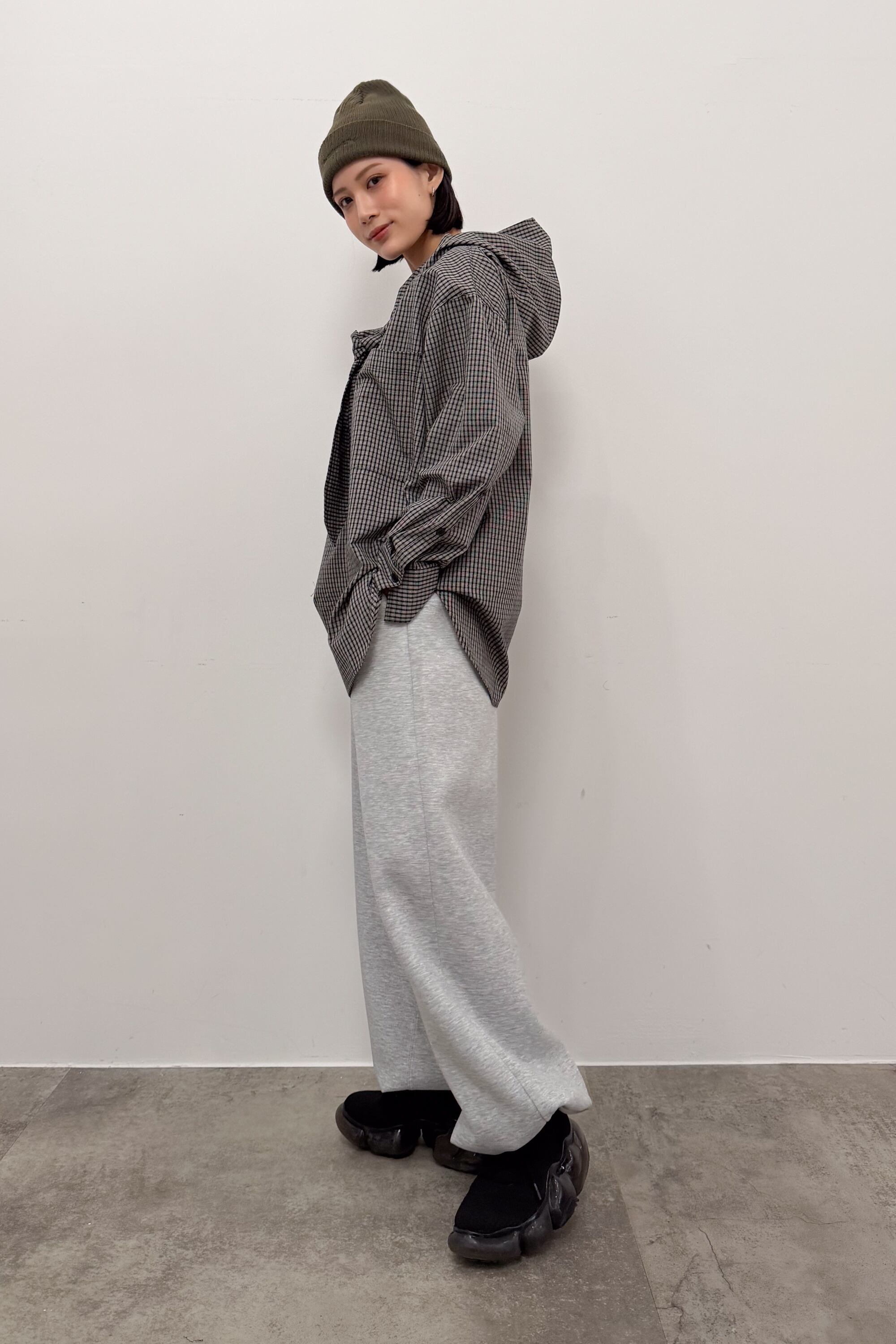 ・フード×チェックの組み合わせで、カジュアルに寄せすぎず洒落感をプラス