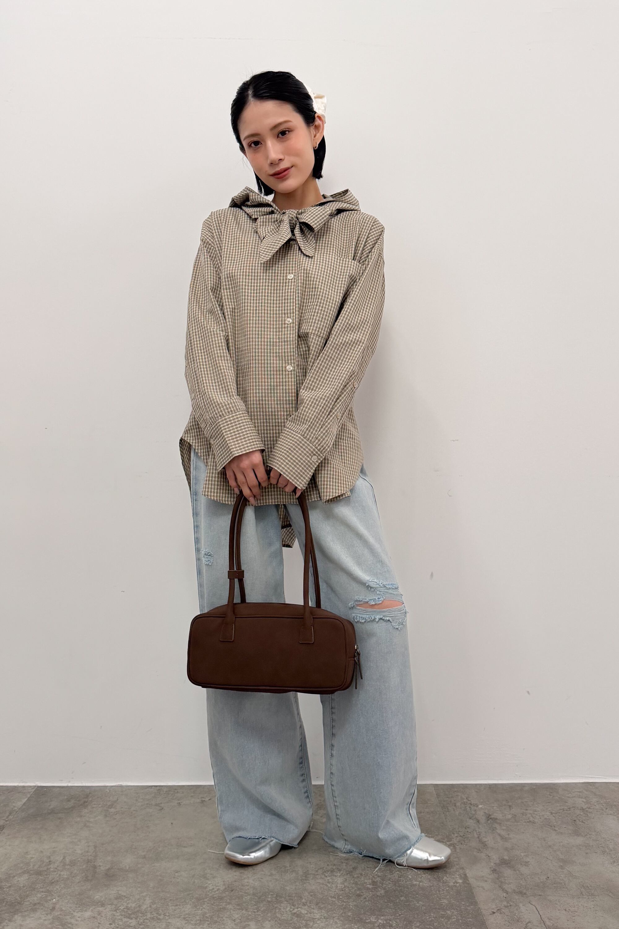 ・デニム/ワイドパンツ:シャツの柄を主役にしてこなれた印象へ