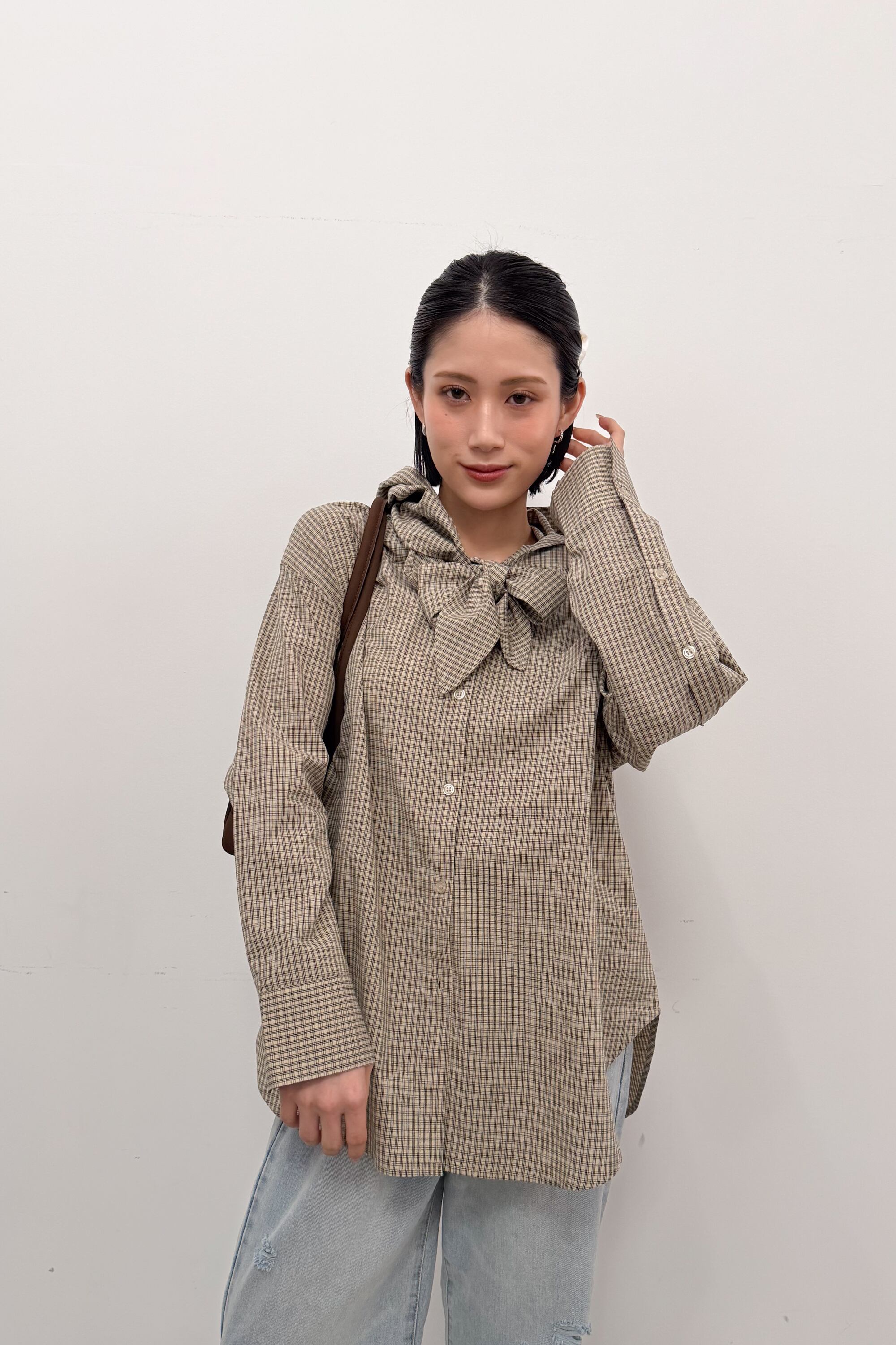 ・首元のタイディテールがアクセントになり、顔まわりに立体感が出るデザイン