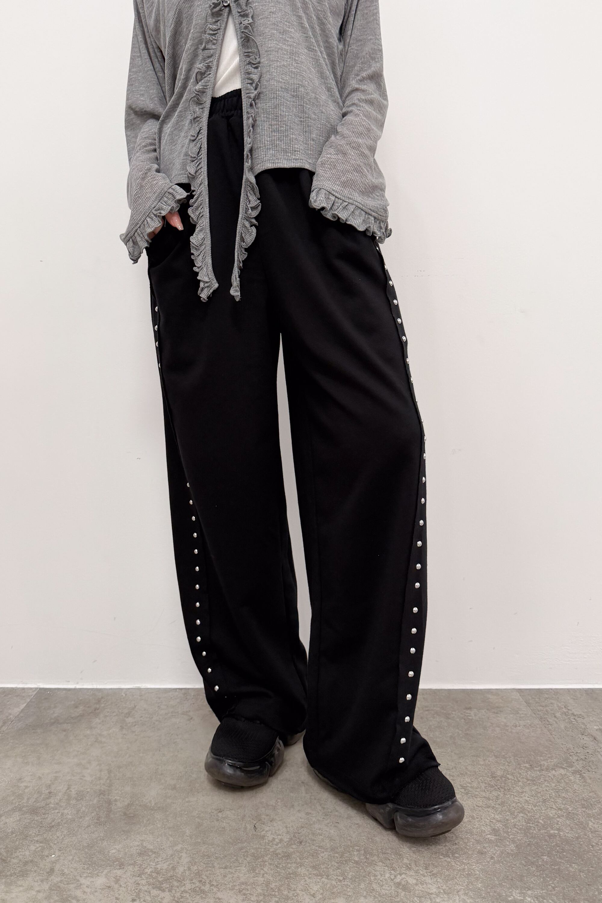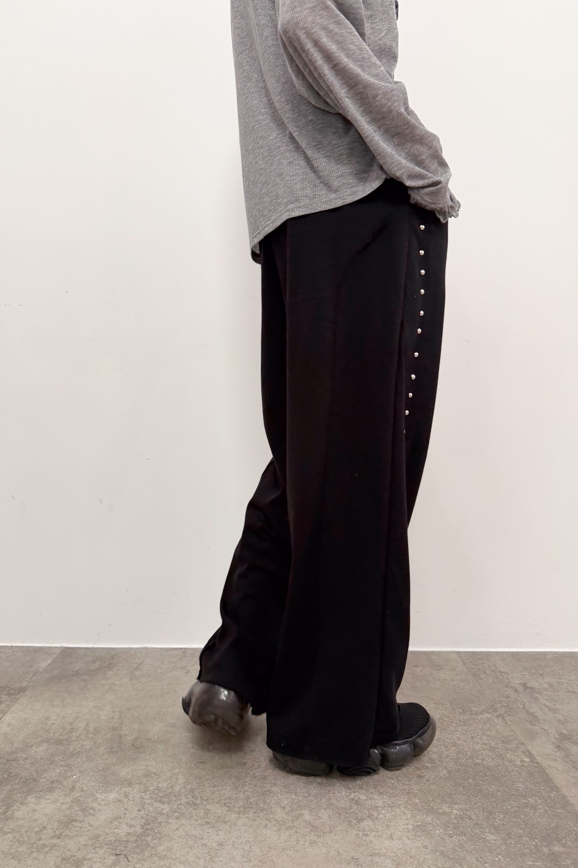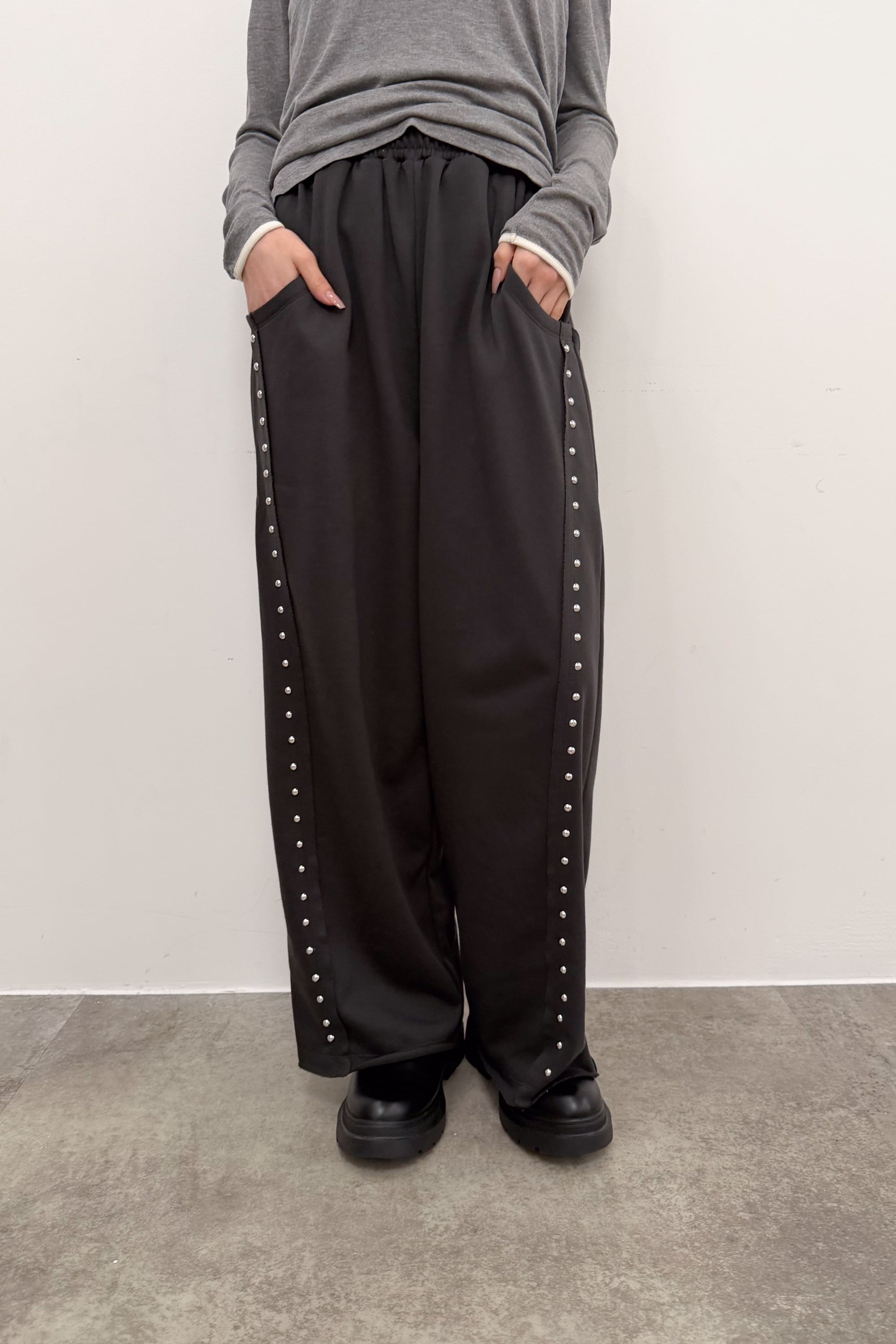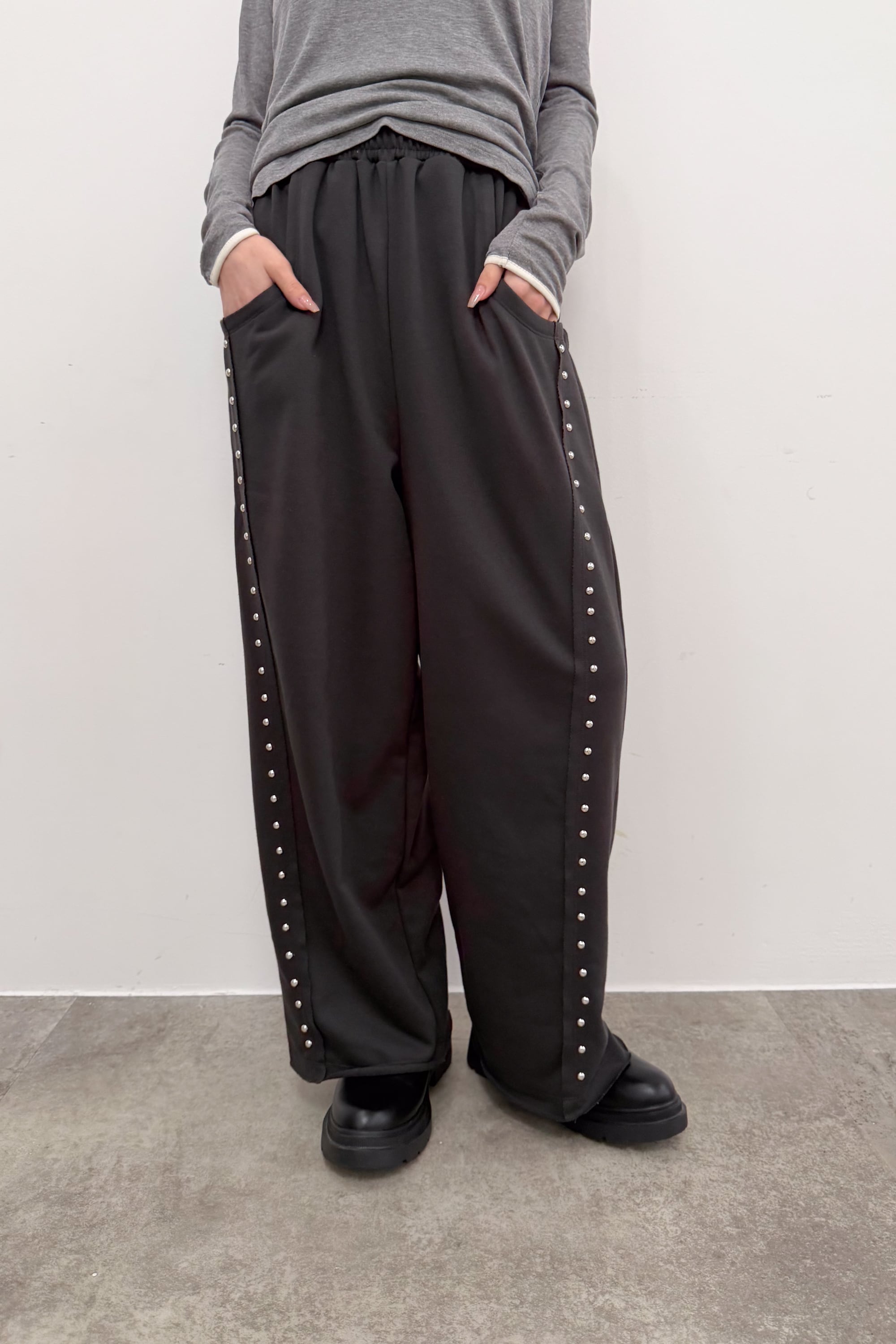 サイドに並ぶスタッズが縦ラインをつくり、シンプルなトップス合わせでも自然と“こなれ感”が出るワイドパンツ。落ち感のある素材が動くたびに表情を出しつつ、ワイドシルエットでもすっきりした印象にまとまります。ウエストはゴム仕様で締め付け感が少なく、ラクに穿けるのにきれい見えするのが魅力。足元はボリュームシューズで重心を作っても、ヒールでシャープに寄せてもバランス良く決まります。