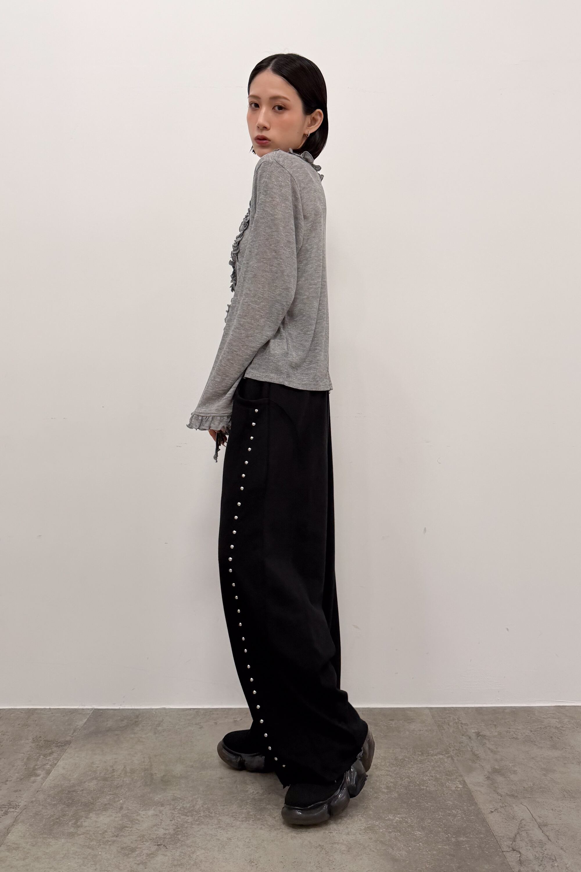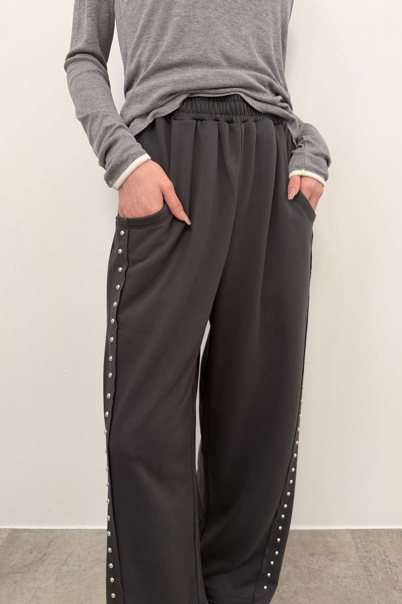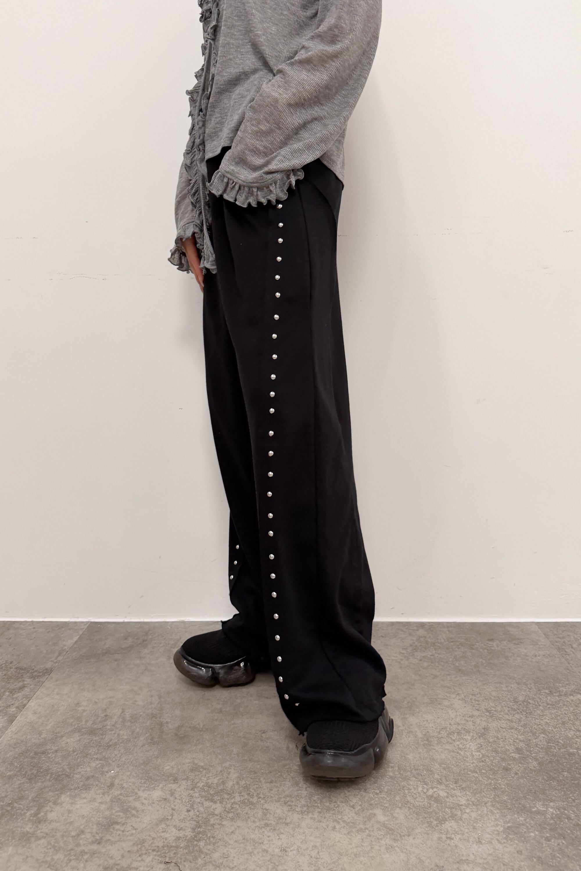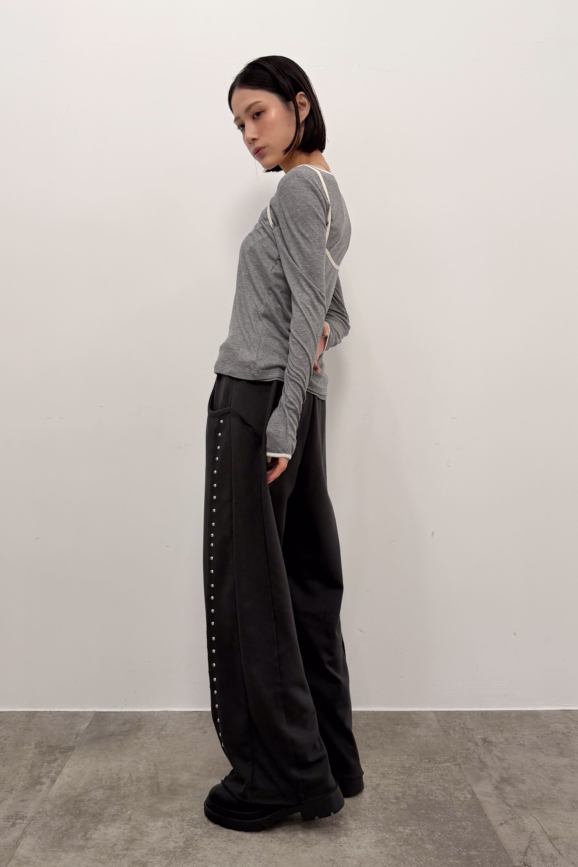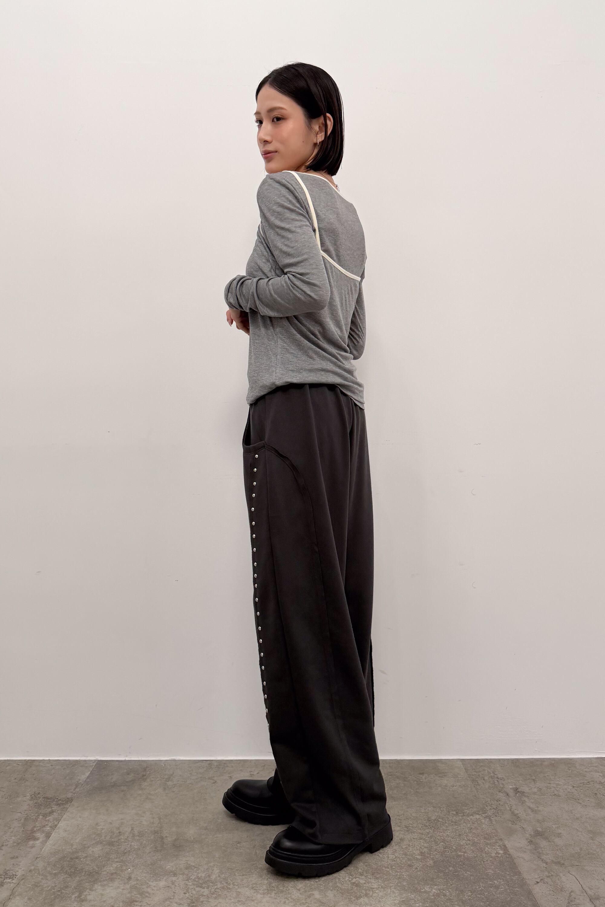 サイドに並ぶスタッズが縦ラインをつくり、シンプルなトップス合わせでも自然と“こなれ感”が出るワイドパンツ。落ち感のある素材が動くたびに表情を出しつつ、ワイドシルエットでもすっきりした印象にまとまります。ウエストはゴム仕様で締め付け感が少なく、ラクに穿けるのにきれい見えするのが魅力。足元はボリュームシューズで重心を作っても、ヒールでシャープに寄せてもバランス良く決まります。