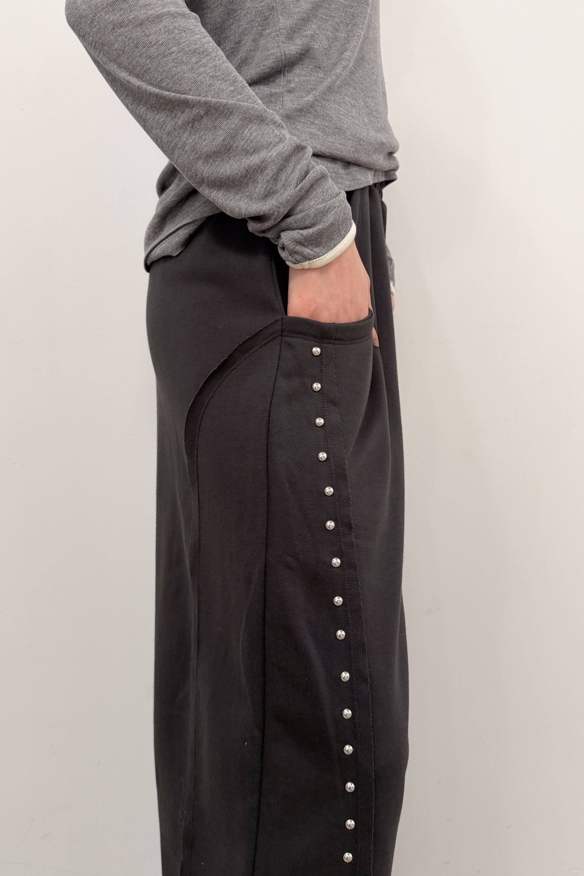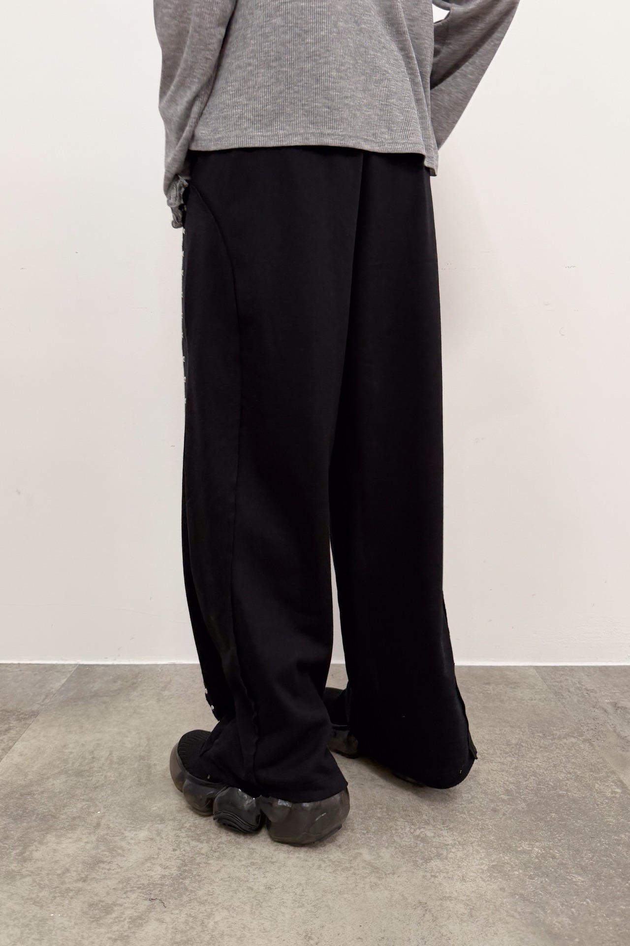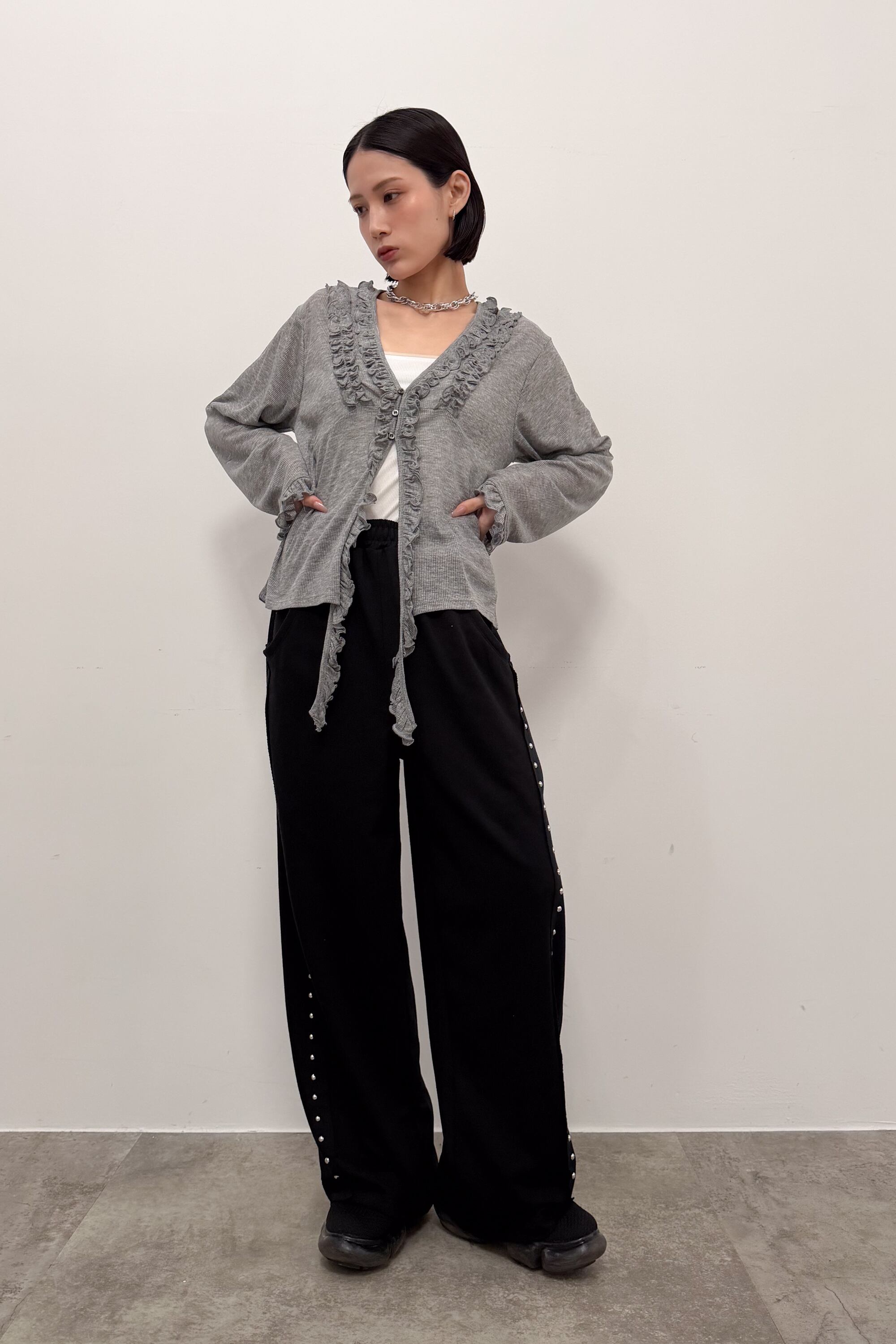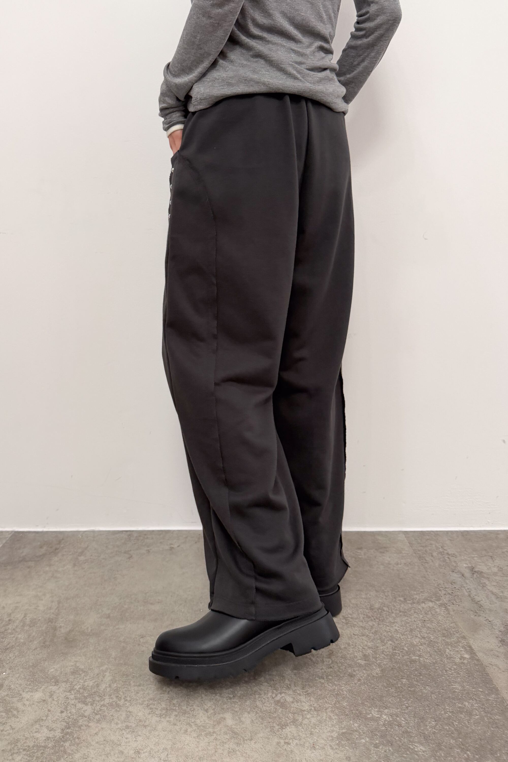 サイドに並ぶスタッズが縦ラインをつくり、シンプルなトップス合わせでも自然と“こなれ感”が出るワイドパンツ。落ち感のある素材が動くたびに表情を出しつつ、ワイドシルエットでもすっきりした印象にまとまります。ウエストはゴム仕様で締め付け感が少なく、ラクに穿けるのにきれい見えするのが魅力。足元はボリュームシューズで重心を作っても、ヒールでシャープに寄せてもバランス良く決まります。