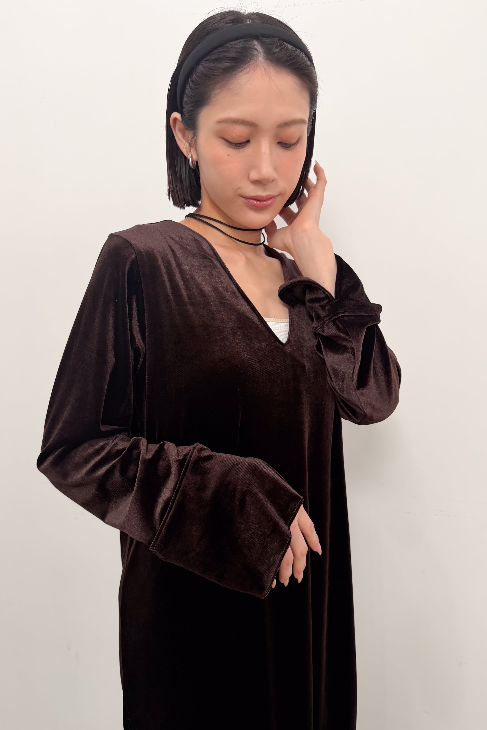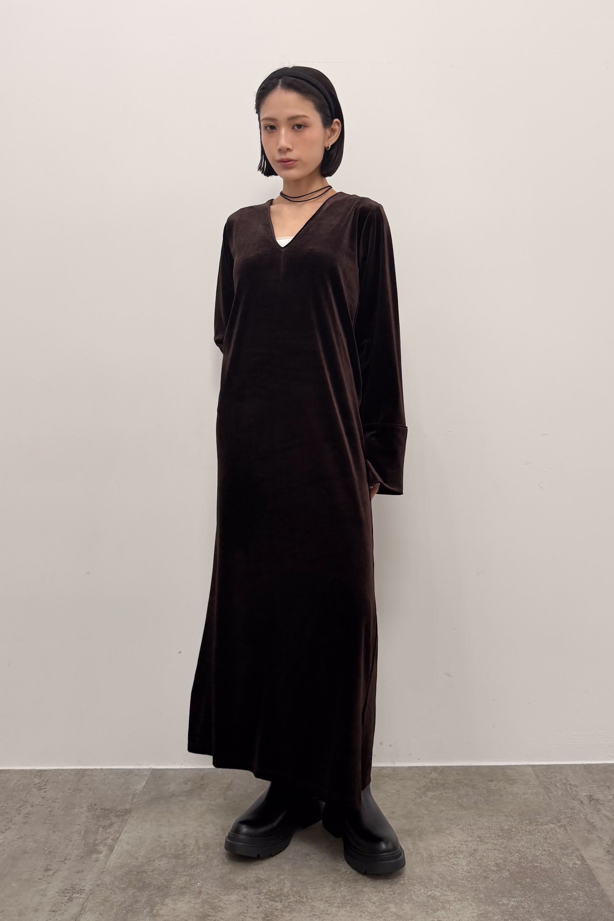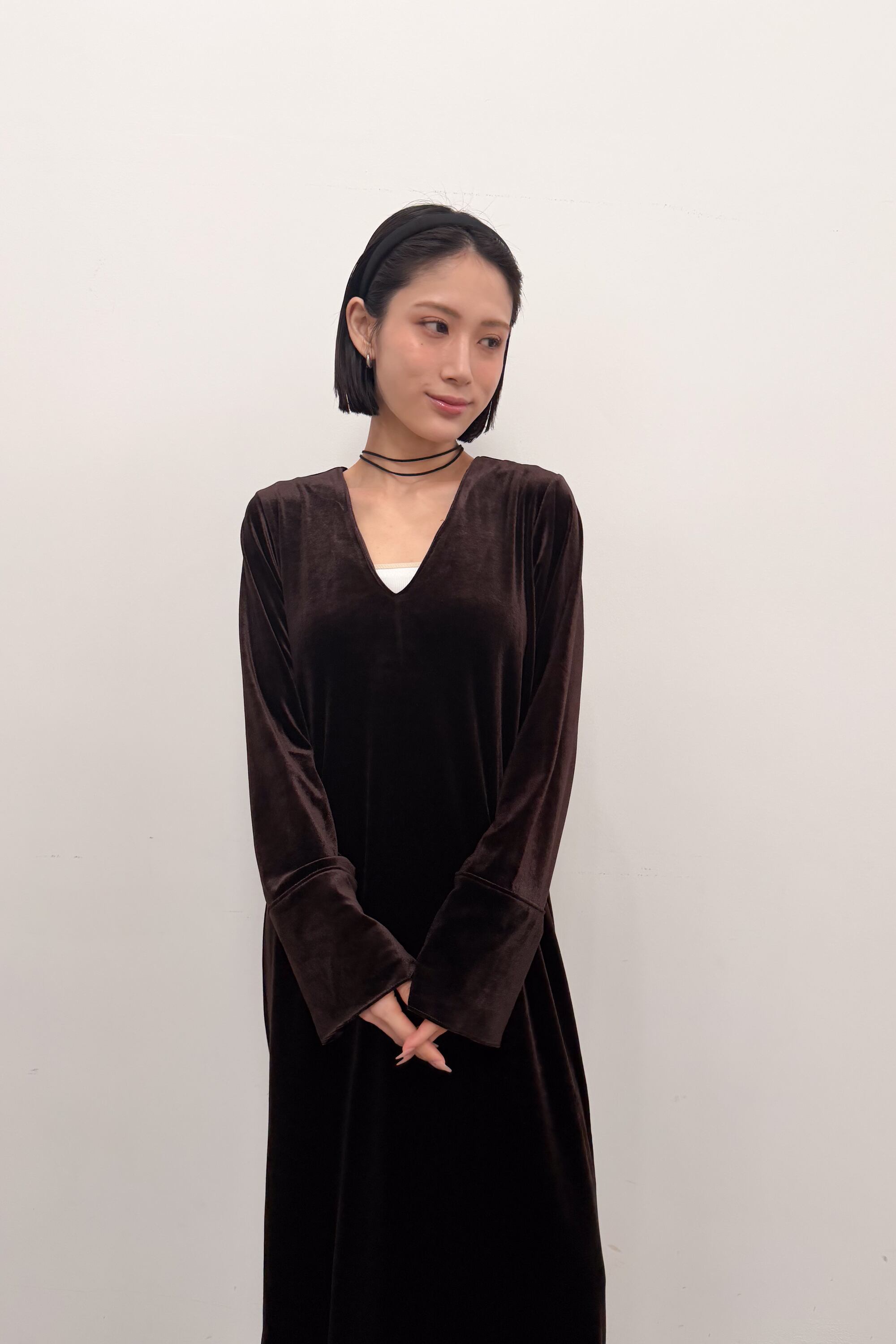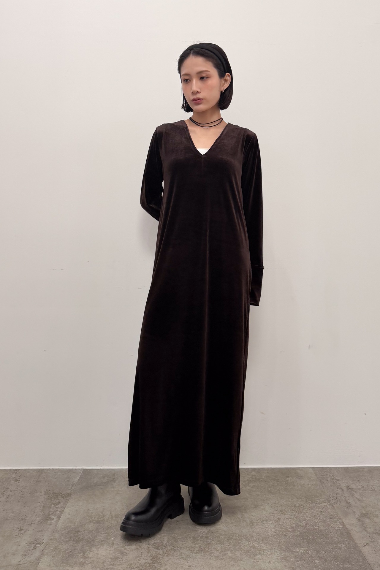 上品な光沢のベロア素材が、動くたびに陰影をつくるVネックワンピース。ストンと落ちるロング丈で縦ラインが強調され、シンプルなのに雰囲気のある佇まいにまとまります。深すぎないV開きが顔まわりをすっきり見せつつ、袖は少し長め&カフスデザインで手元までニュアンスをプラス。1枚でさらっと着ても、重ね着で表情を変えても楽しめる主役級ワンピです。