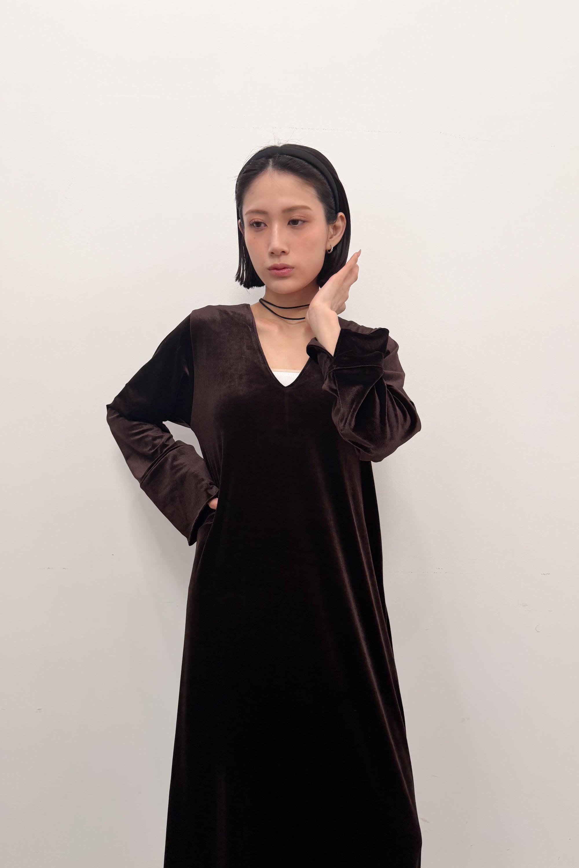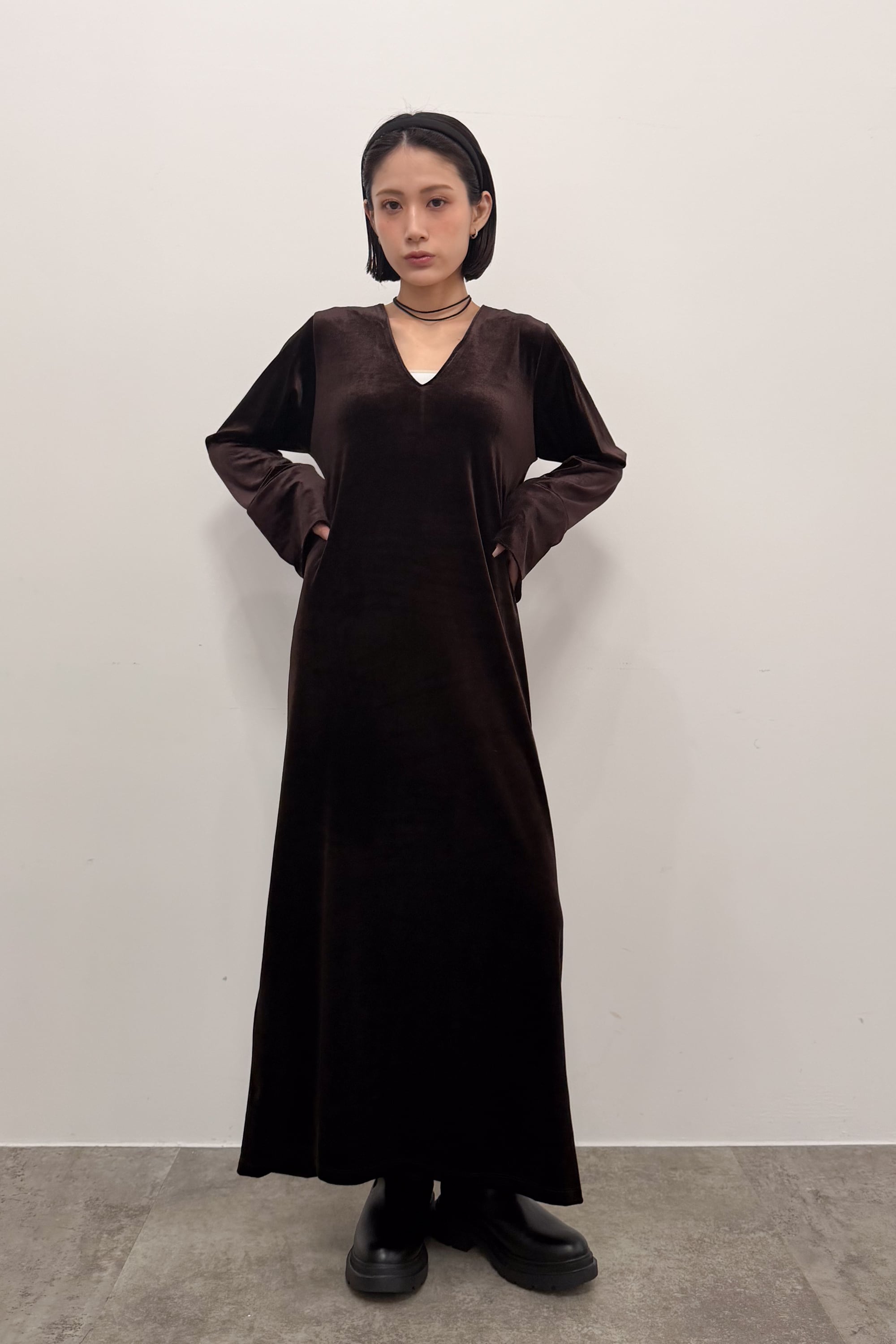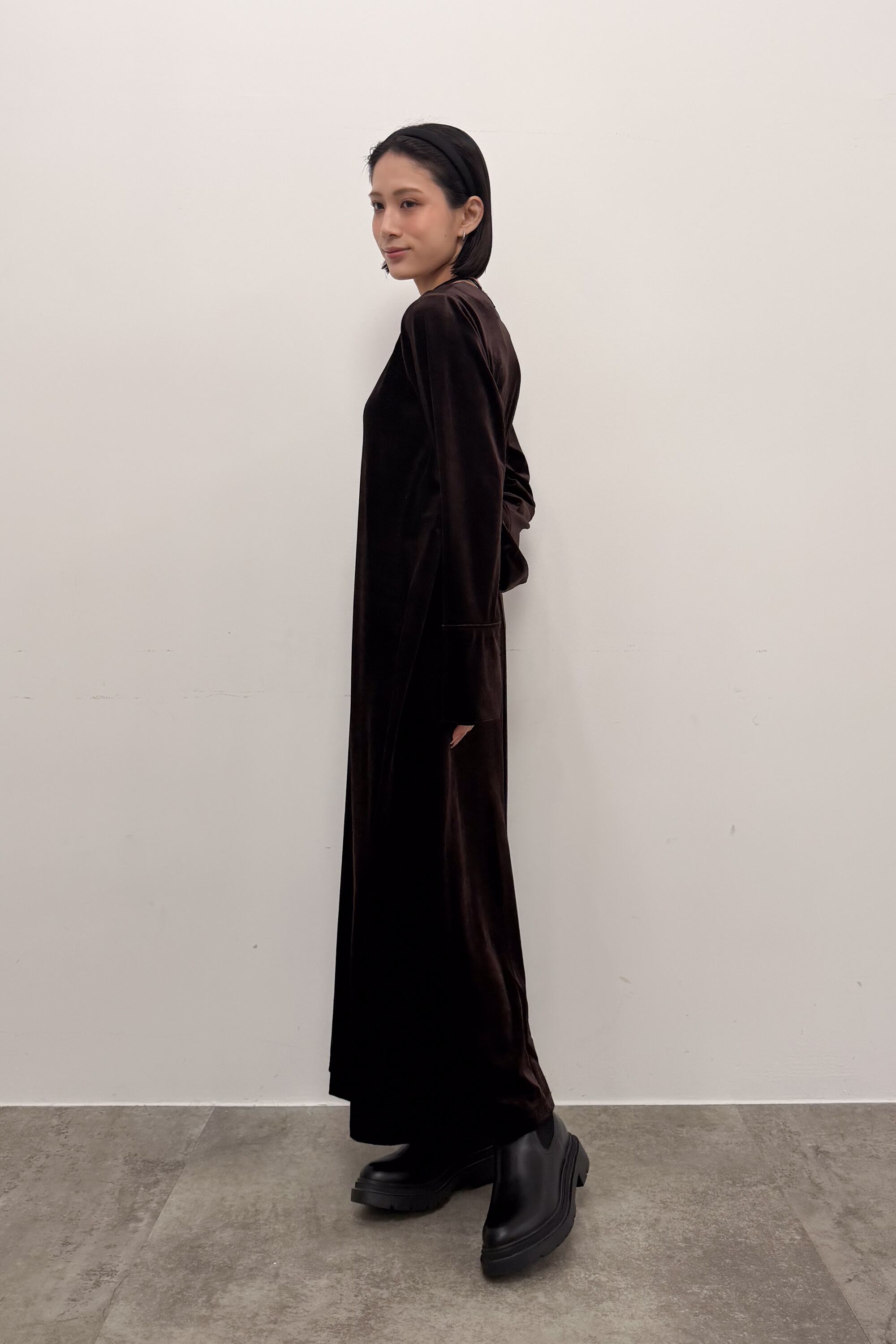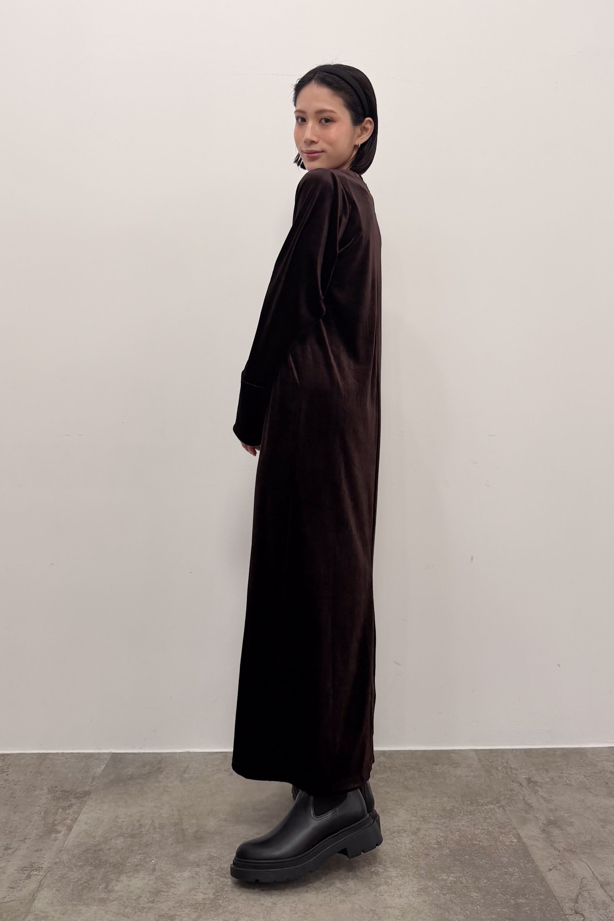 上品な光沢のベロア素材が、動くたびに陰影をつくるVネックワンピース。ストンと落ちるロング丈で縦ラインが強調され、シンプルなのに雰囲気のある佇まいにまとまります。深すぎないV開きが顔まわりをすっきり見せつつ、袖は少し長め&カフスデザインで手元までニュアンスをプラス。1枚でさらっと着ても、重ね着で表情を変えても楽しめる主役級ワンピです。