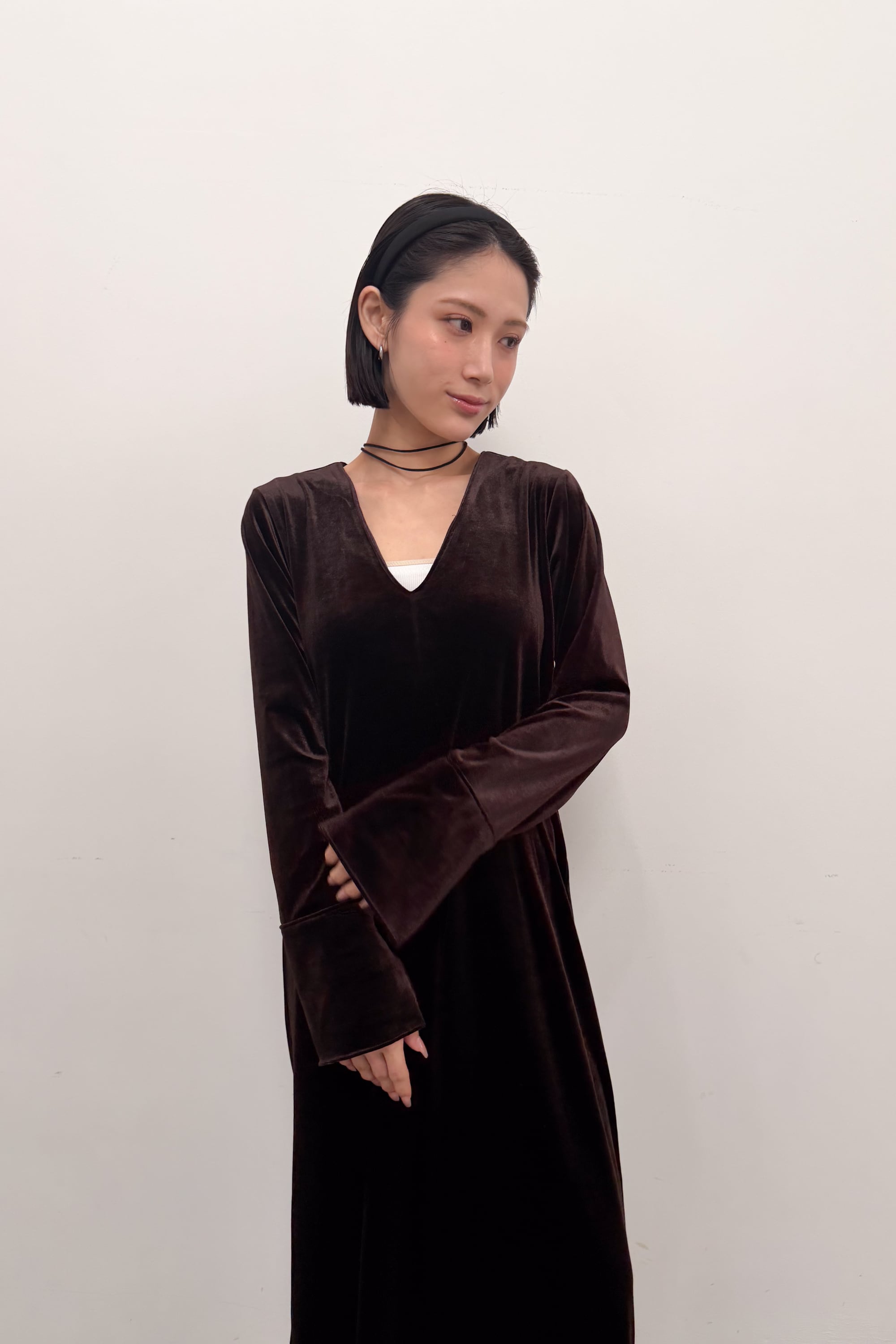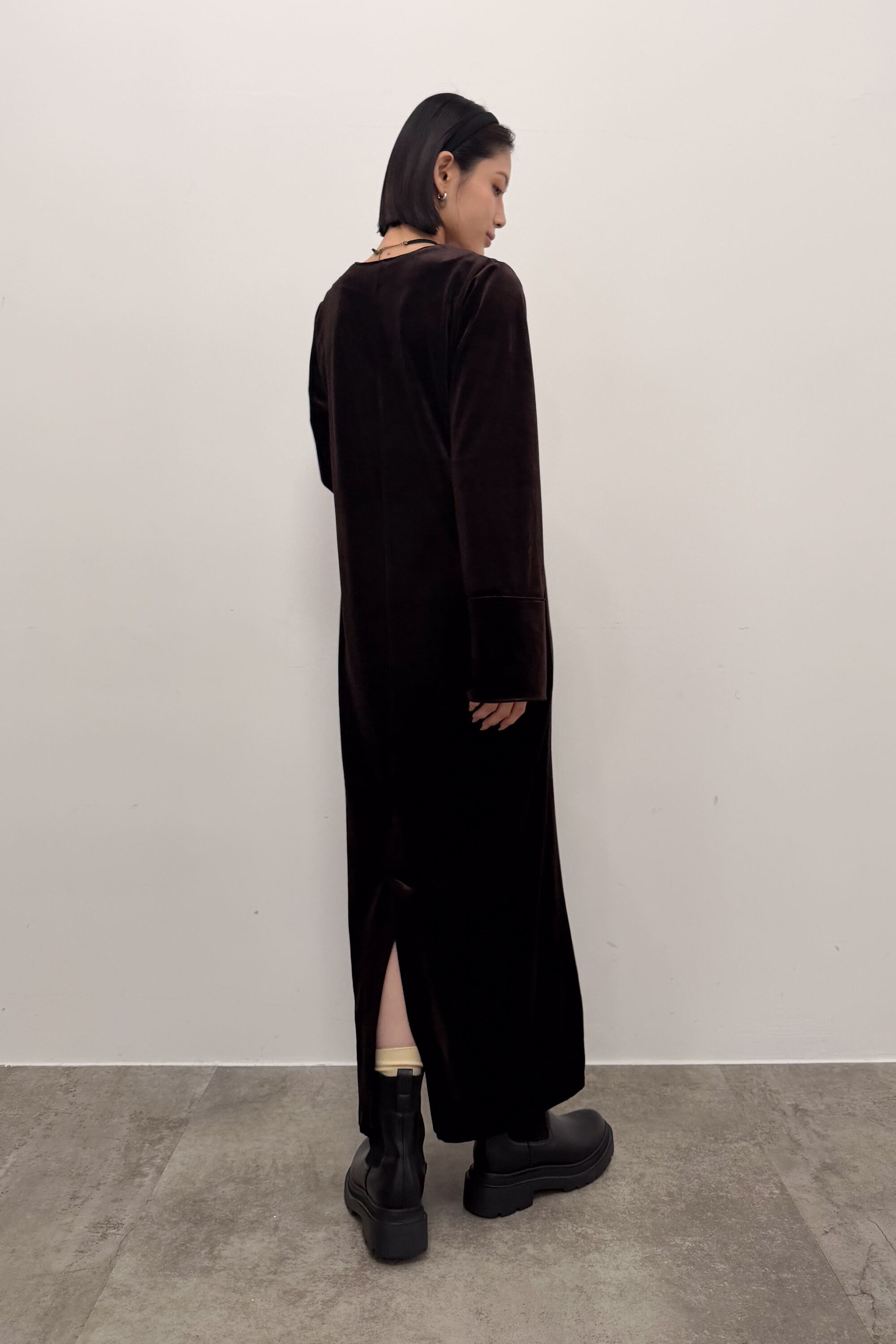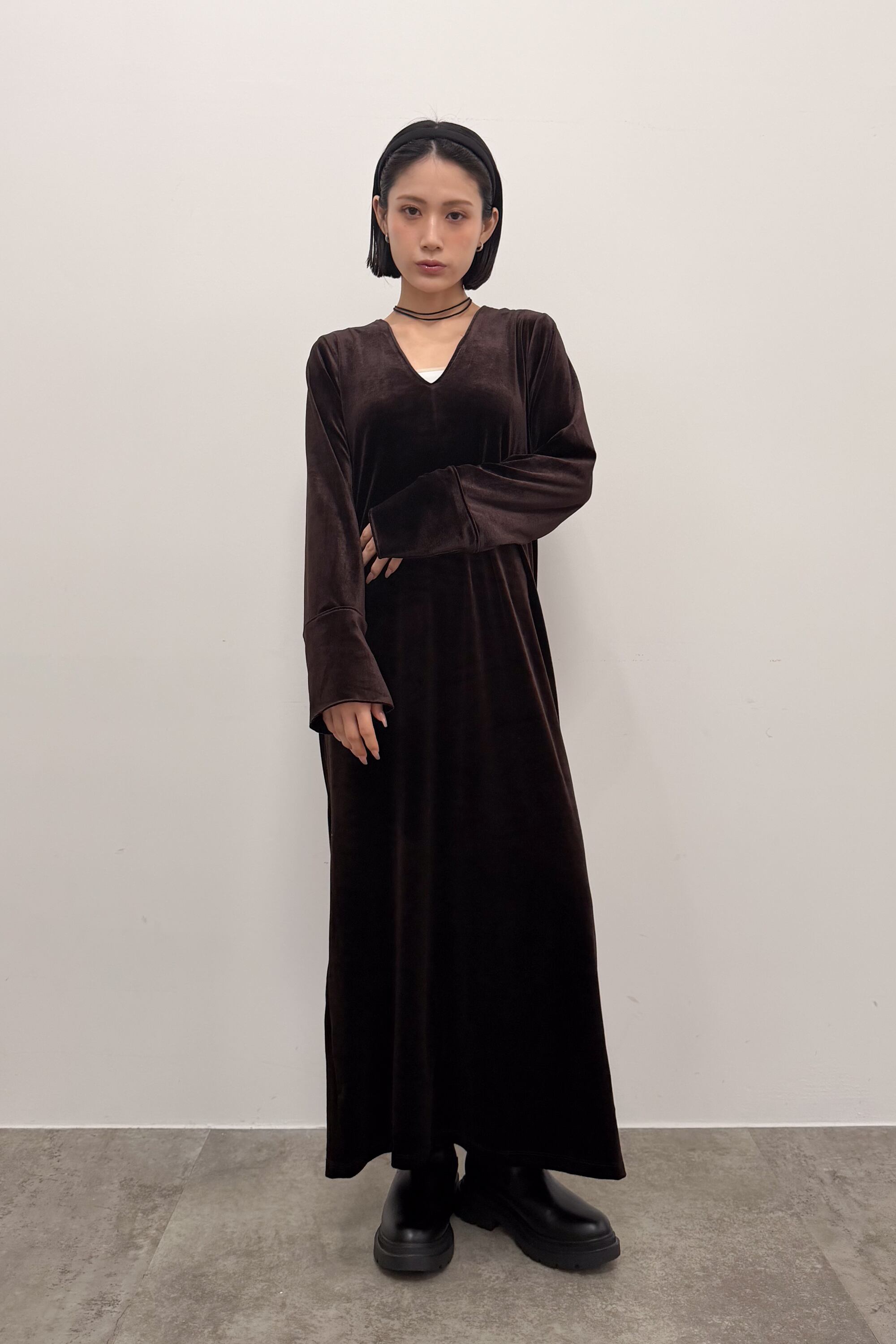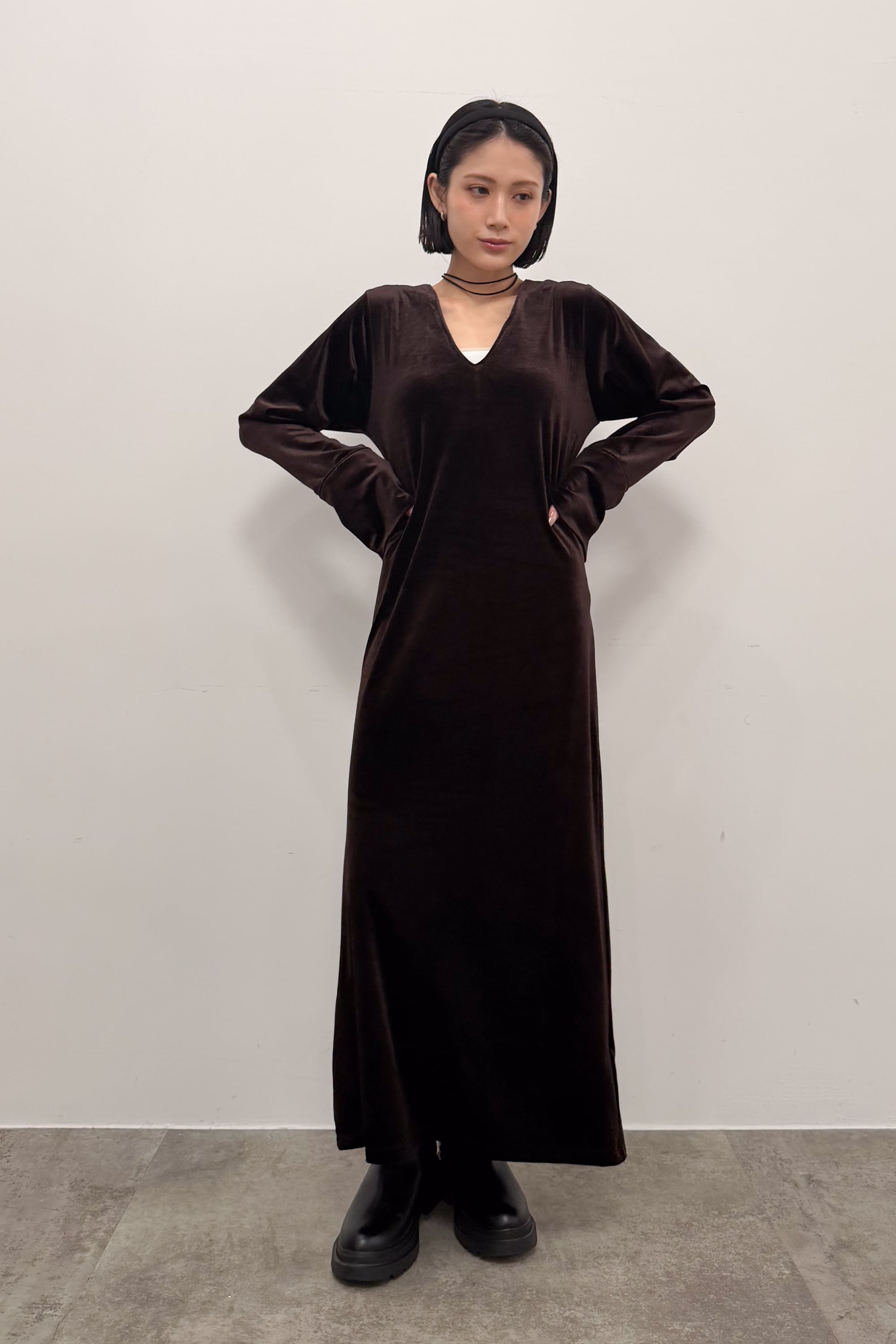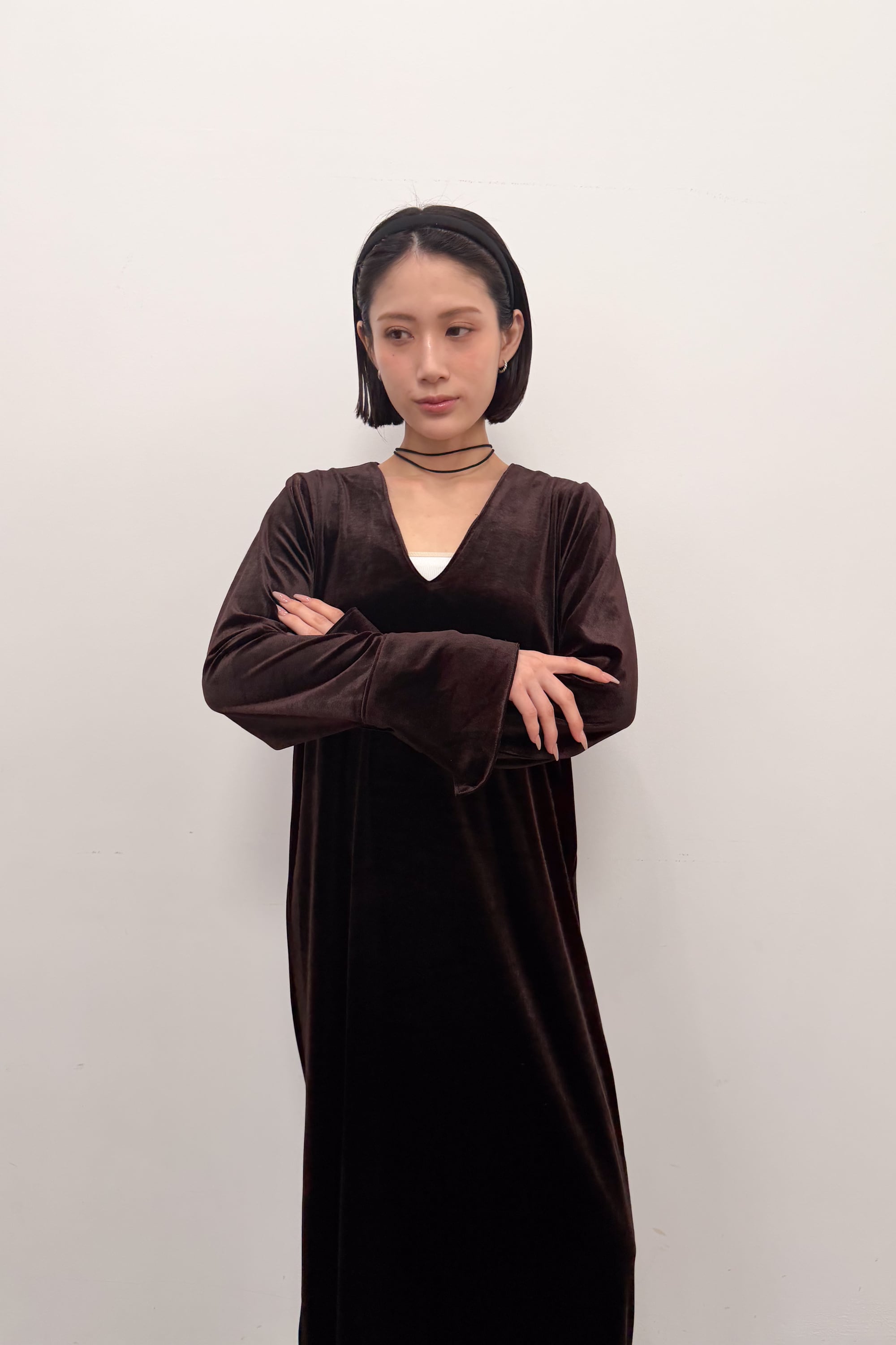 上品な光沢のベロア素材が、動くたびに陰影をつくるVネックワンピース。ストンと落ちるロング丈で縦ラインが強調され、シンプルなのに雰囲気のある佇まいにまとまります。深すぎないV開きが顔まわりをすっきり見せつつ、袖は少し長め&カフスデザインで手元までニュアンスをプラス。1枚でさらっと着ても、重ね着で表情を変えても楽しめる主役級ワンピです。