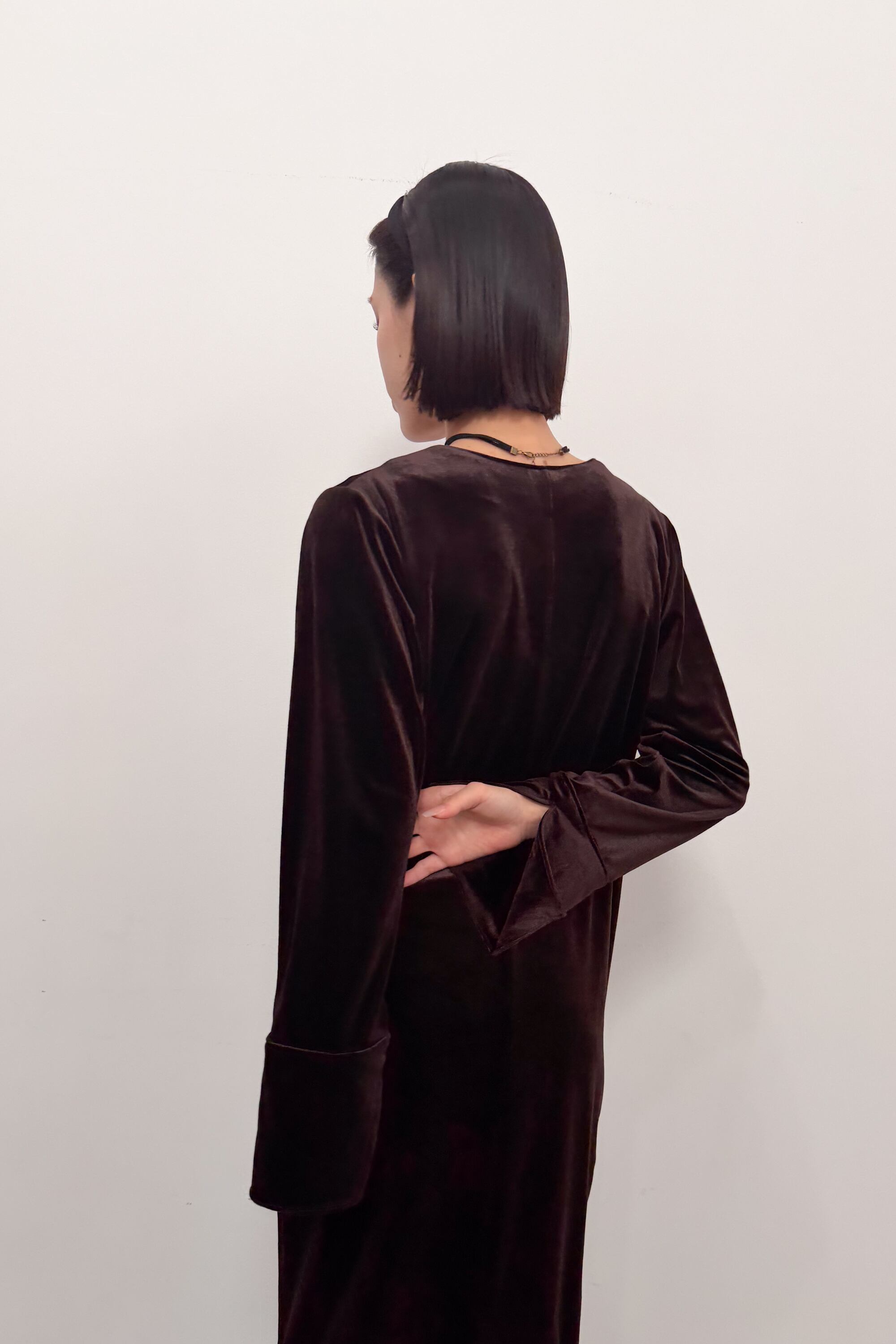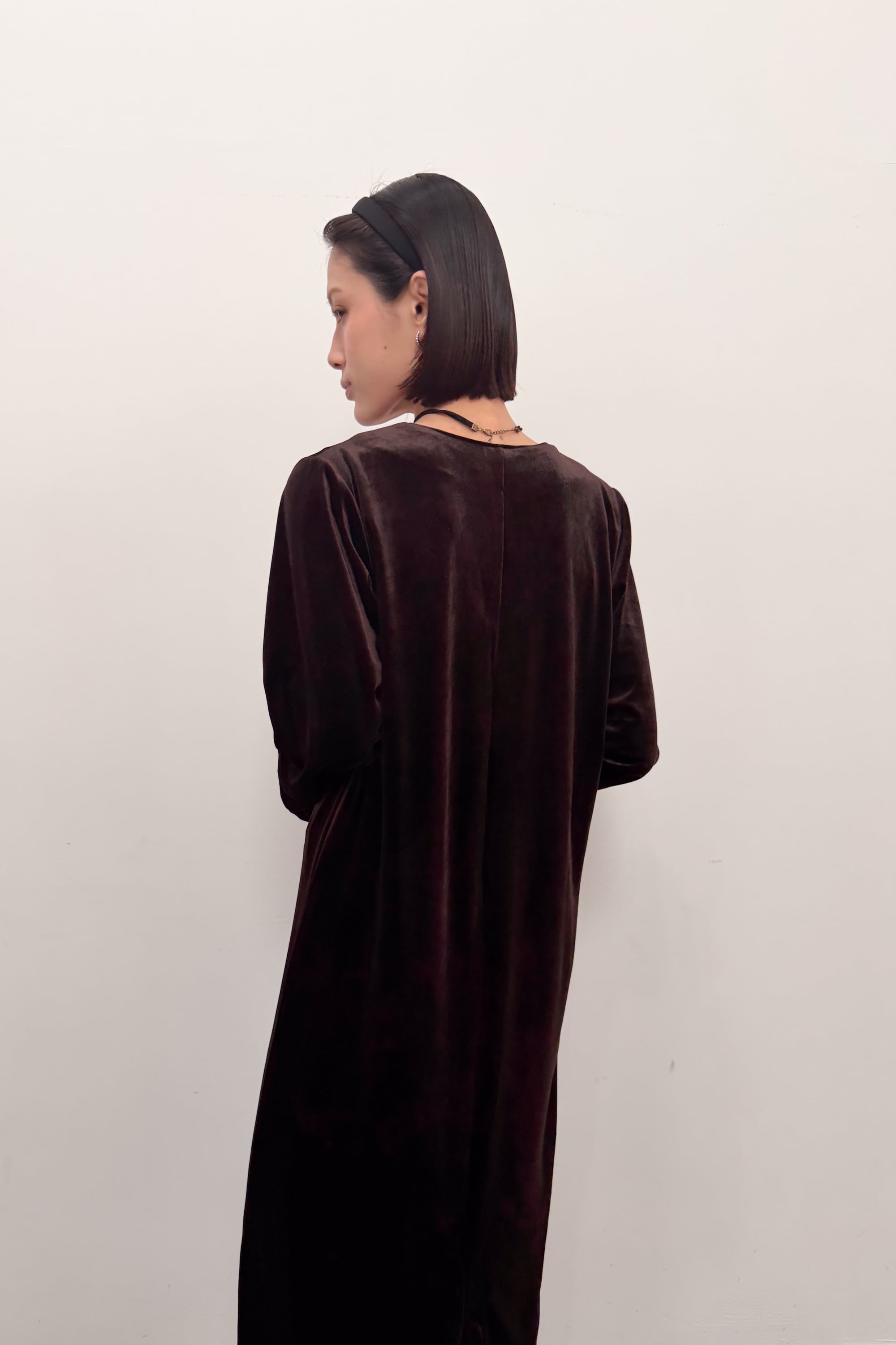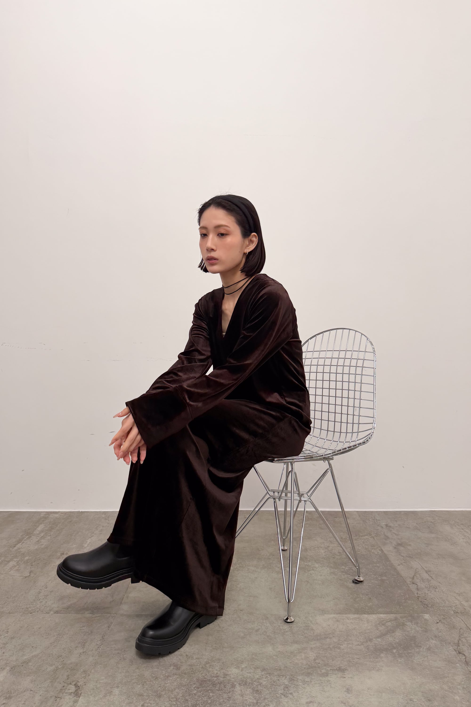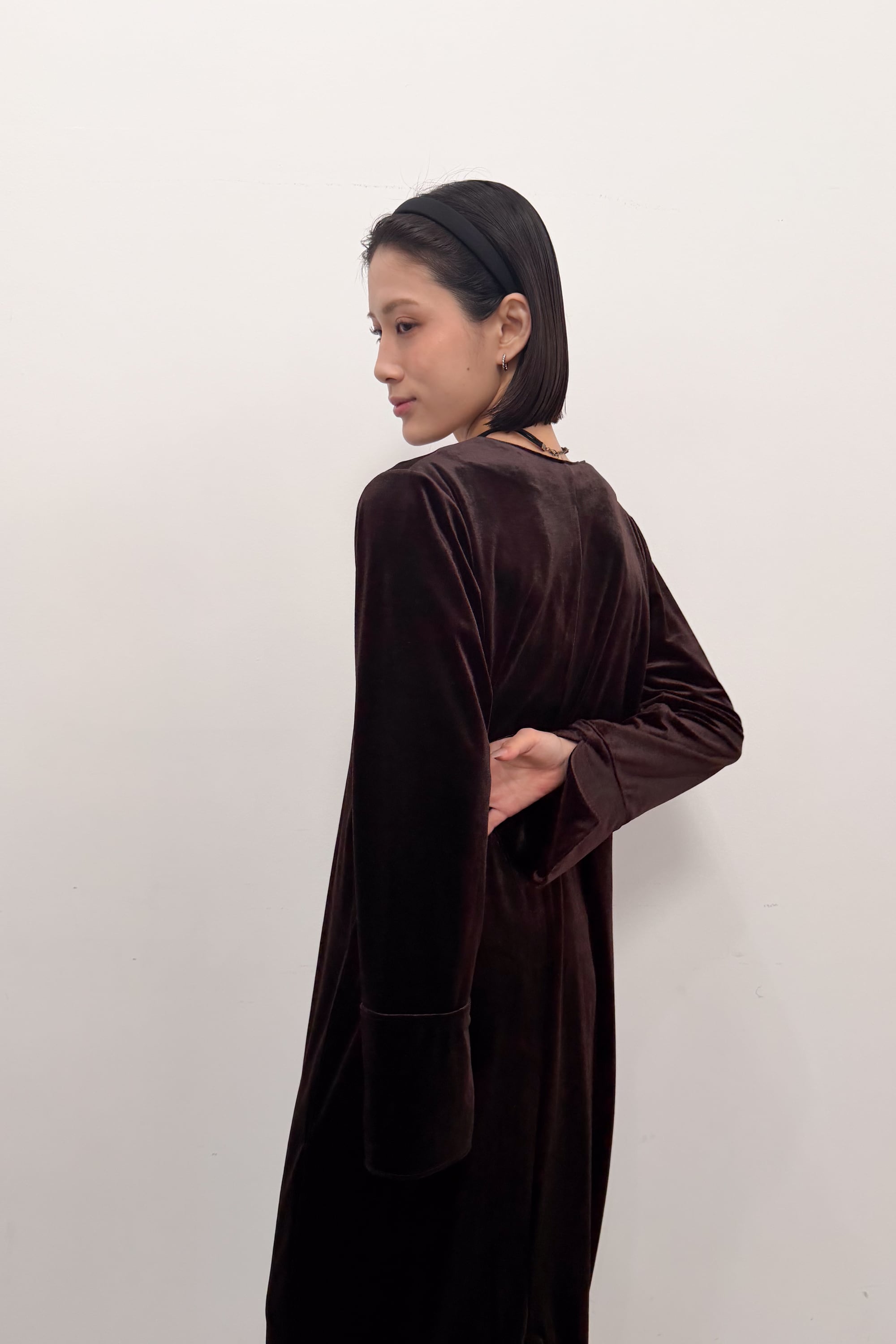 上品な光沢のベロア素材が、動くたびに陰影をつくるVネックワンピース。ストンと落ちるロング丈で縦ラインが強調され、シンプルなのに雰囲気のある佇まいにまとまります。深すぎないV開きが顔まわりをすっきり見せつつ、袖は少し長め&カフスデザインで手元までニュアンスをプラス。1枚でさらっと着ても、重ね着で表情を変えても楽しめる主役級ワンピです。