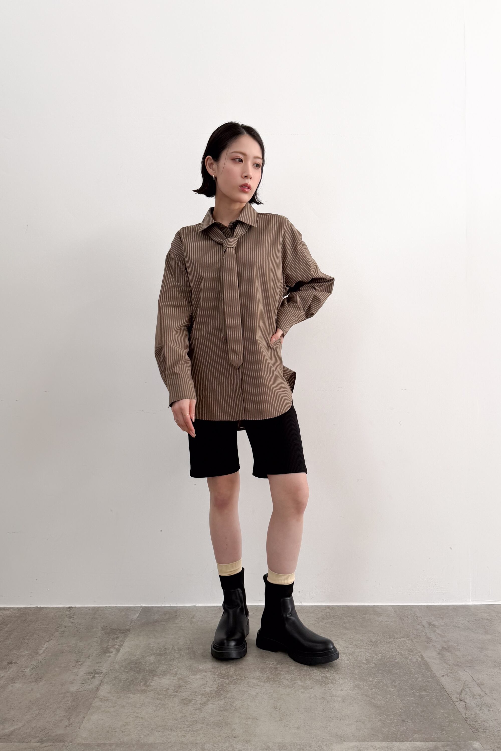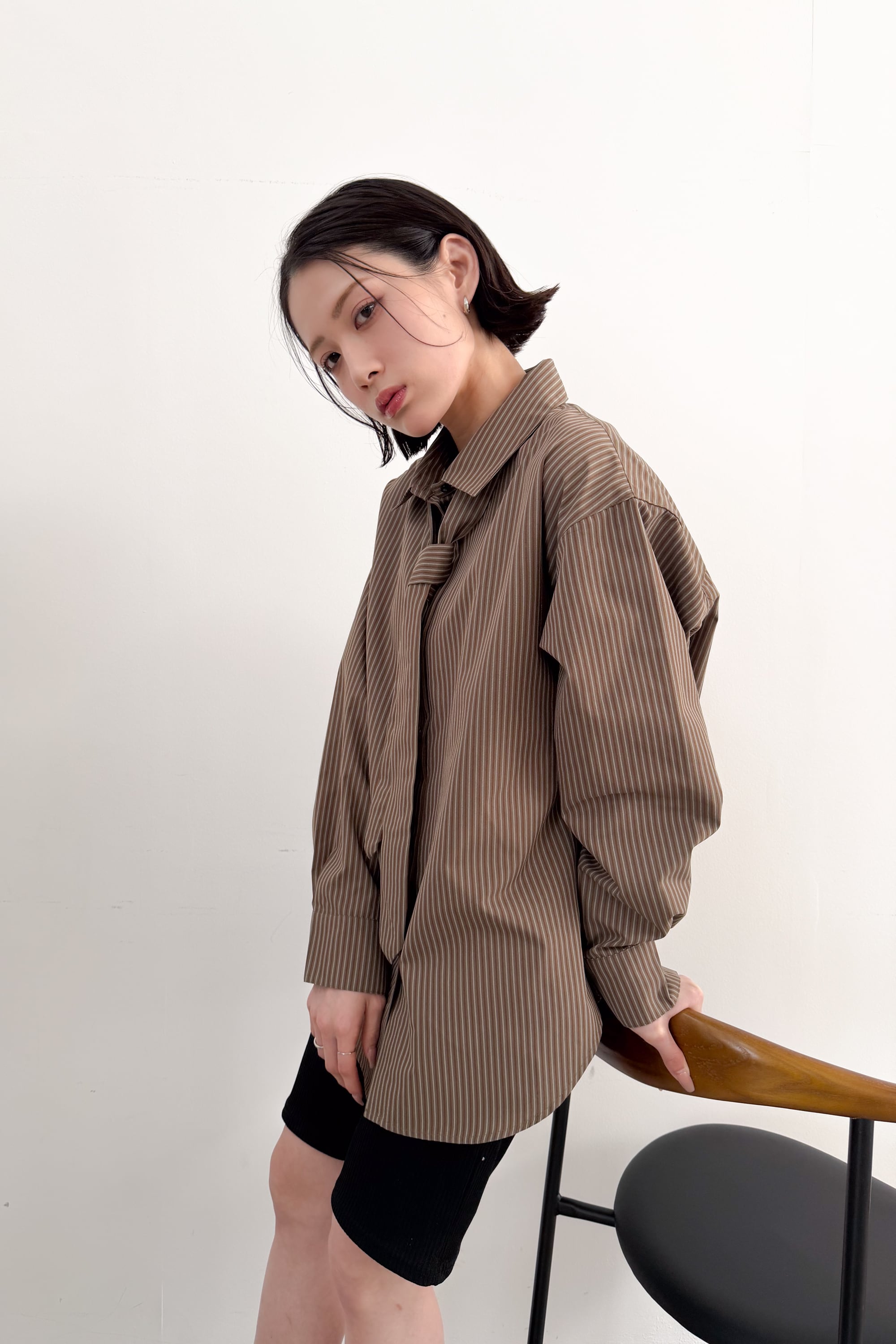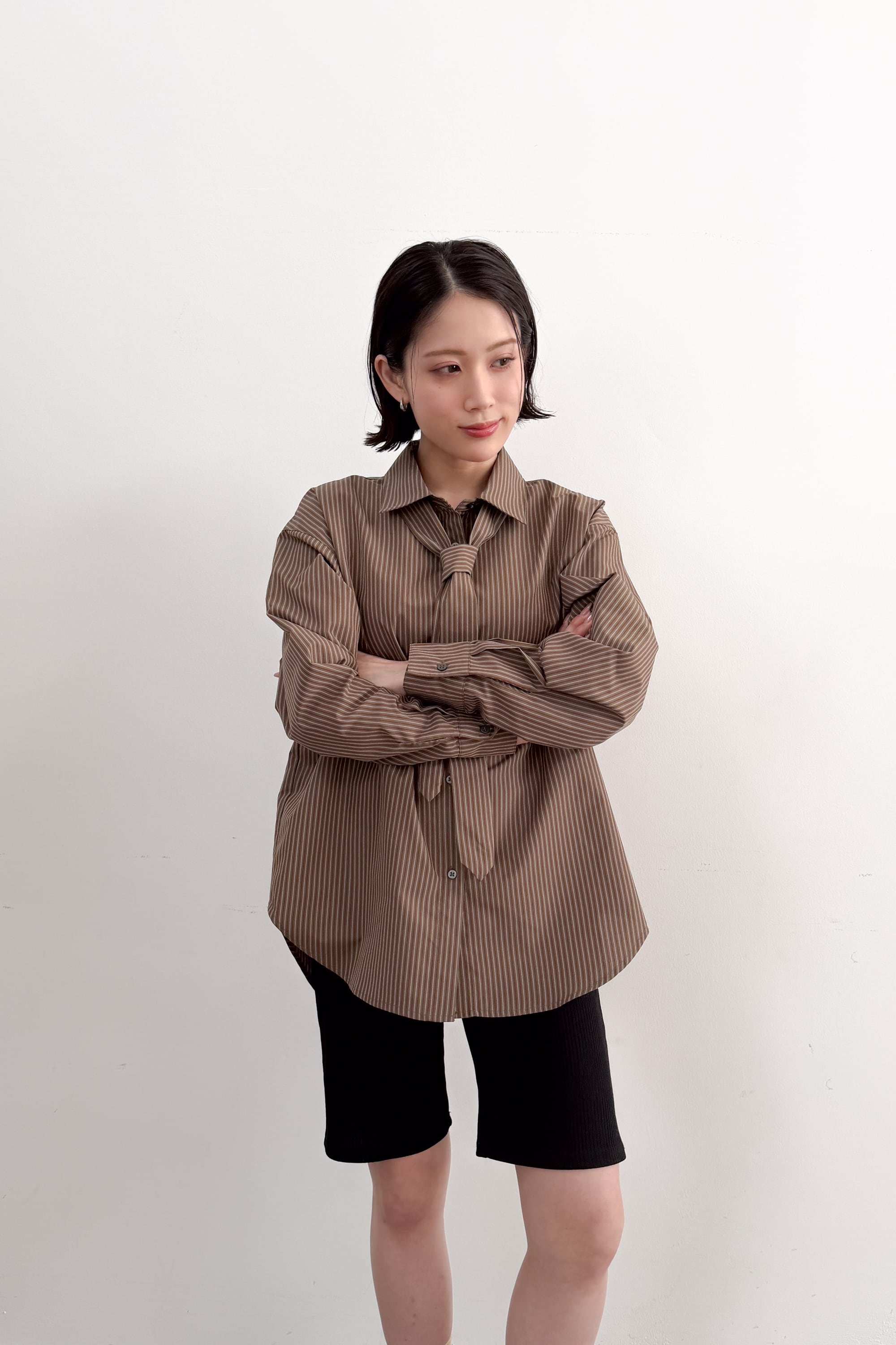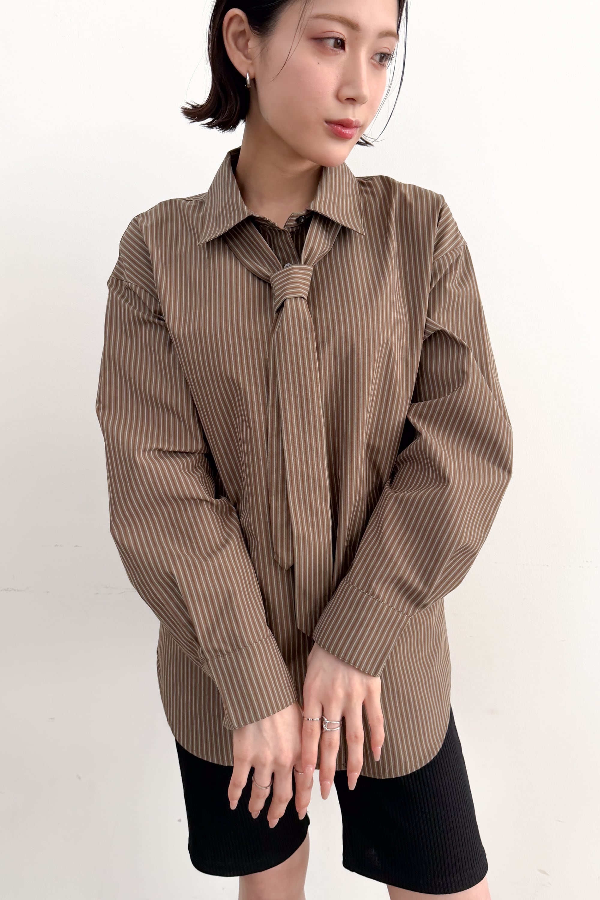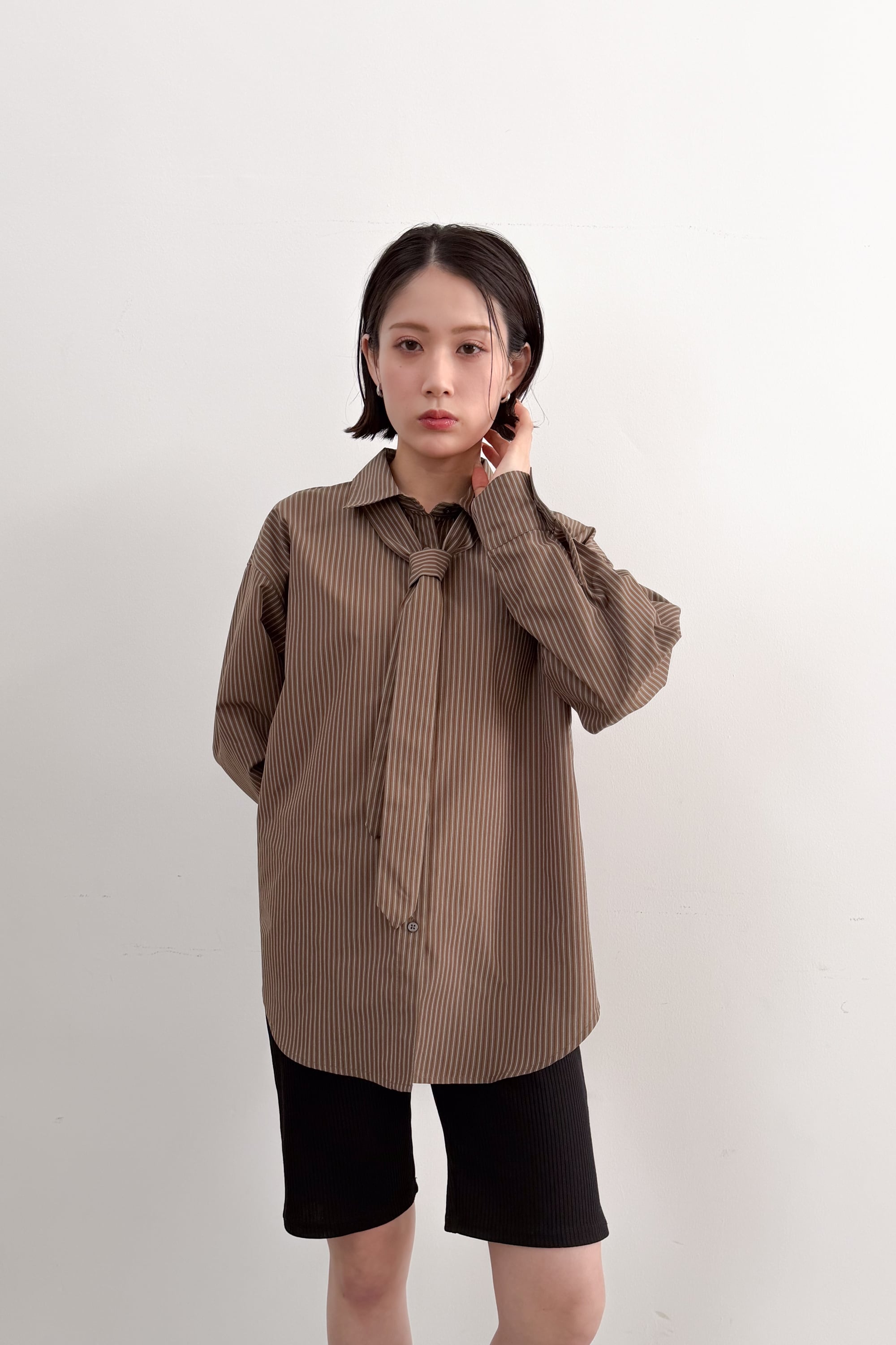 ナロータイ風デザインがアクセントになった、マニッシュなムードのストライプシャツ。落ち着いたブラウン系の細ストライプで、きちんと感がありながらも柔らかい印象で着こなしやすい一枚です。程よくゆとりのあるシルエットと長めの丈感で、さらっと着るだけでもこなれたバランスに。ショートパンツやスラックス、デニムまで幅広く合わせやすく、カジュアルにもきれいめにも着回せます。