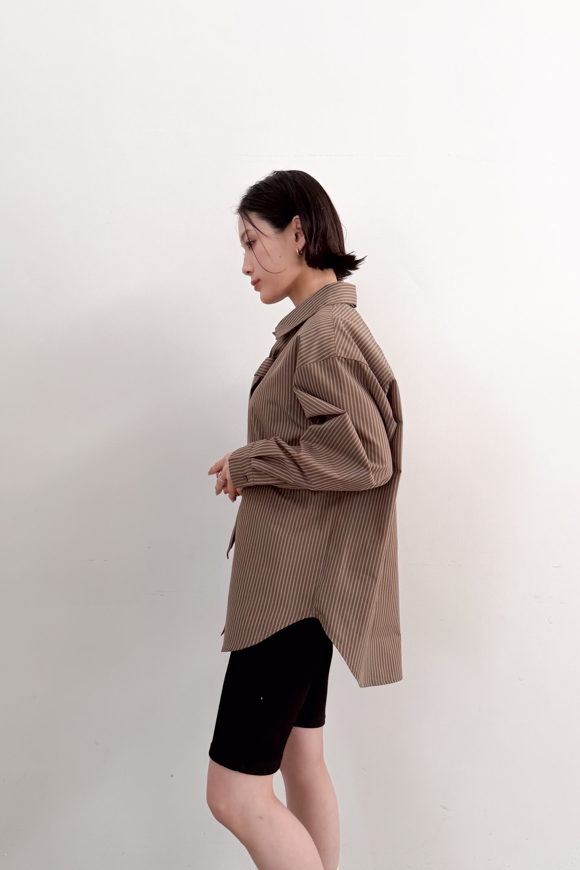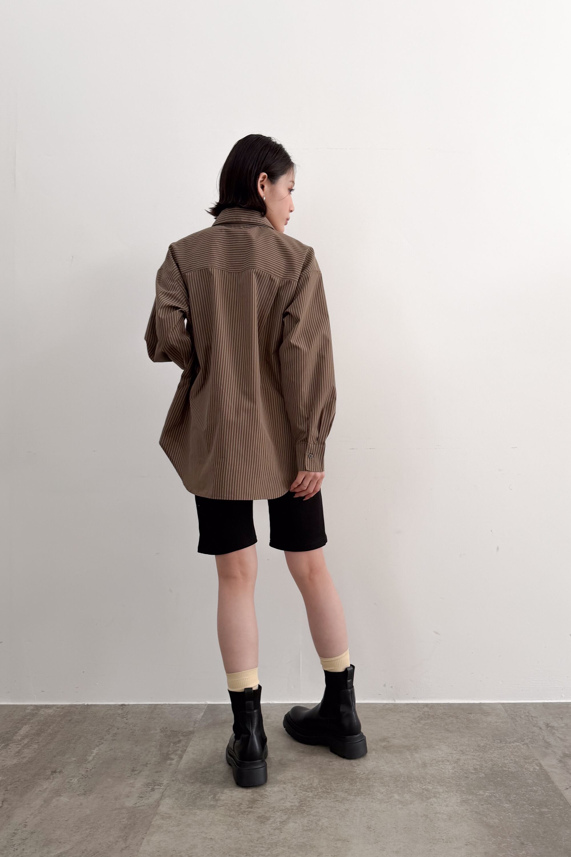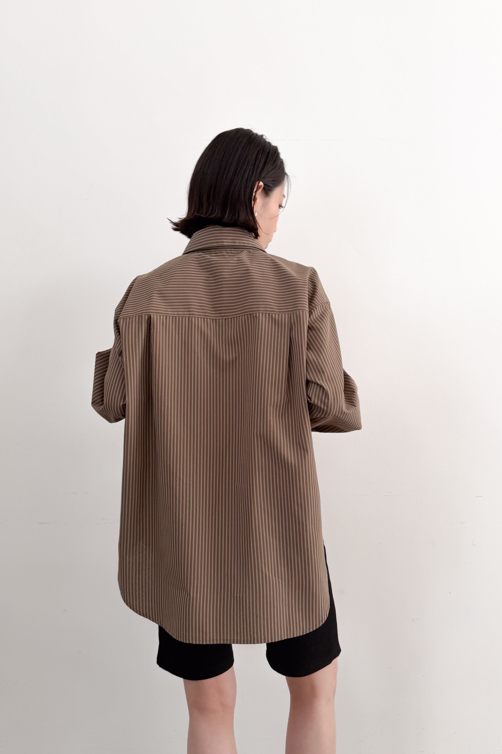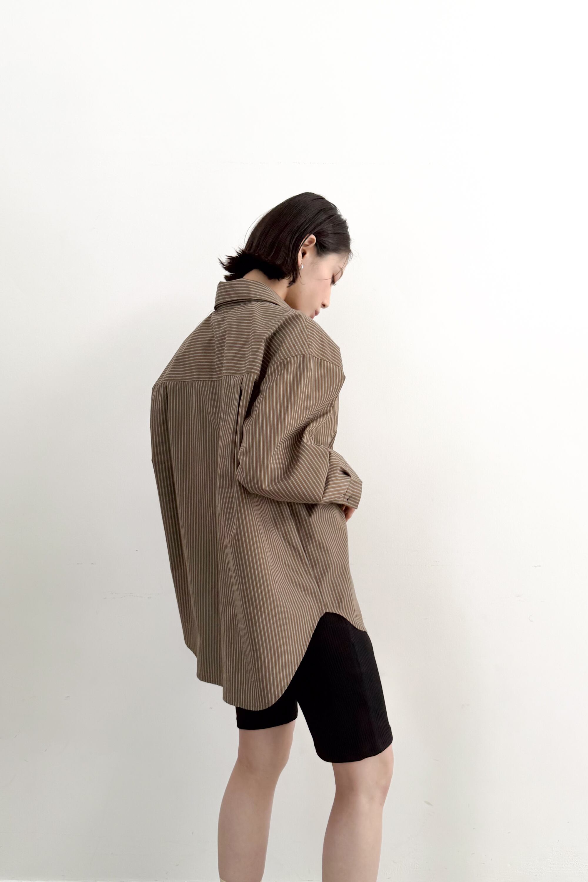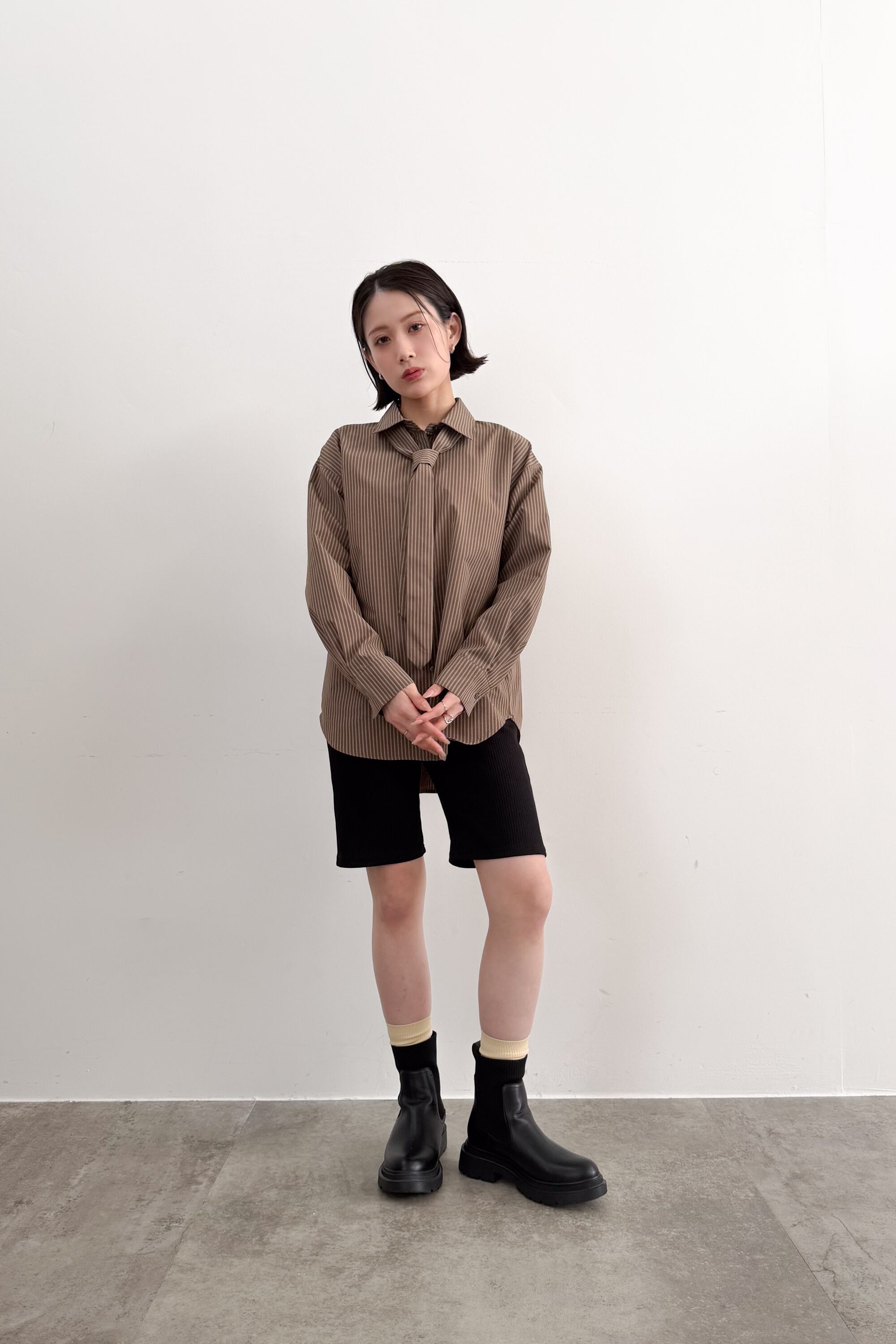 ナロータイ風デザインがアクセントになった、マニッシュなムードのストライプシャツ。落ち着いたブラウン系の細ストライプで、きちんと感がありながらも柔らかい印象で着こなしやすい一枚です。程よくゆとりのあるシルエットと長めの丈感で、さらっと着るだけでもこなれたバランスに。ショートパンツやスラックス、デニムまで幅広く合わせやすく、カジュアルにもきれいめにも着回せます。