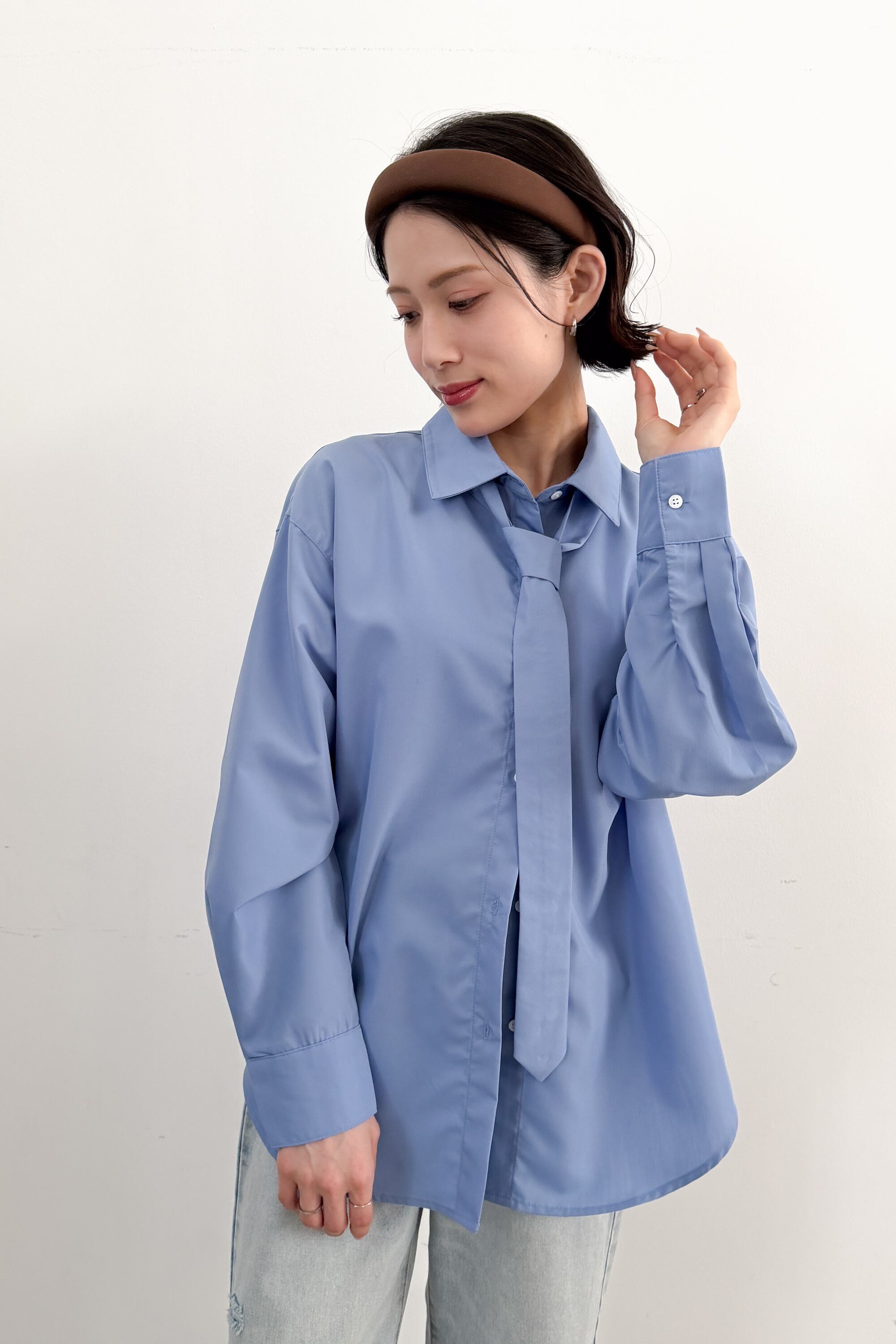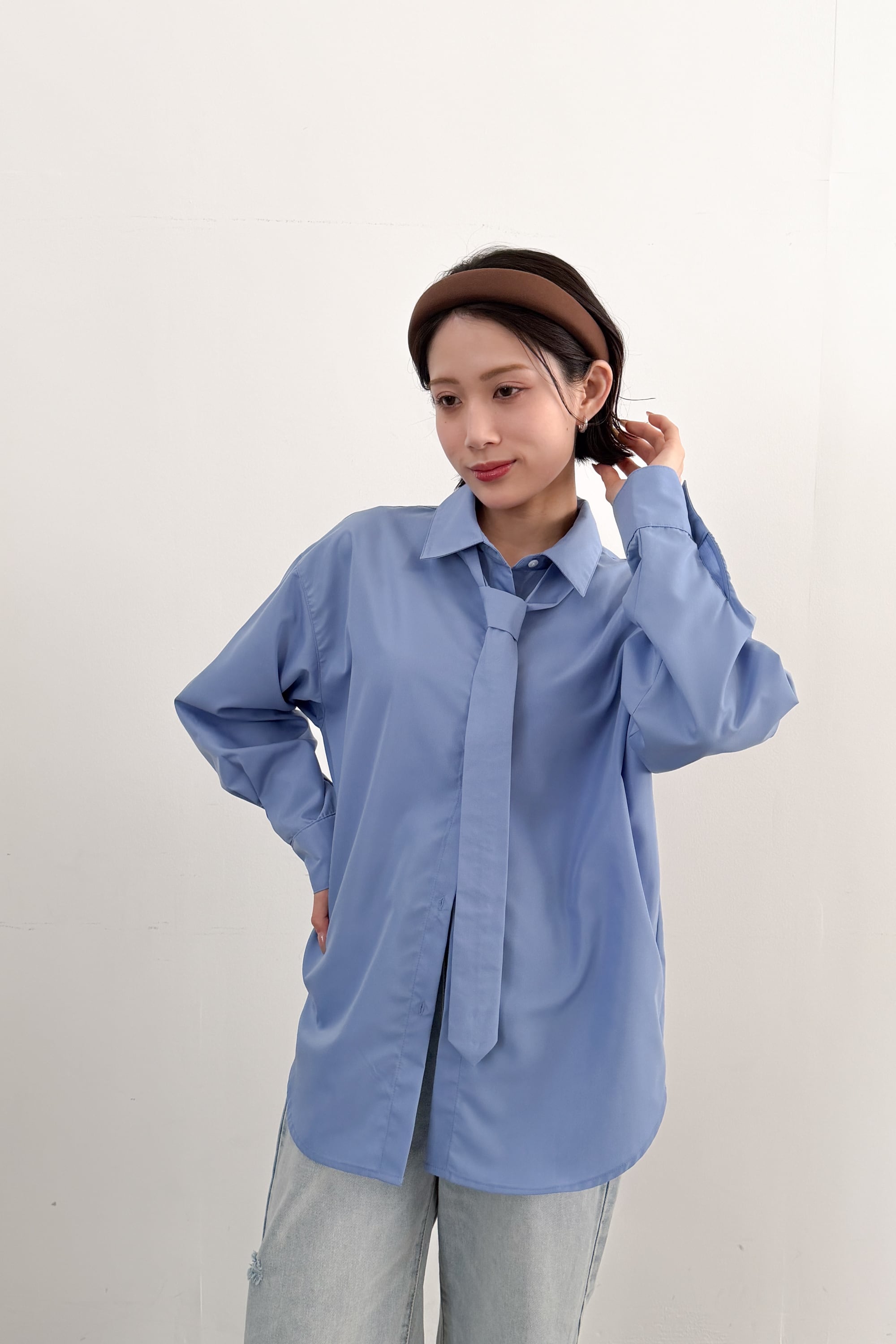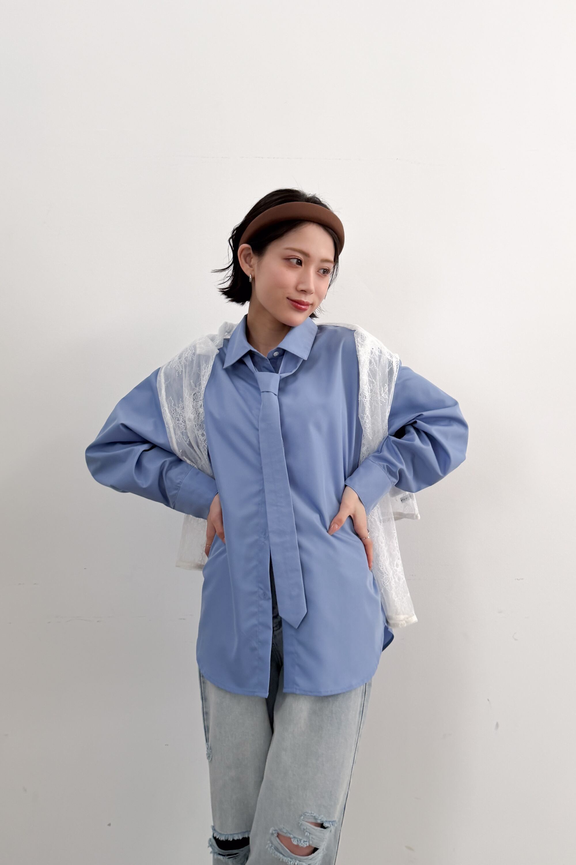 同素材のナロータイ風デザインが目を惹く、旬バランスのデザインシャツ。程よくゆとりのあるシルエットと長めの丈感で、さらっと着るだけでもこなれた印象に仕上がります。爽やかなブルーカラーが重たく見えず、デニム合わせで抜け感のあるカジュアルにも、スラックス合わせできれいめにも着回しやすい一枚。タイはラフに垂らして抜け感を出すのもおすすめです。