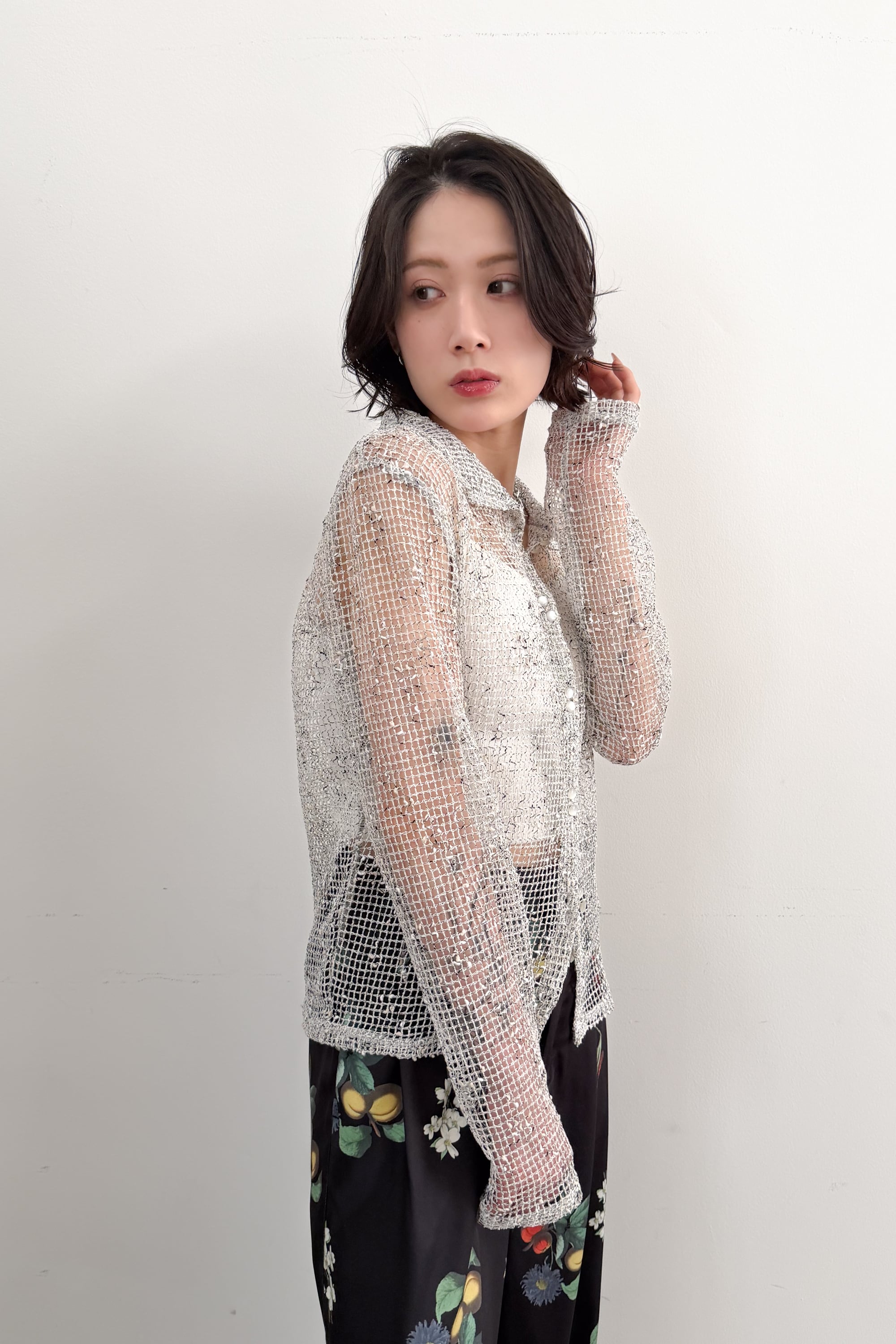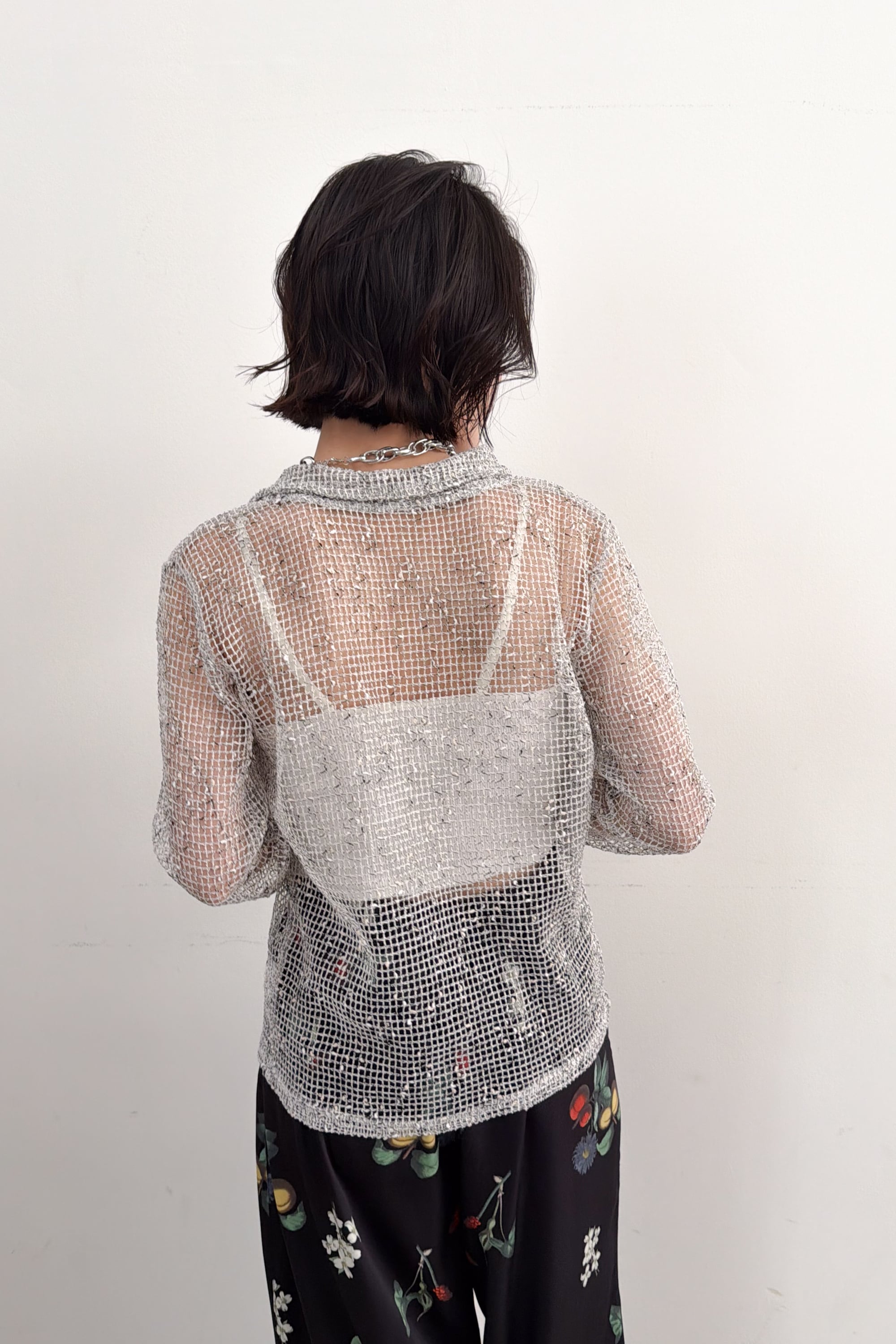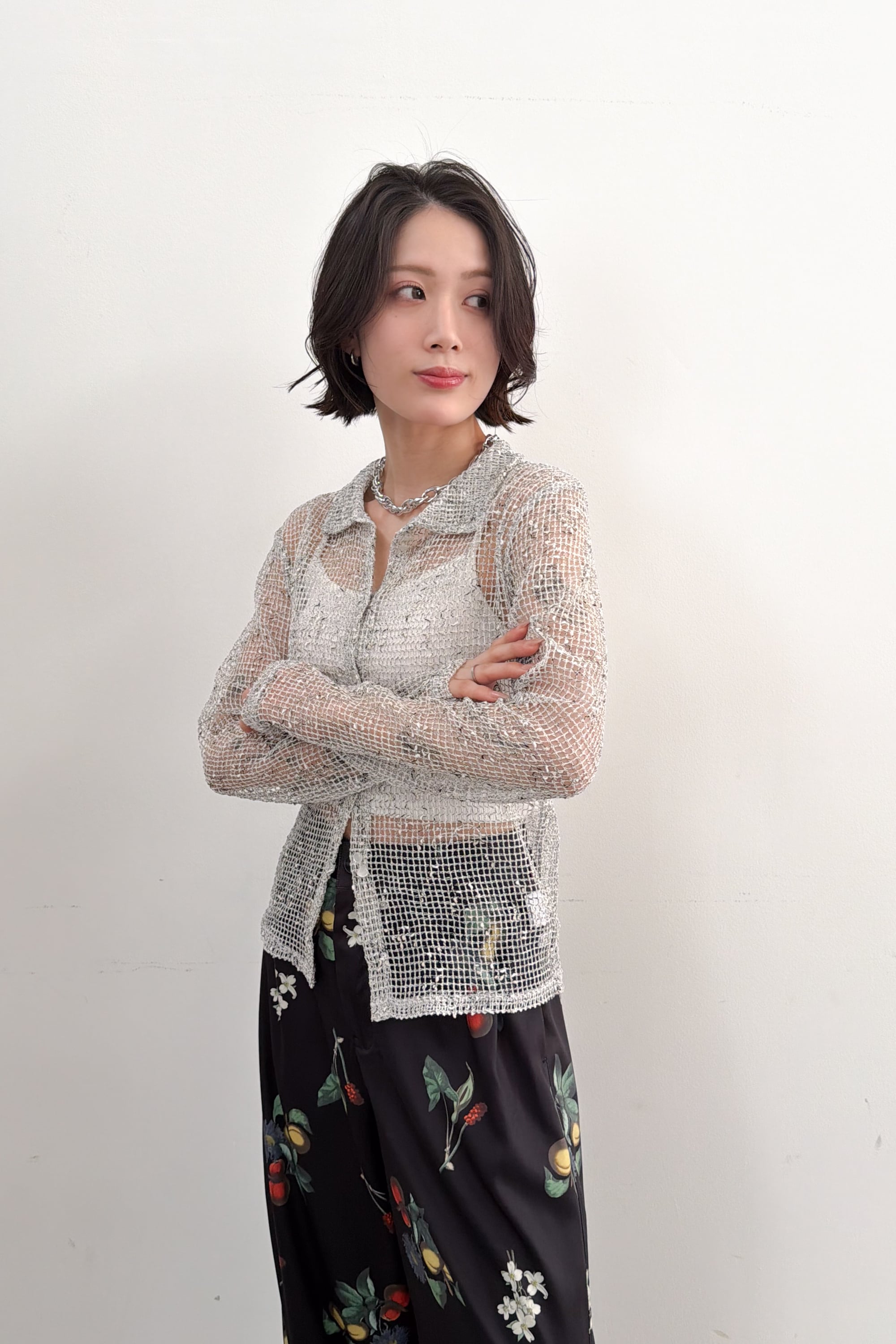 ざっくりとした透かし編みが目を惹く、襟付きデザインのメッシュトップス。程よい透け感で抜けをつくりながら、ポロライクなディテールが甘さを抑えて大人っぽい印象に仕上げてくれます。インナーとのレイヤードで表情が変わるので、タンクトップやキャミ合わせで着こなしの幅も広がる一枚。柄ボトムと合わせても重たく見えず、軽やかなスタイリングが完成します。