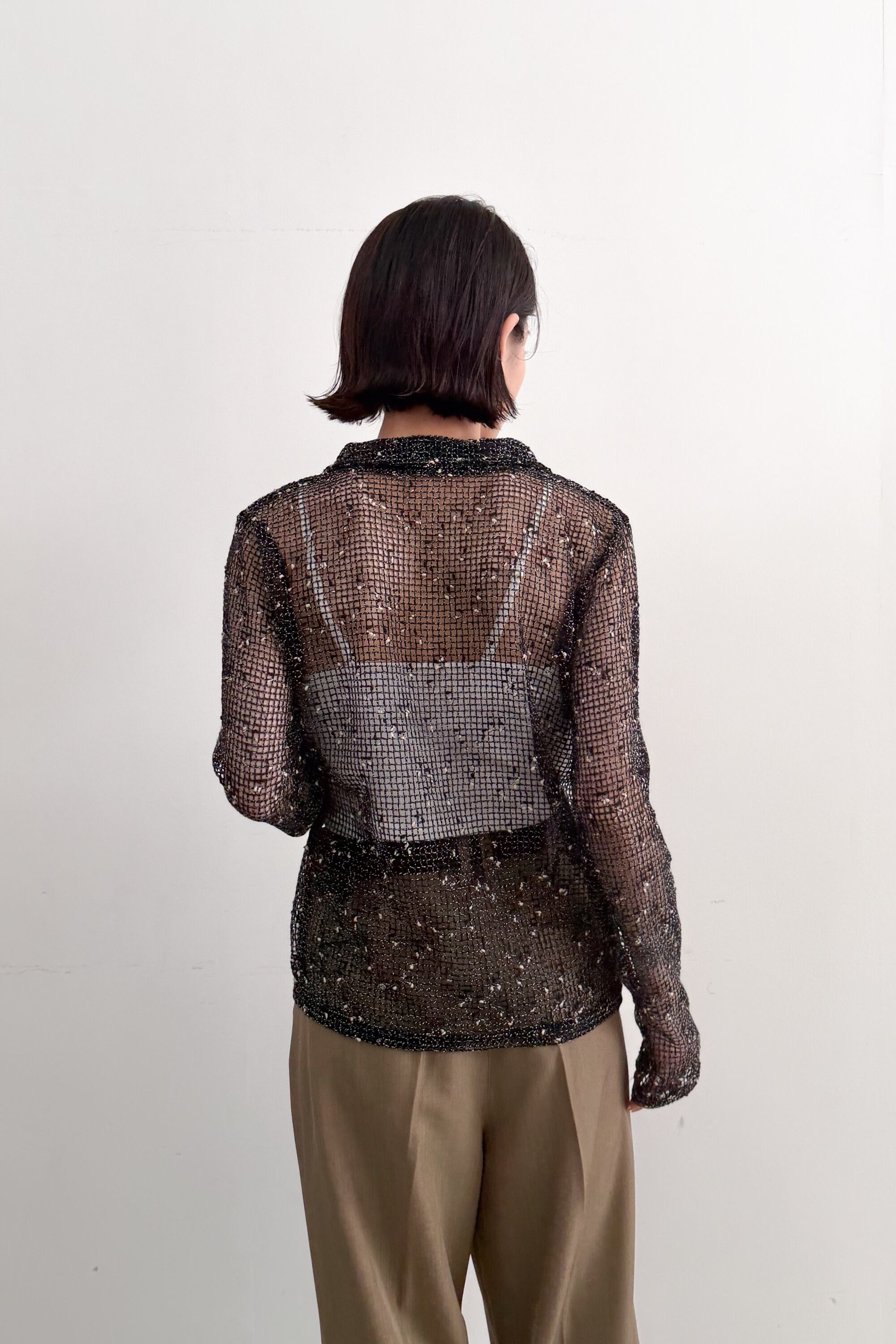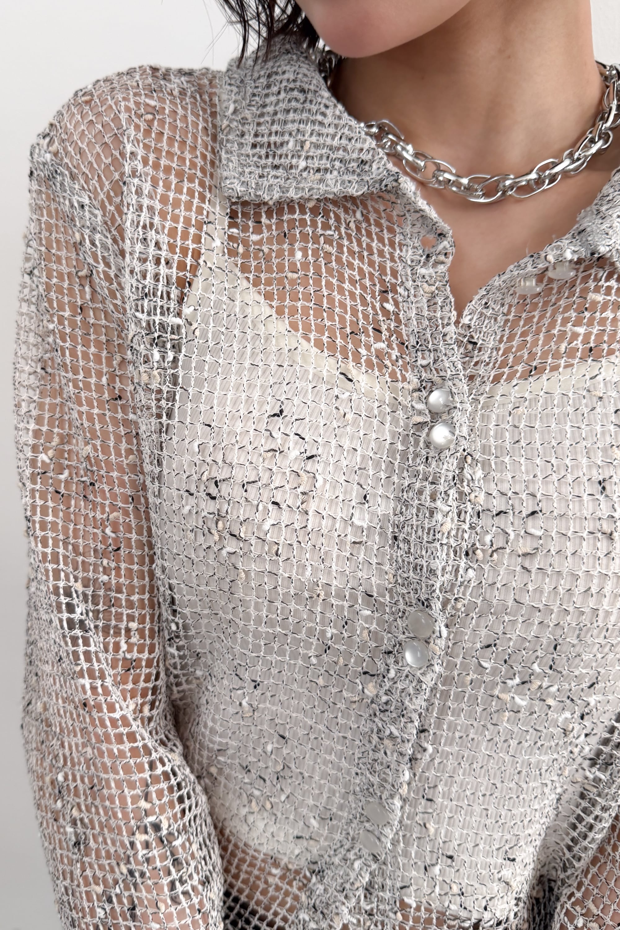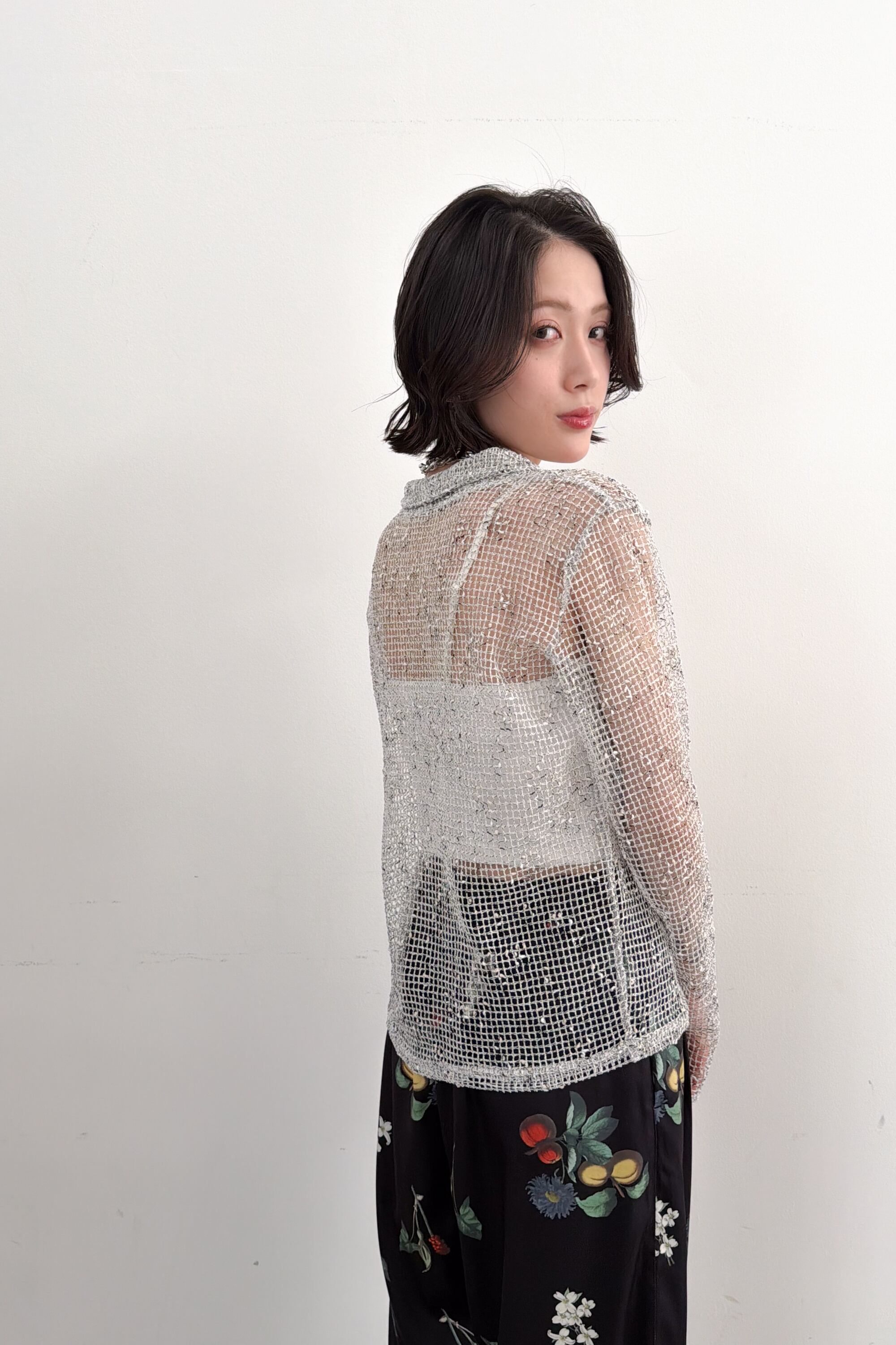 ざっくりとした透かし編みが目を惹く、襟付きデザインのメッシュトップス。程よい透け感で抜けをつくりながら、ポロライクなディテールが甘さを抑えて大人っぽい印象に仕上げてくれます。インナーとのレイヤードで表情が変わるので、タンクトップやキャミ合わせで着こなしの幅も広がる一枚。柄ボトムと合わせても重たく見えず、軽やかなスタイリングが完成します。