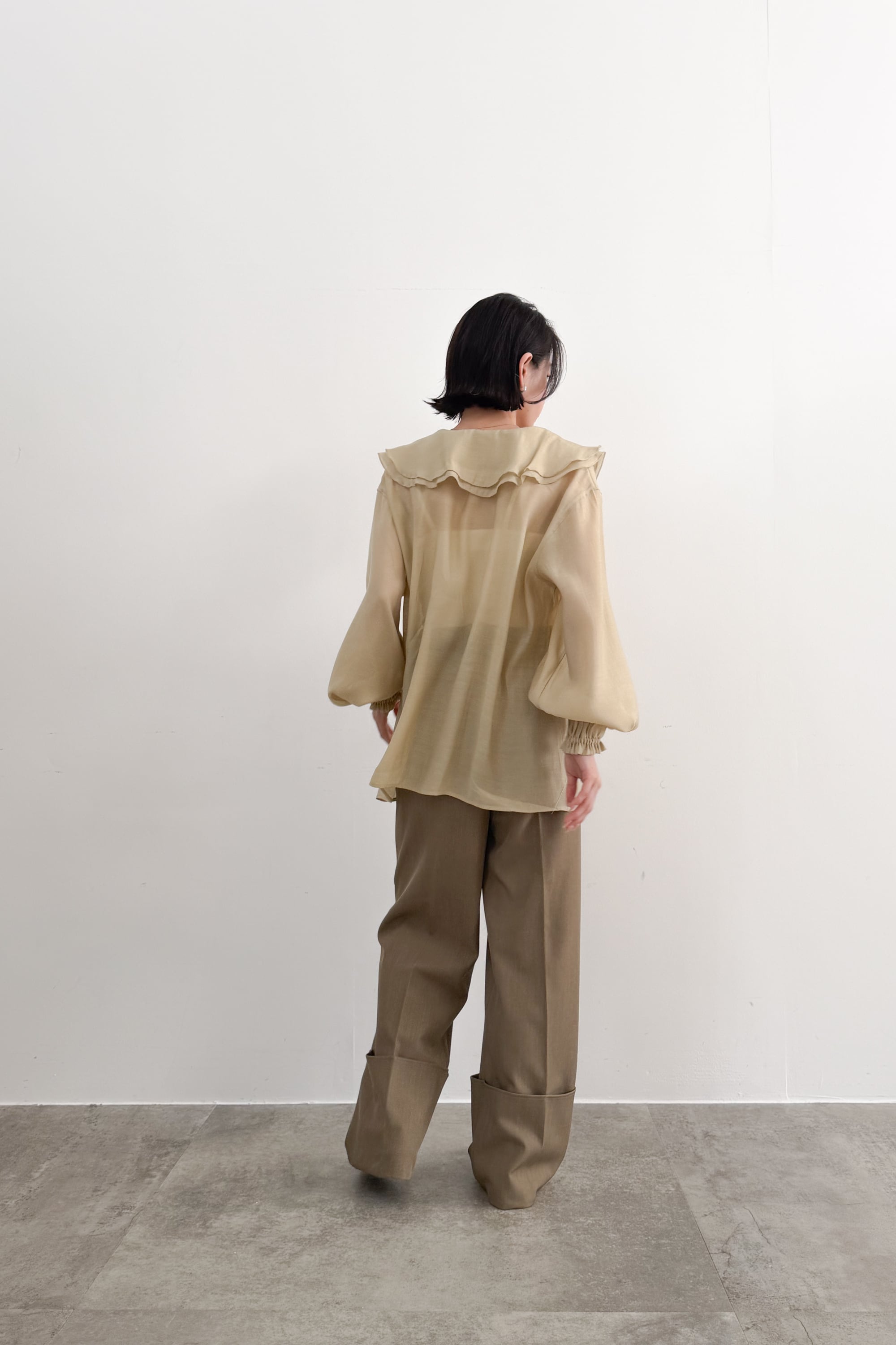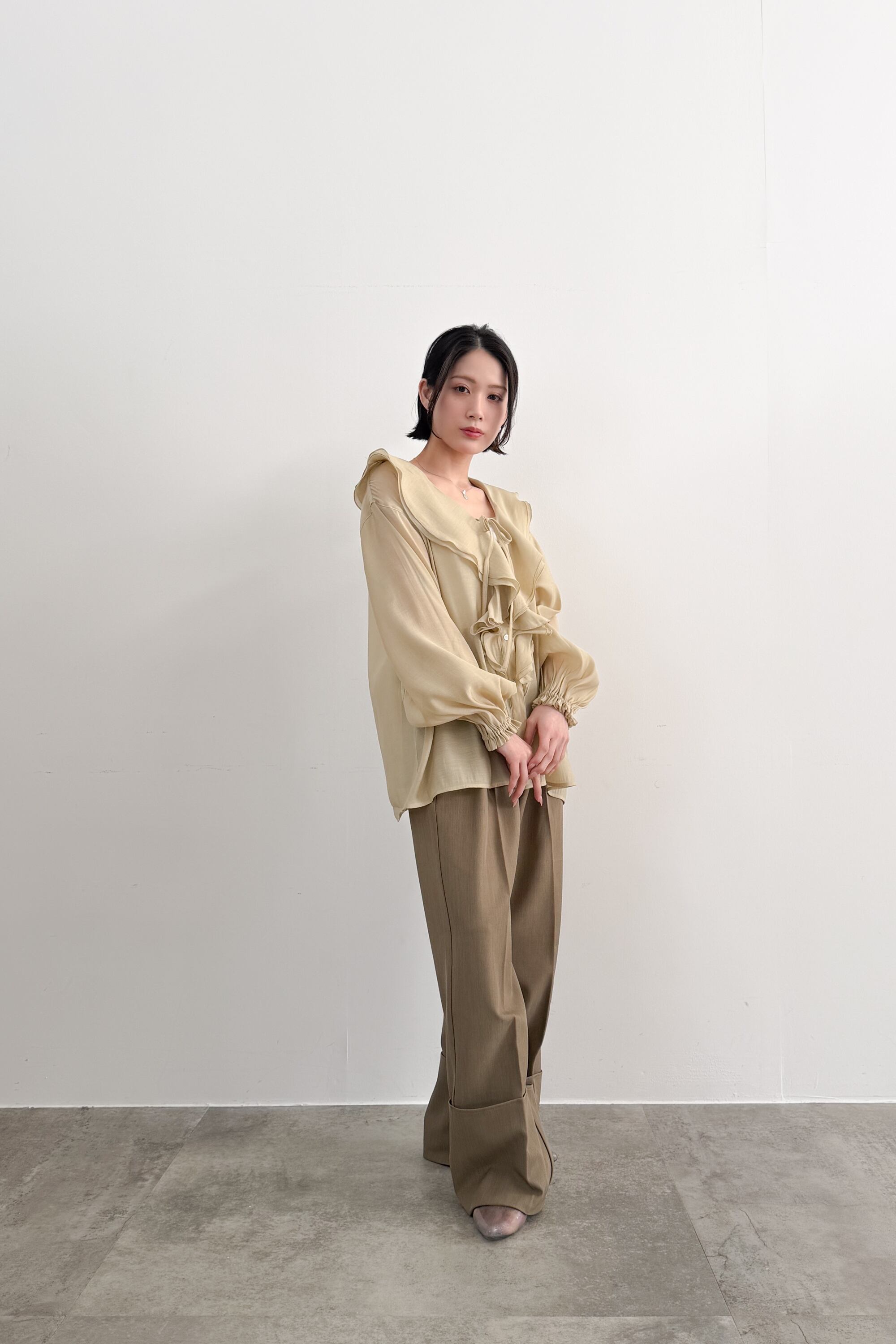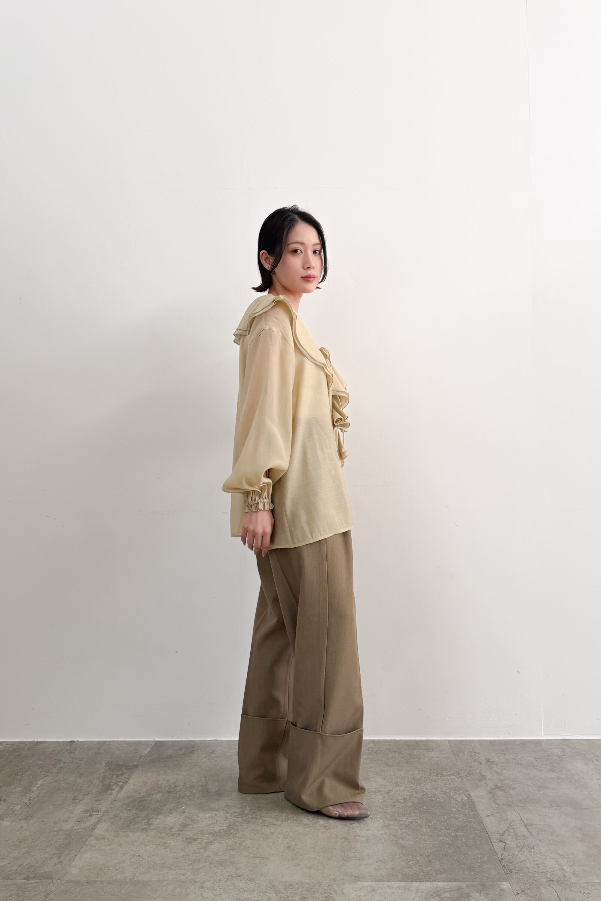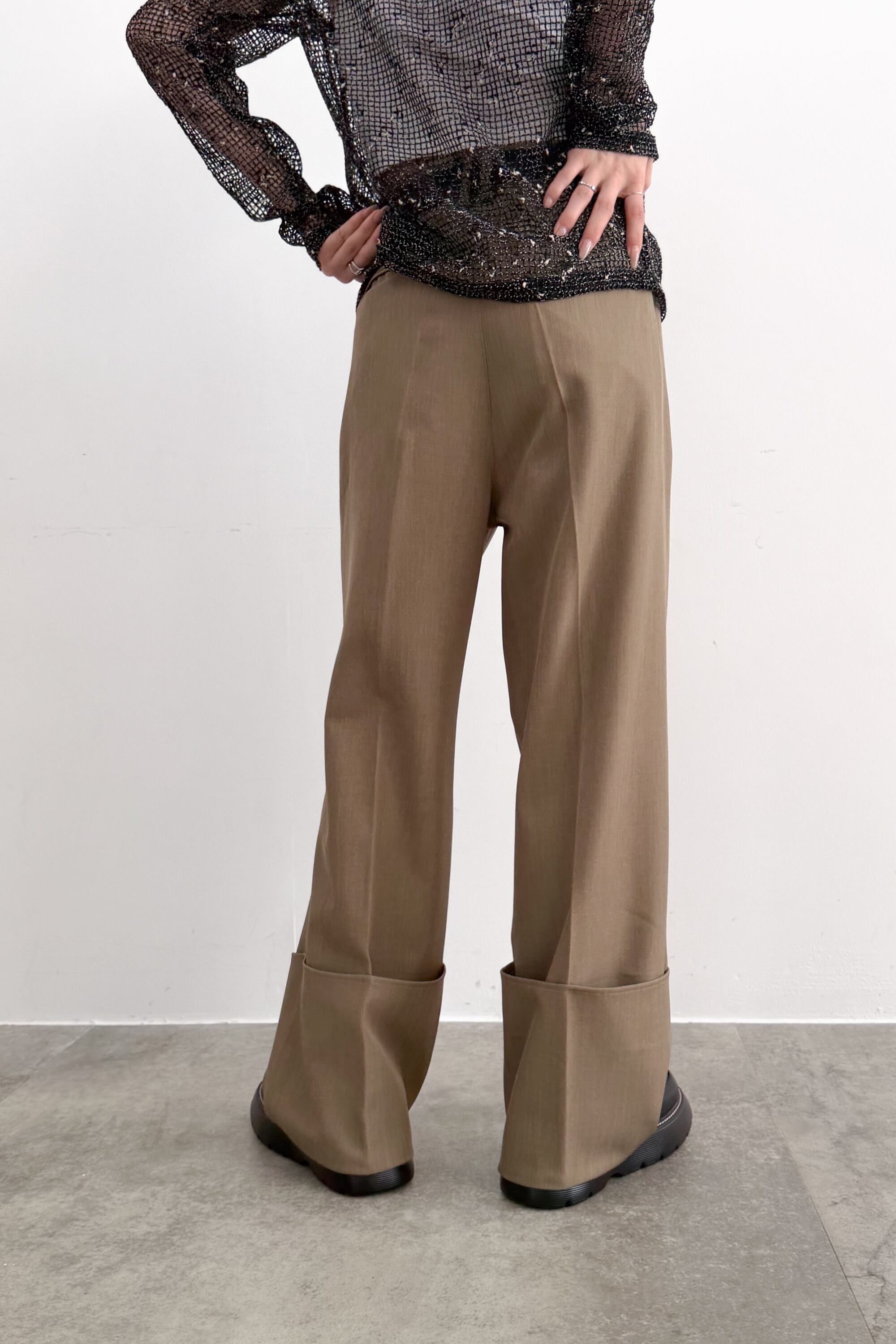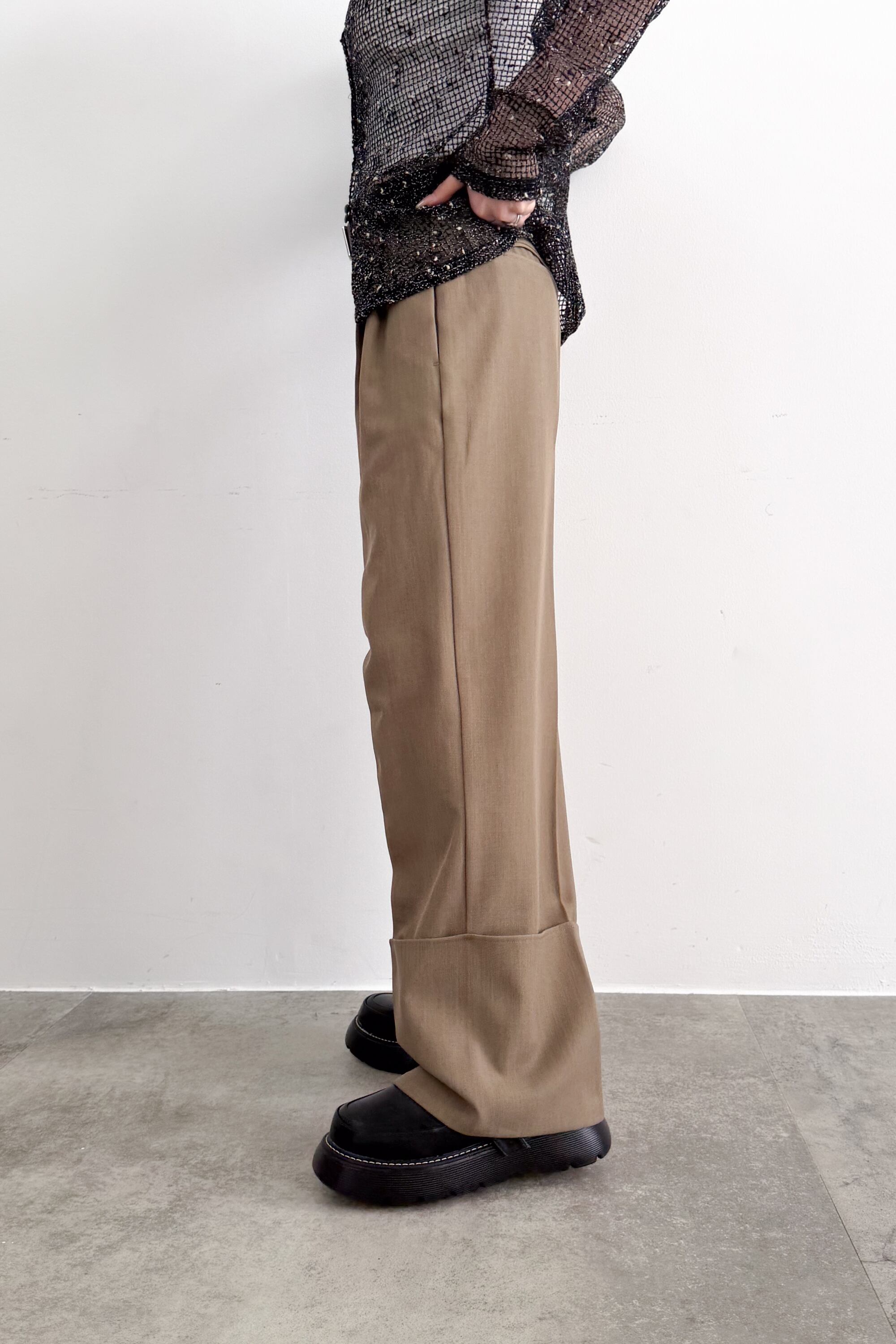 深めのタックからきれいに落ちるワイドシルエットが魅力の、ハンサムな印象のスラックスパンツ。裾の太め折り返しデザインがアクセントになり、シンプルなトップス合わせでもしっかり着映えする一本です。落ち着いたブラウンで合わせやすく、ブラックやシアー素材のトップスとも好相性。モードにもマニッシュにも振りやすく、シーズン問わず活躍する万能パンツです。