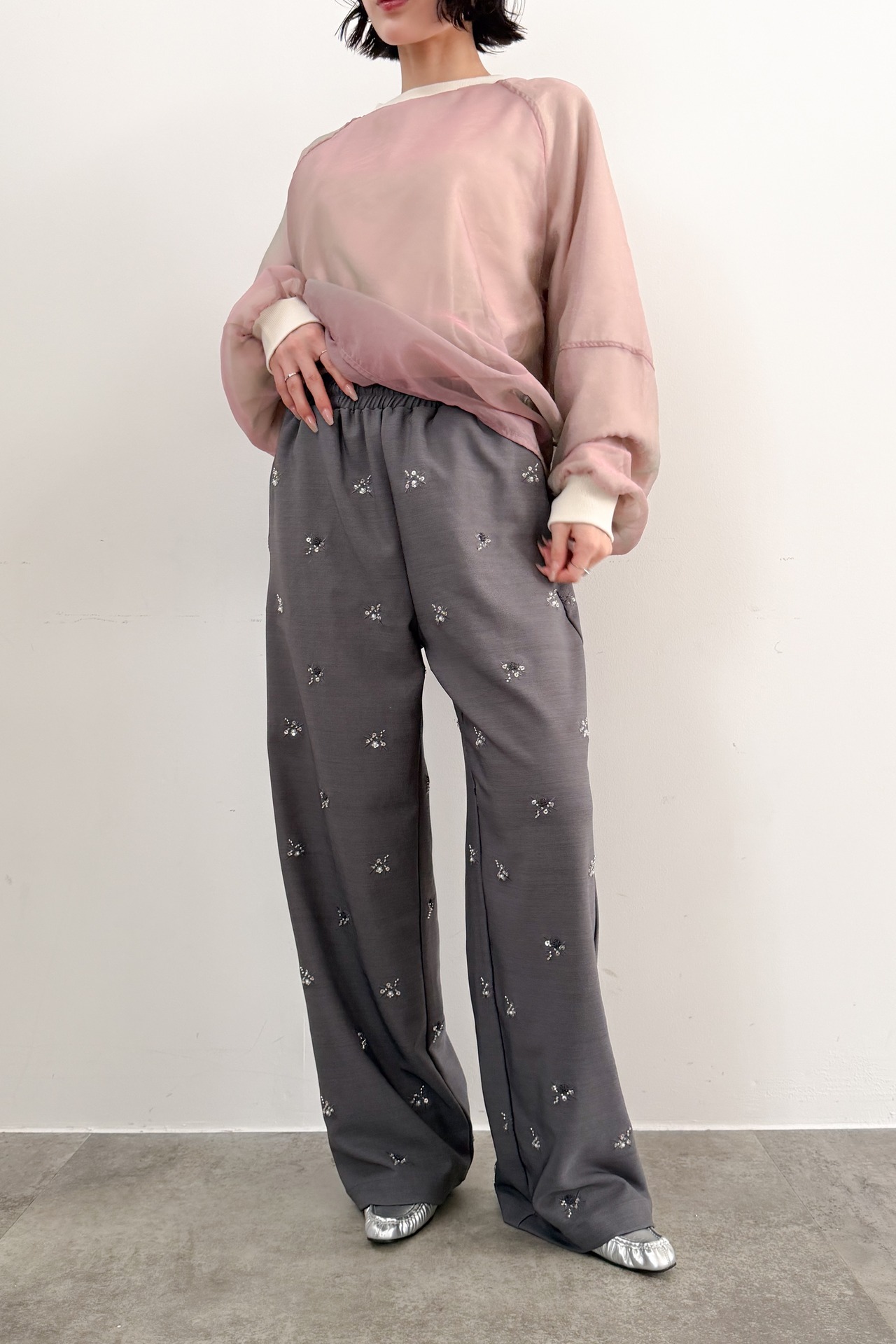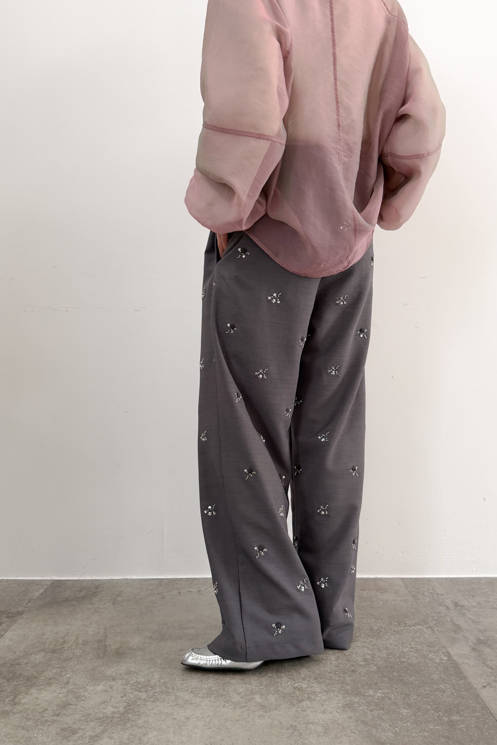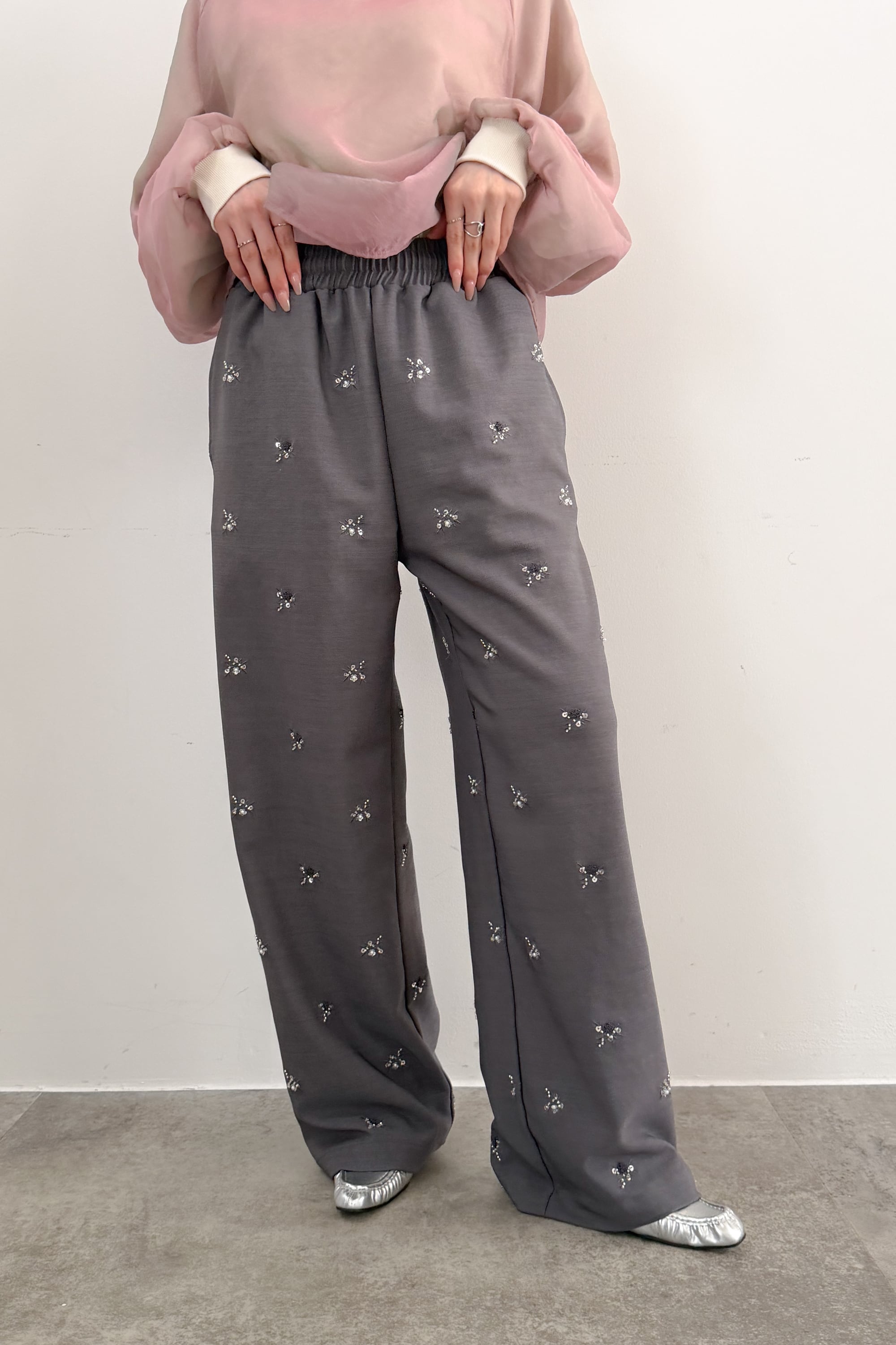 落ち着いたグレーベースに小粒のビジュー刺繍を散りばめた、さりげない華やかさが魅力のワイドパンツ。すっきり見えするワイドシルエットで、リラックス感がありながらも上品にまとまる一本です。主張しすぎないきらめきなので、シアートップスやニット、スウェットまで幅広く合わせやすく、デイリーにも取り入れやすいデザイン。シンプルなコーデにさっと合わせるだけで、着こなしに洒落感をプラスしてくれます。