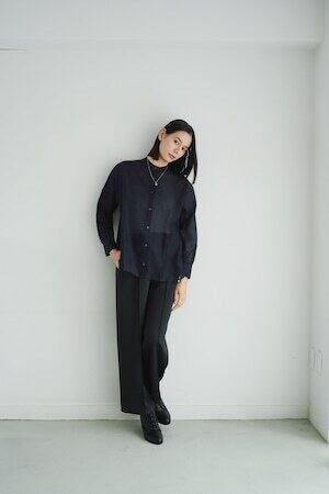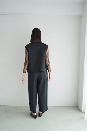 ロゼの「タイムレス・シンプル」を、セットアップで完成させるノワールの2ピース。シャープなスタンドネック×フロントジップのスリーブレスジャケットは、ミニマルな佇まいの中に、フラップポケットが程よい立体感を添えます。合わせるパンツは縦に落ちるラインが美しく、ワントーンでも間延びしない端正なバランスに。インナーはシアートップスで抜けを出したり、タンクで潔くまとめたりと、気分で表情チェンジ。フラットシューズで肩の力を抜けば「ロゼ・ウィークエンド」らしい洗練カジュアルに、ヒールや小物を足せばオンシーンにも。セットでも単品でも着回せる、長く頼れる一着です。