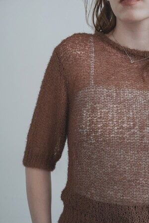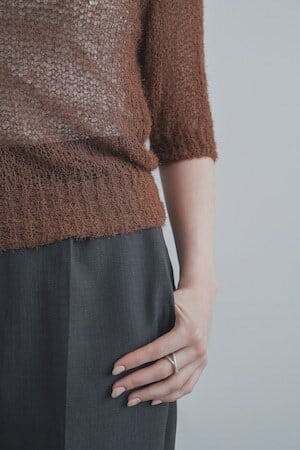 •シアーニット素材:軽やかな透け感が特徴の、繊細な編地で仕立てた5分袖ニット。涼しげで女性らしいムードを演出します。