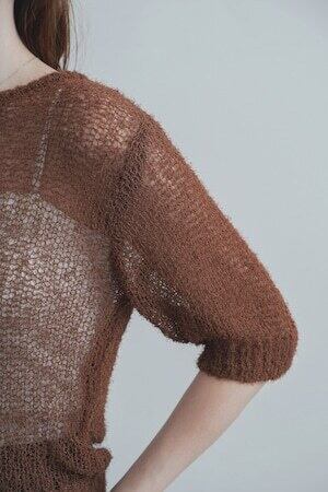 •編み模様の表情:前身頃は密に編み立て、背中や袖はよりシアーな編地に切り替えることで、前後で表情の変化が楽しめる一枚。